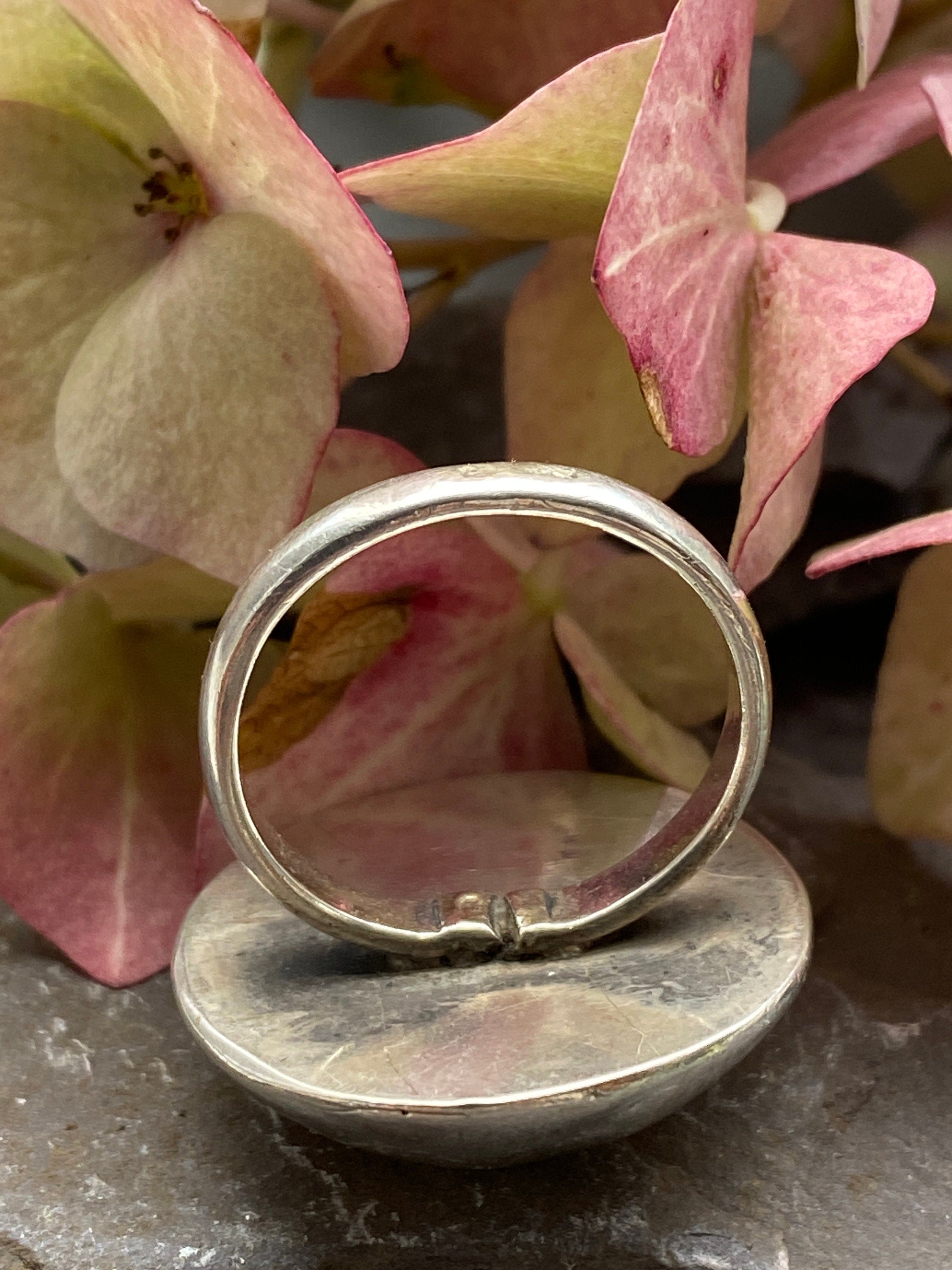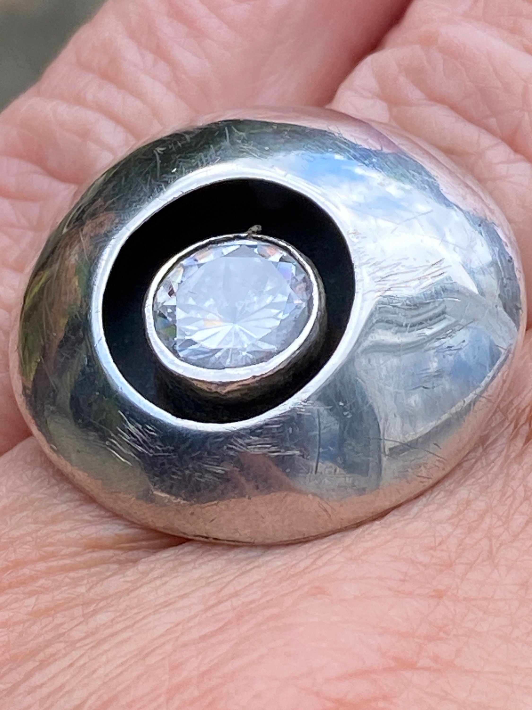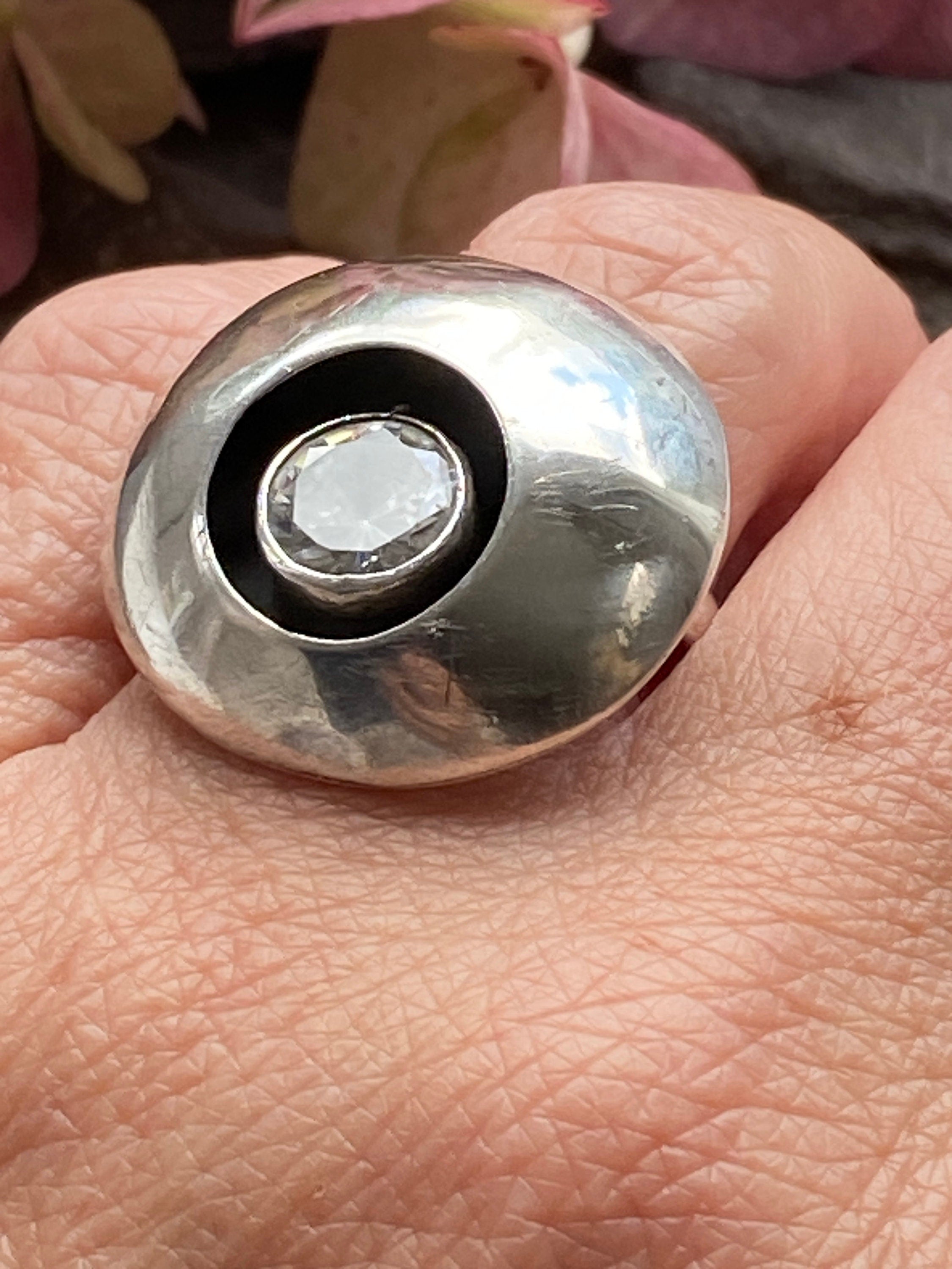 A striking ring in sterling silver set with a large Cubic Zirconia in a hollow domed setting.