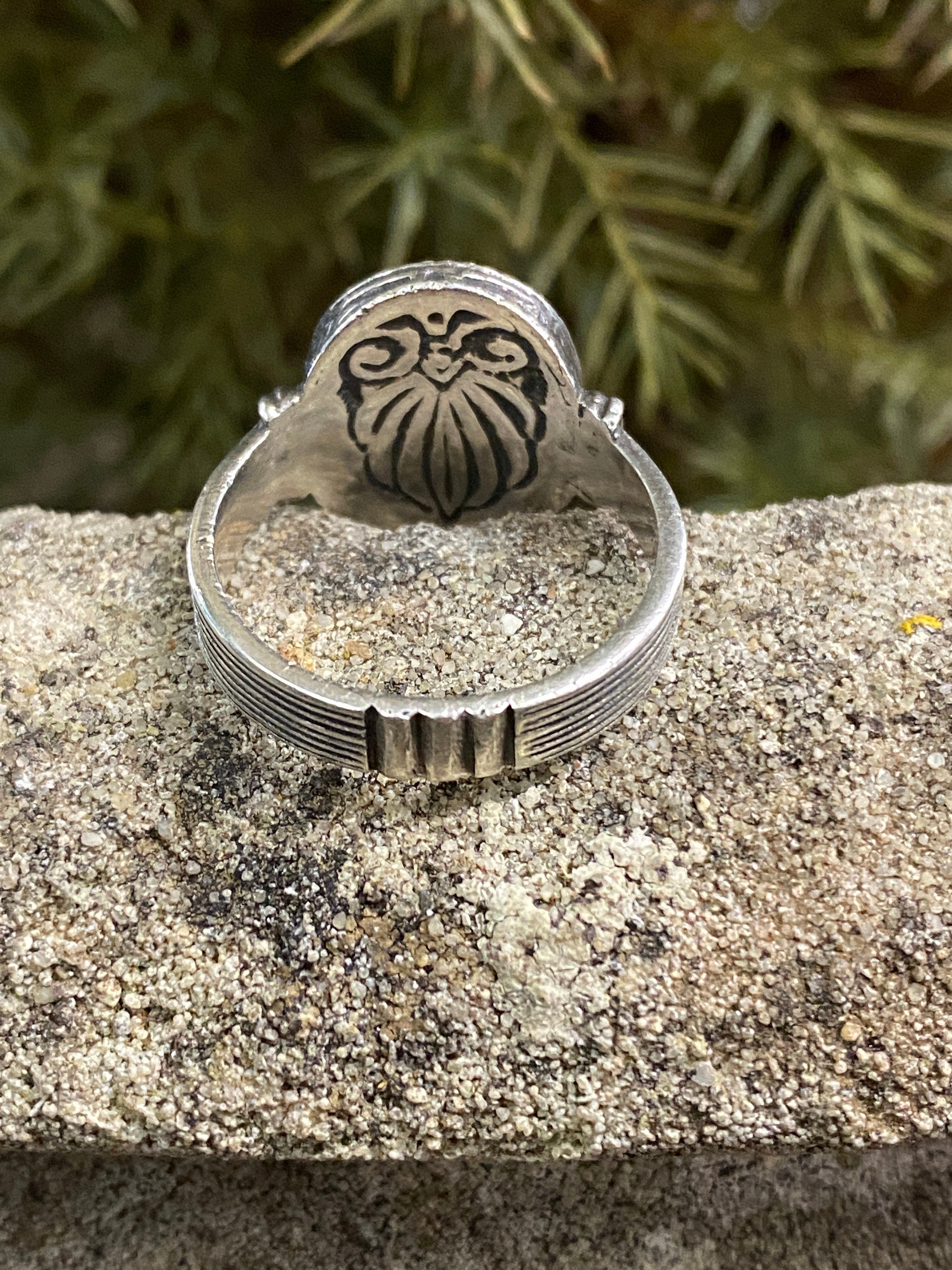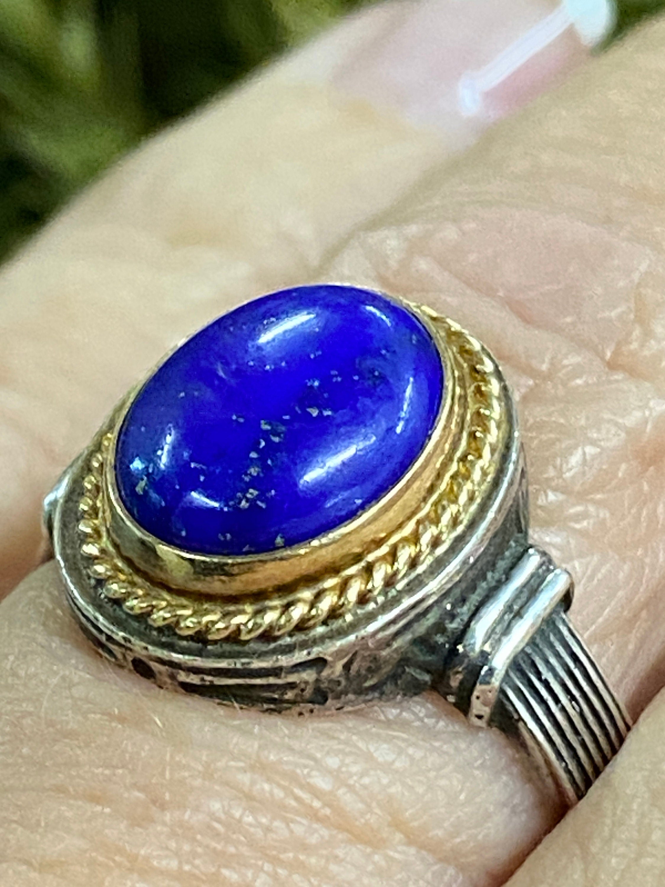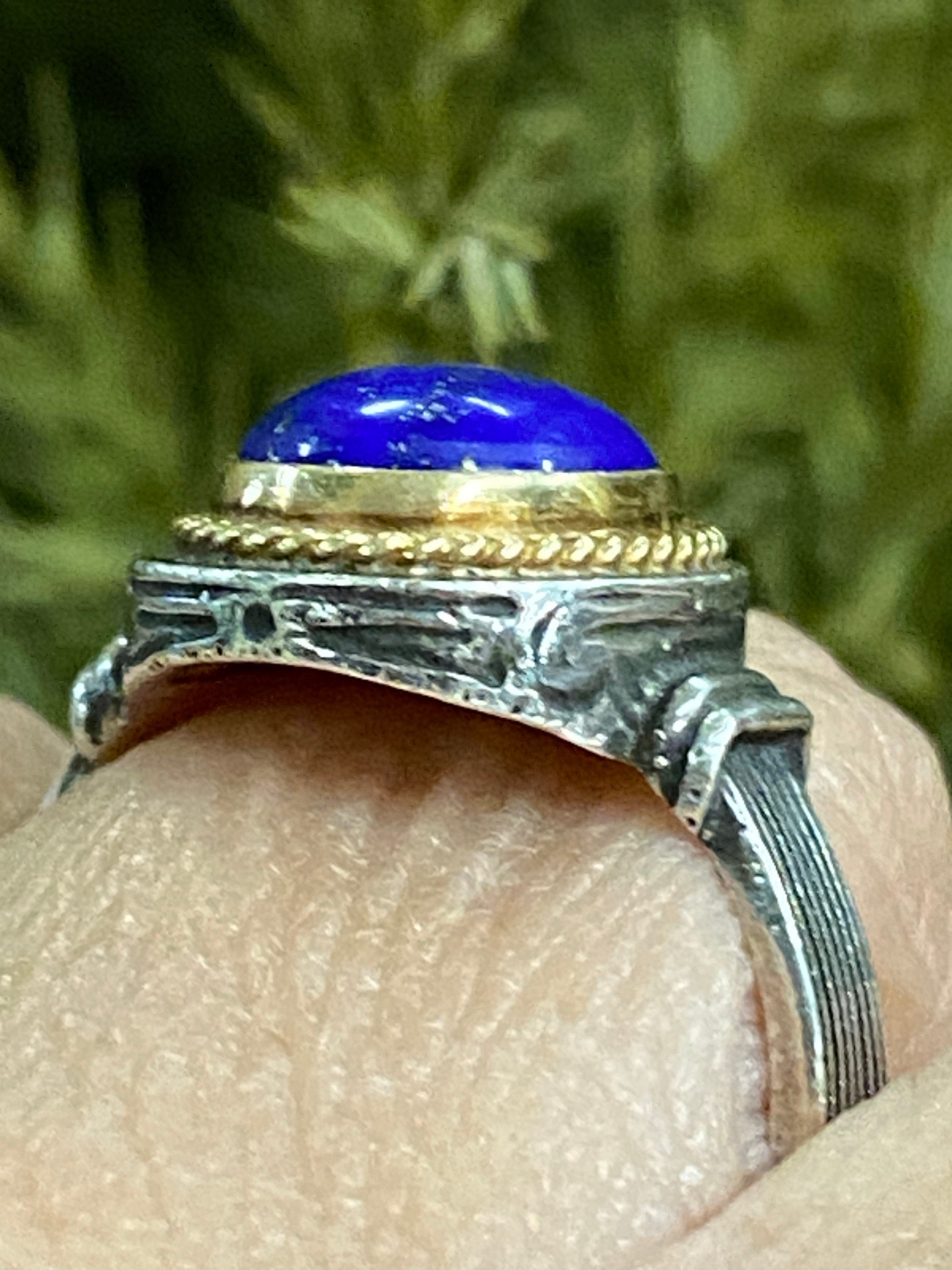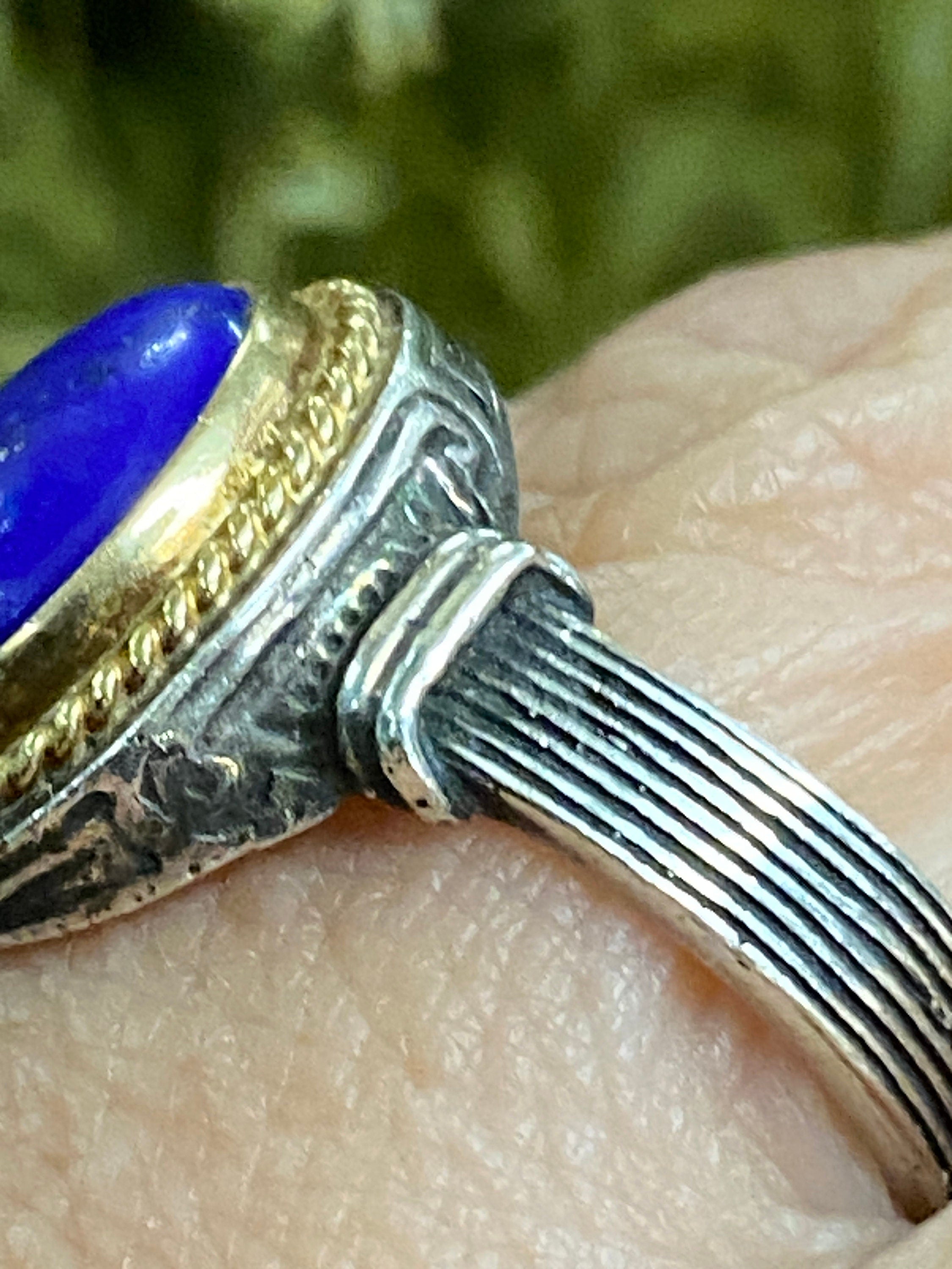 A sterling silver ring set with a natural Lapis Lazuli in a 22ct gold border with rope detail.