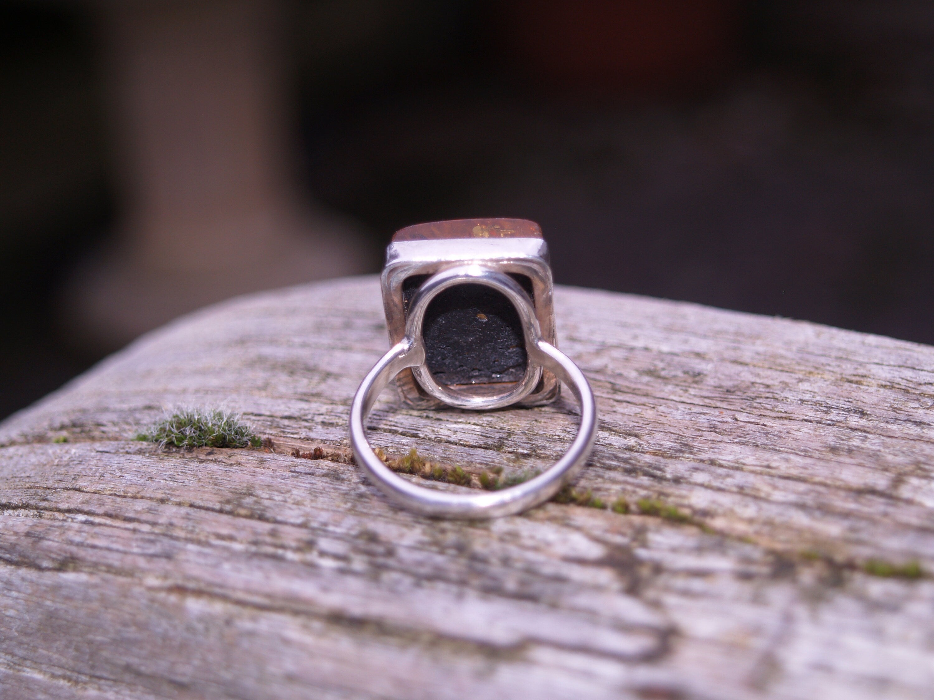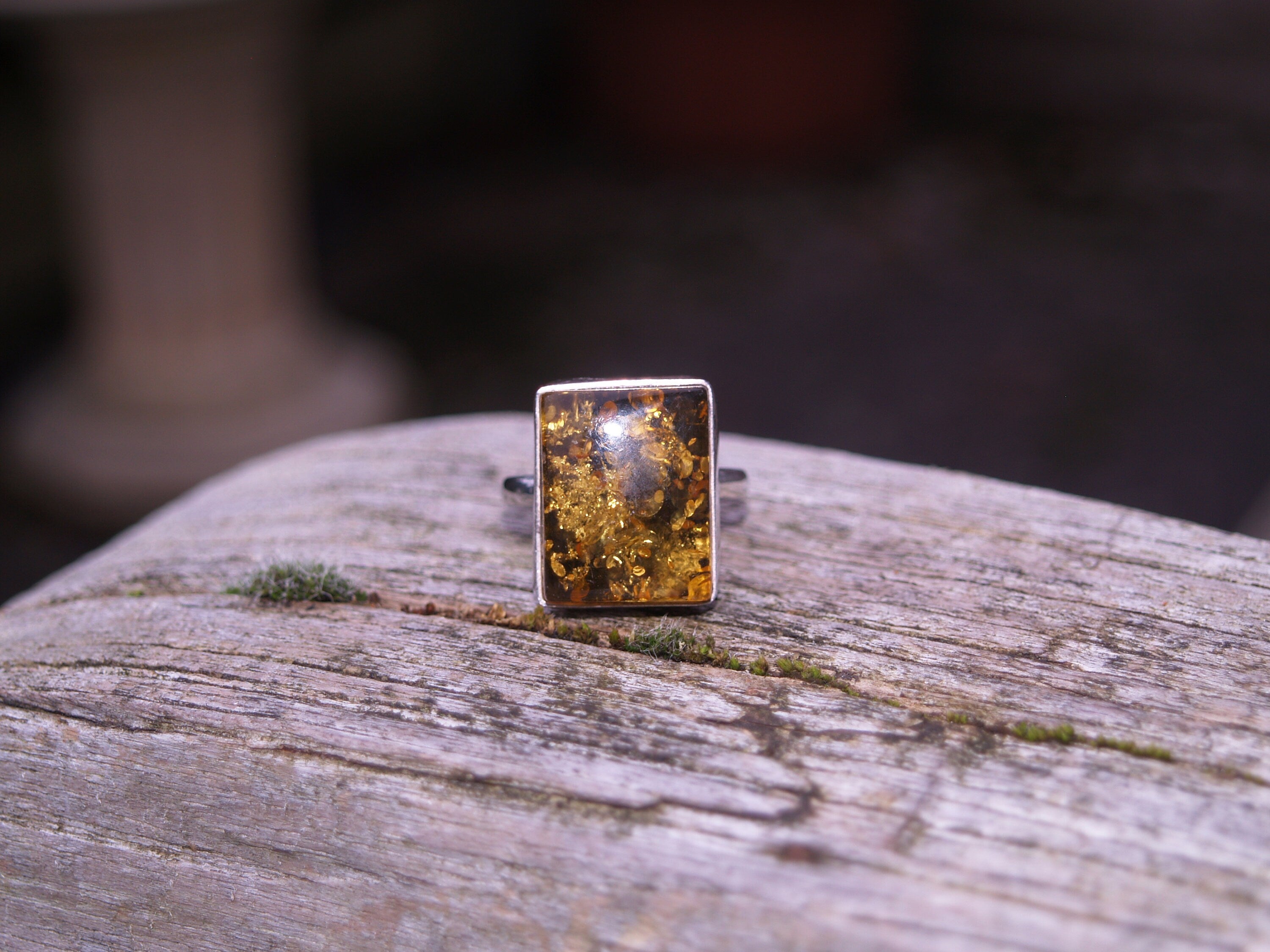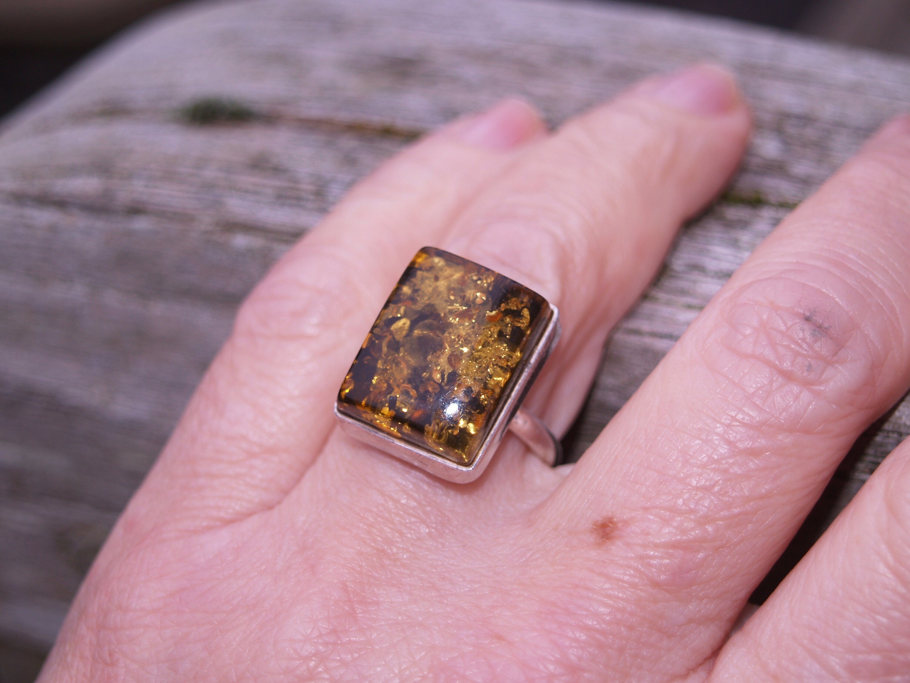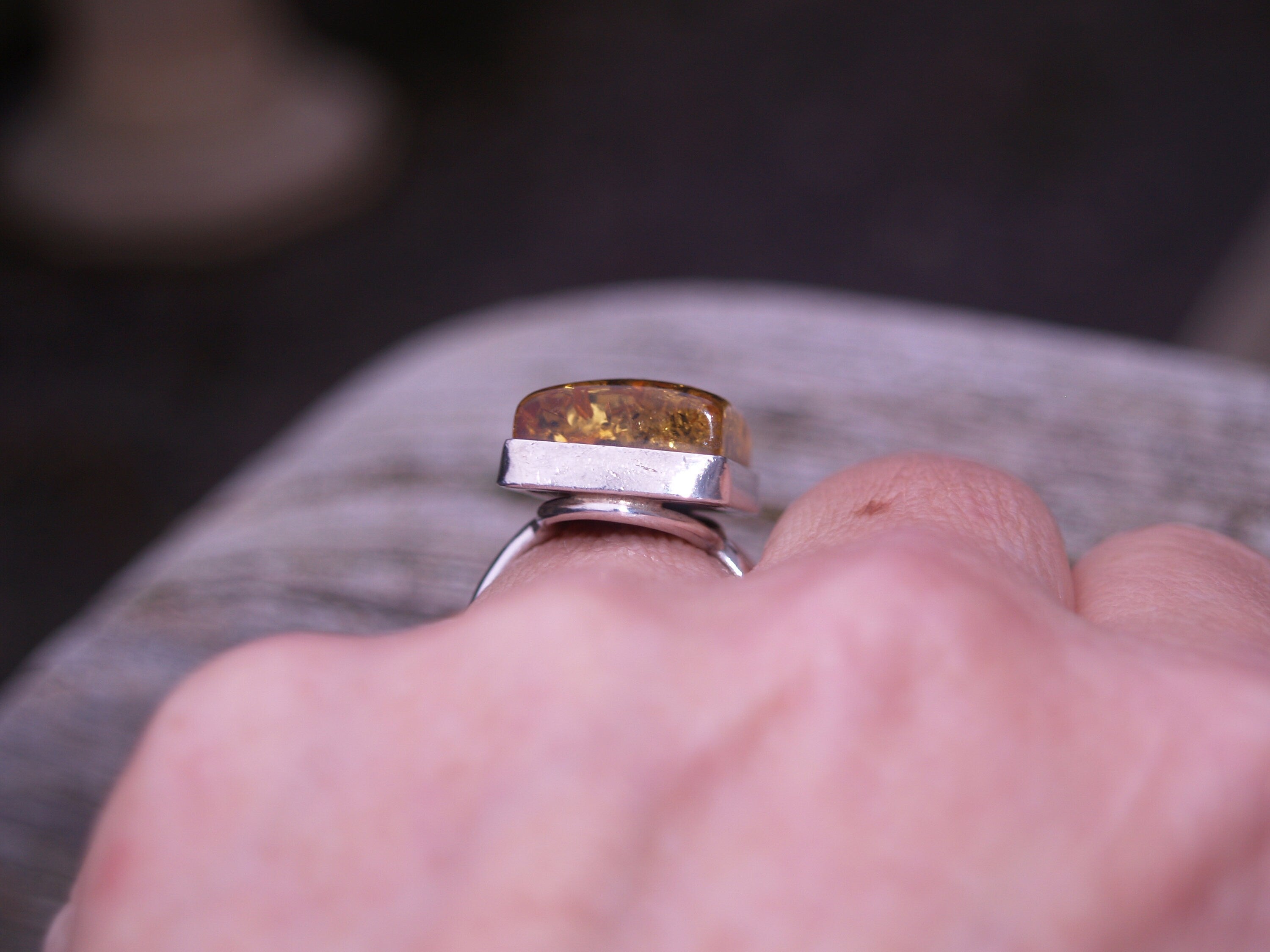 A large Amber ring in warm honey colours set in Sterling Silver.