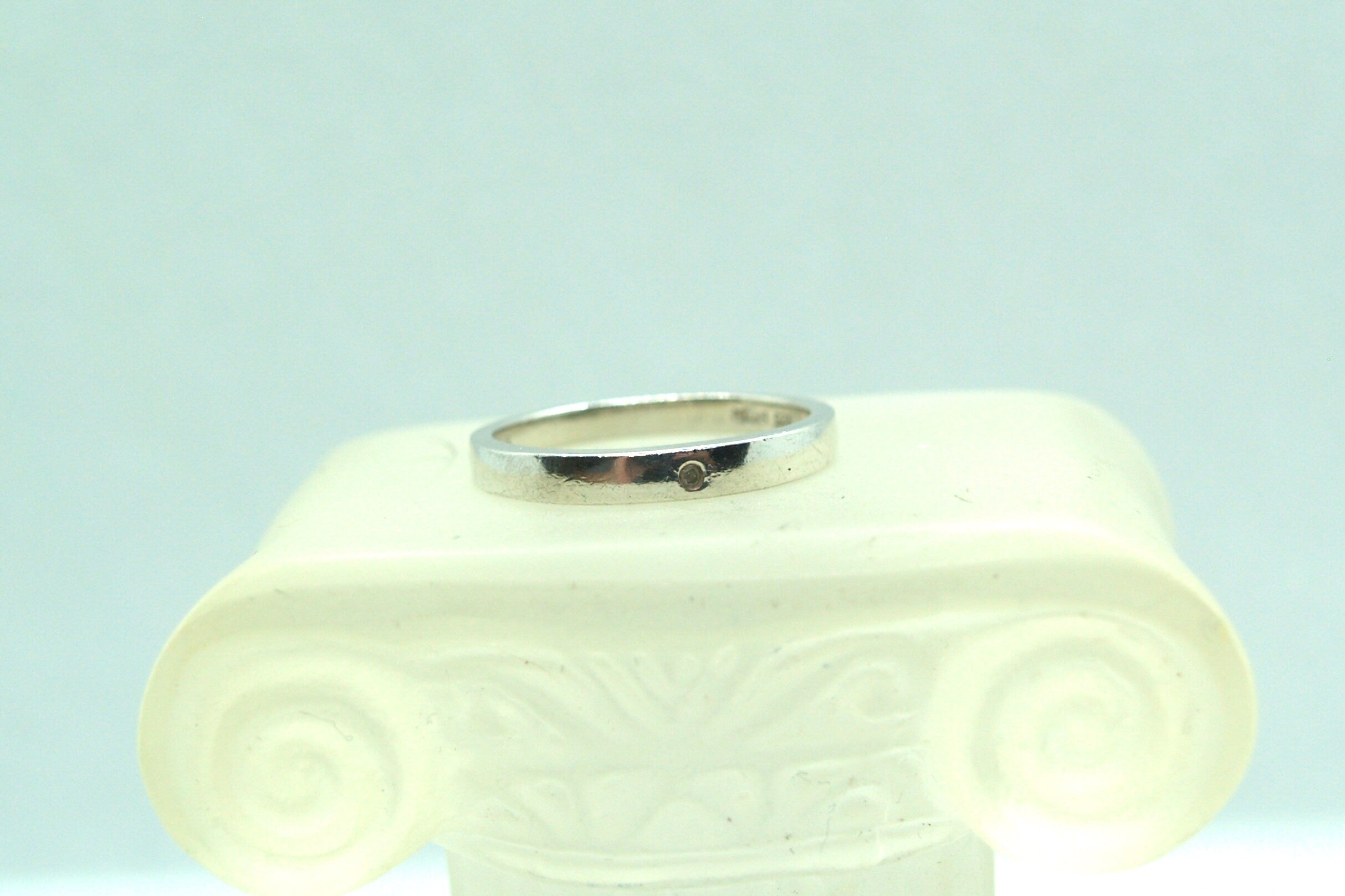 A stylish sterling silver stackable band ring set with a single Diamond.