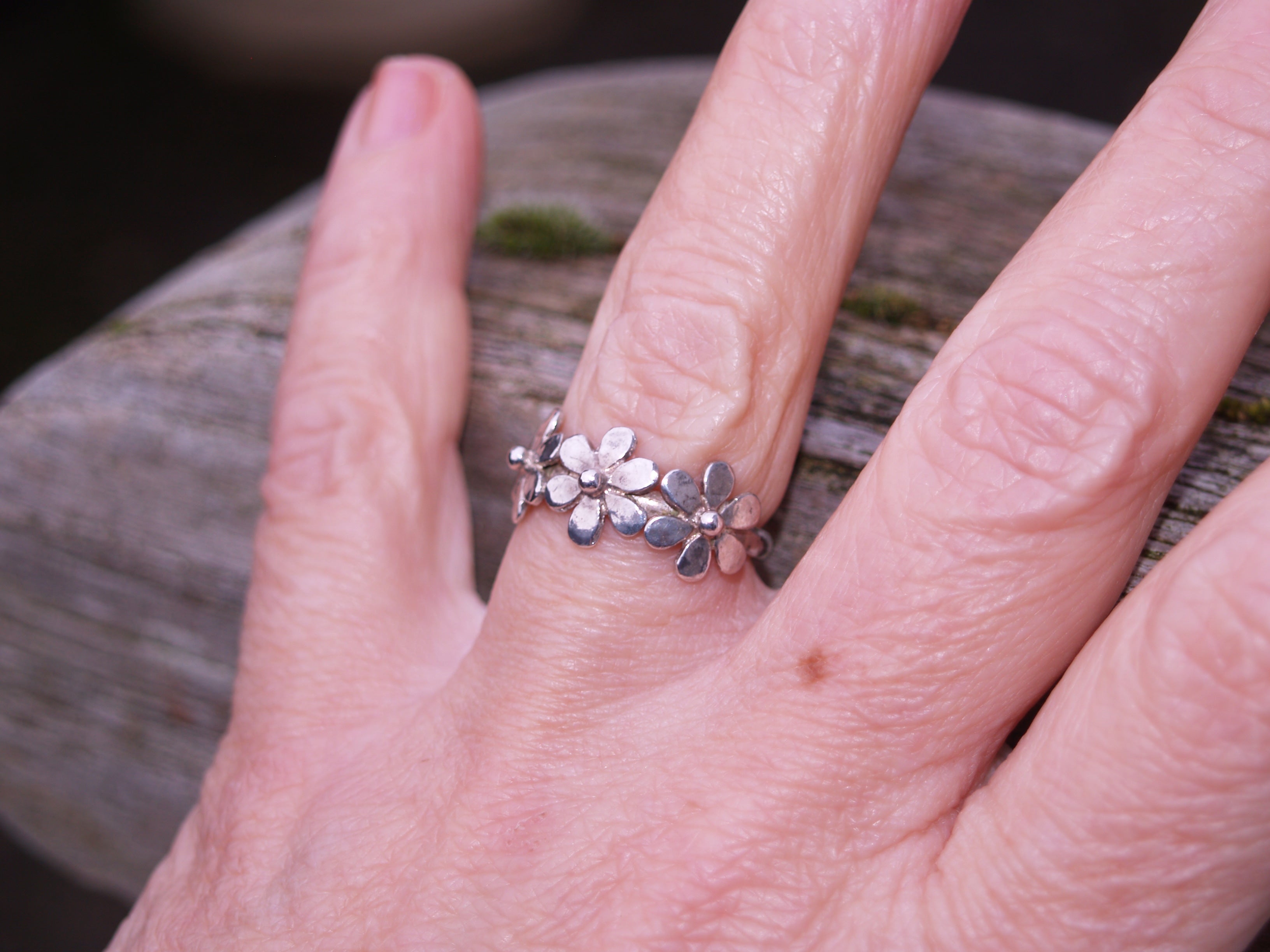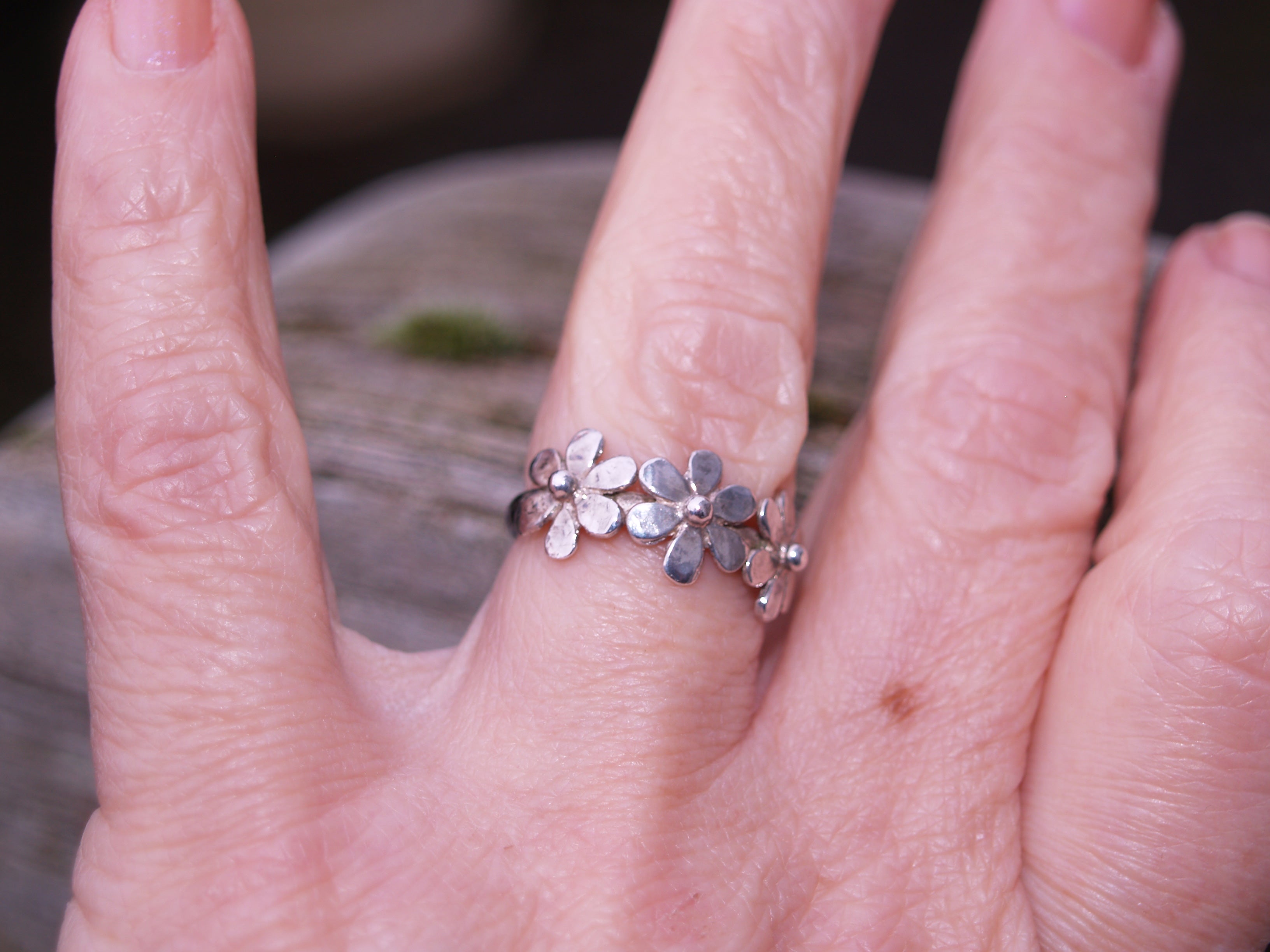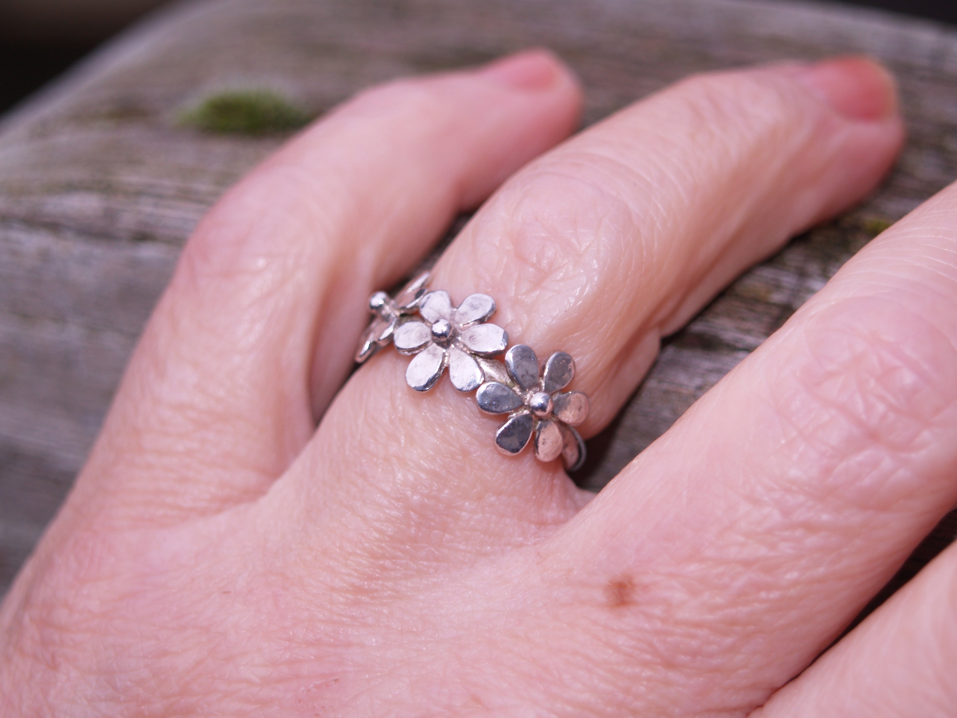 A super cute sterling silver ring designed as a row of three Daisy's.
