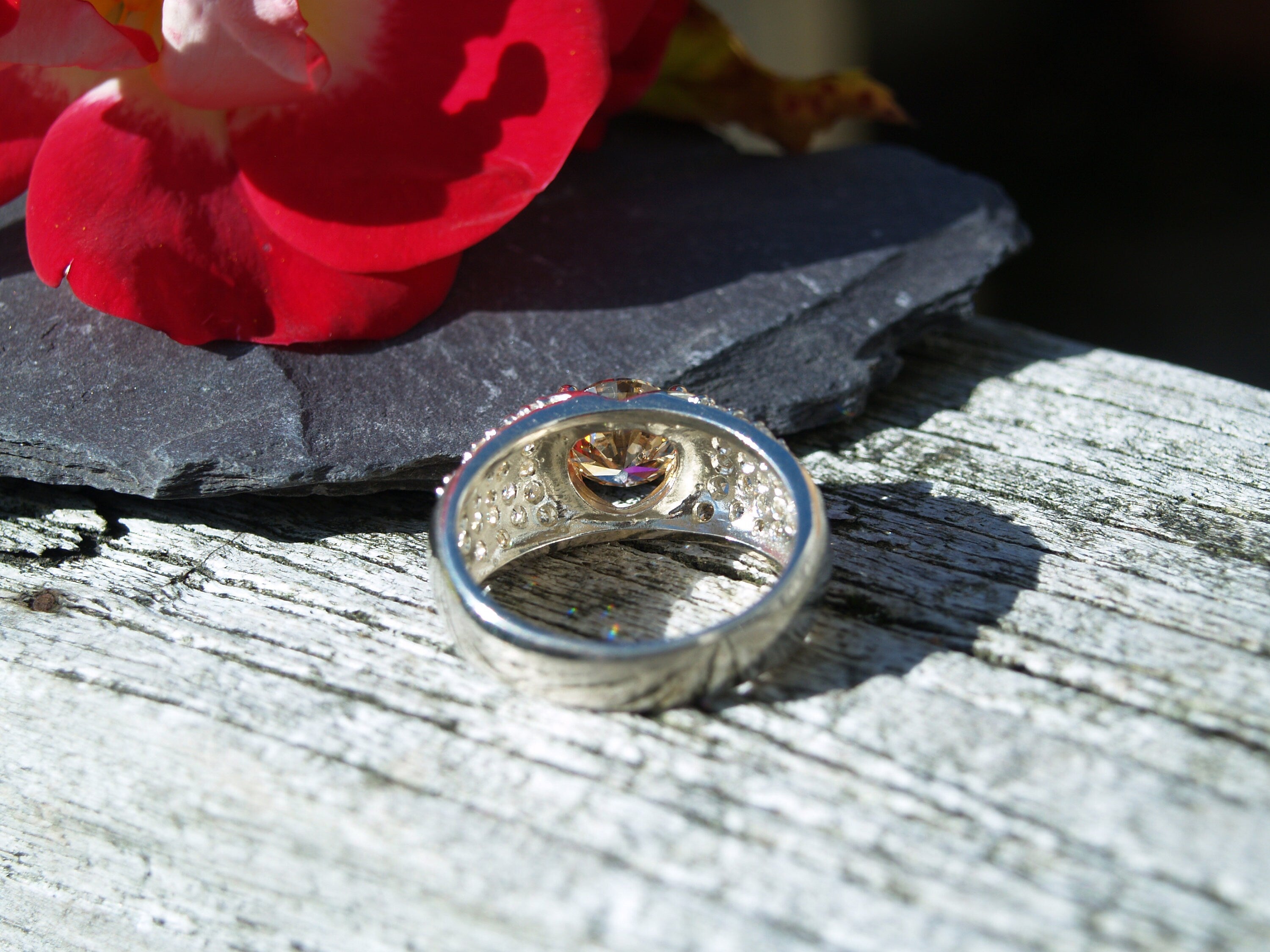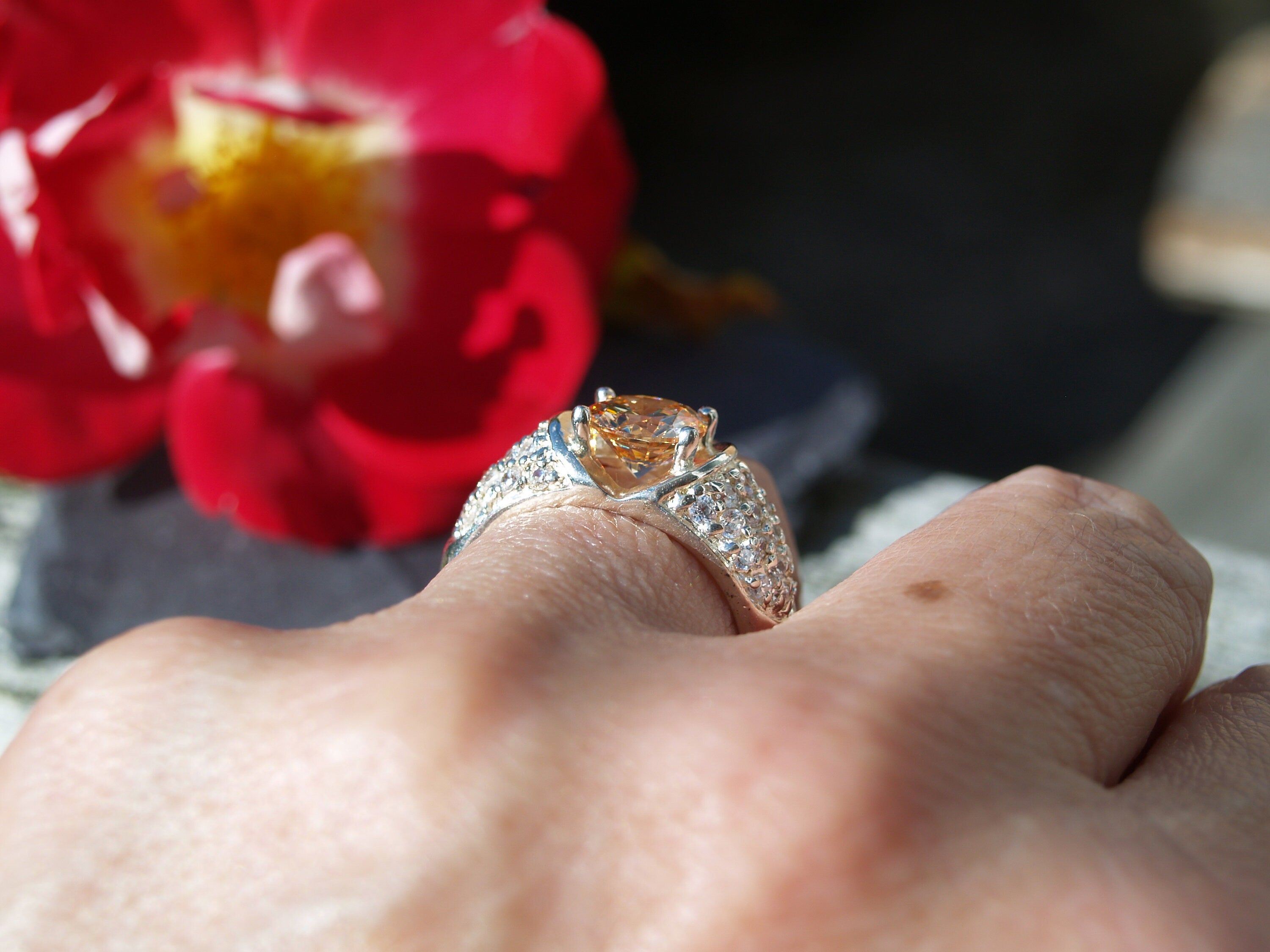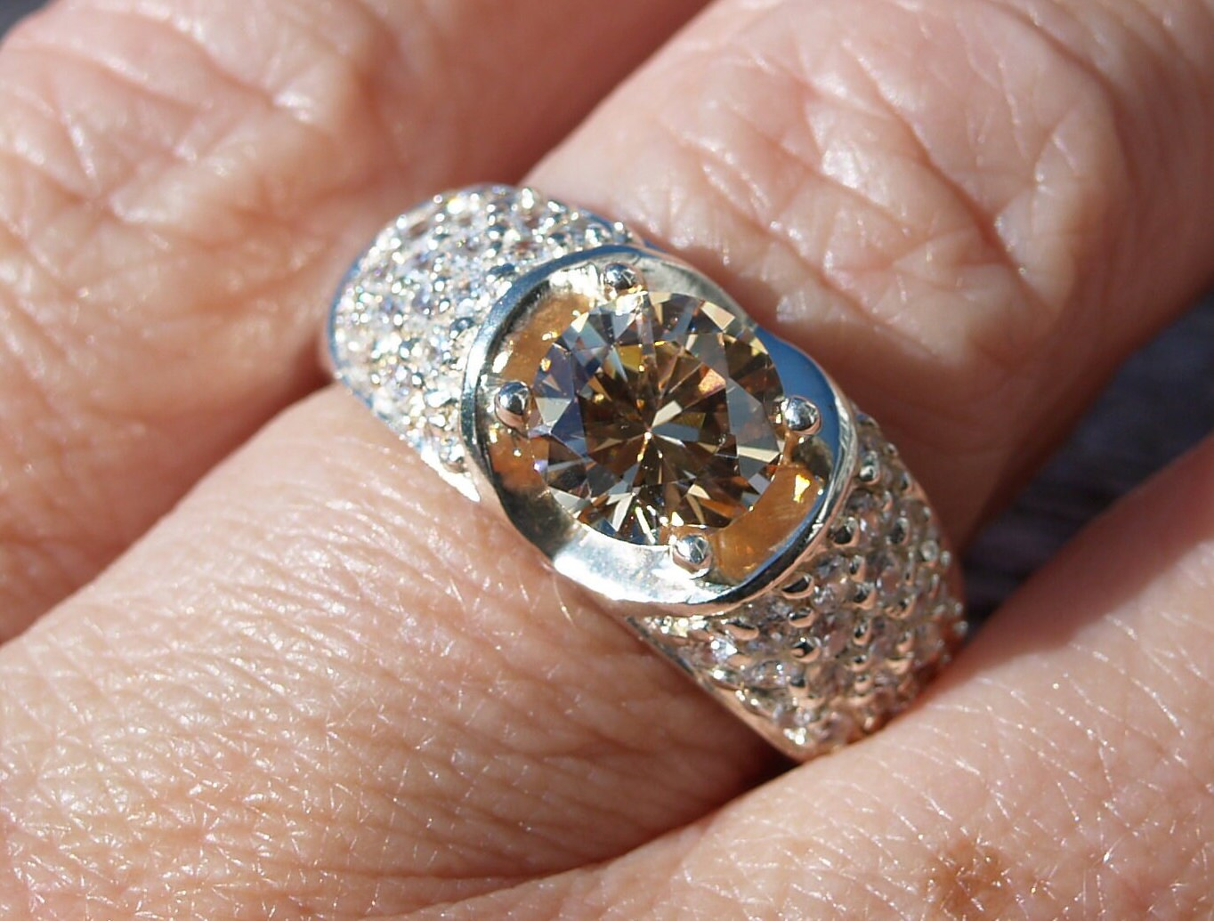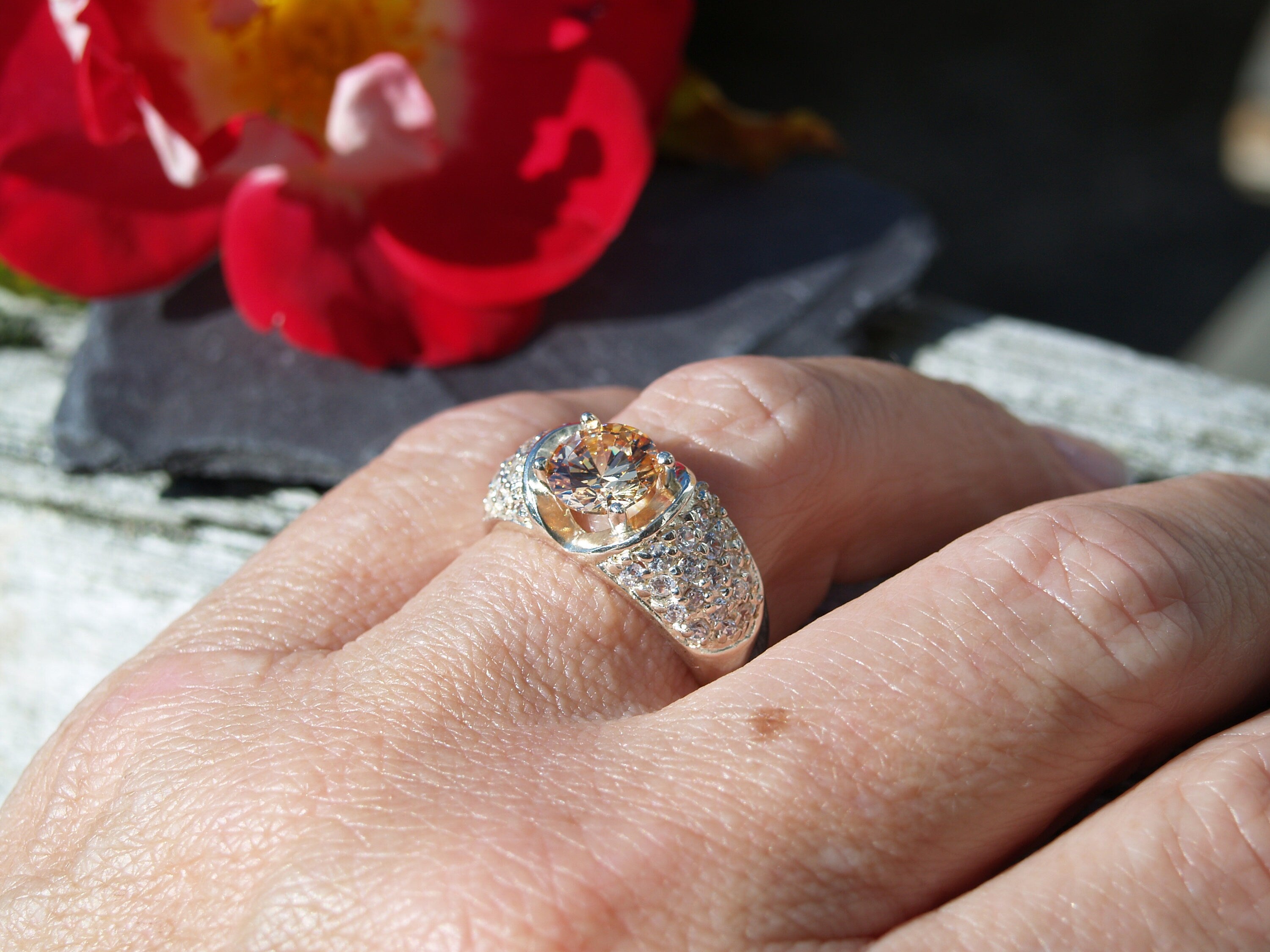 A stunning statement ring in sterling silver set with a central champagne coloured Cubic Zirconia with white Cubic Zirconia shoulders.