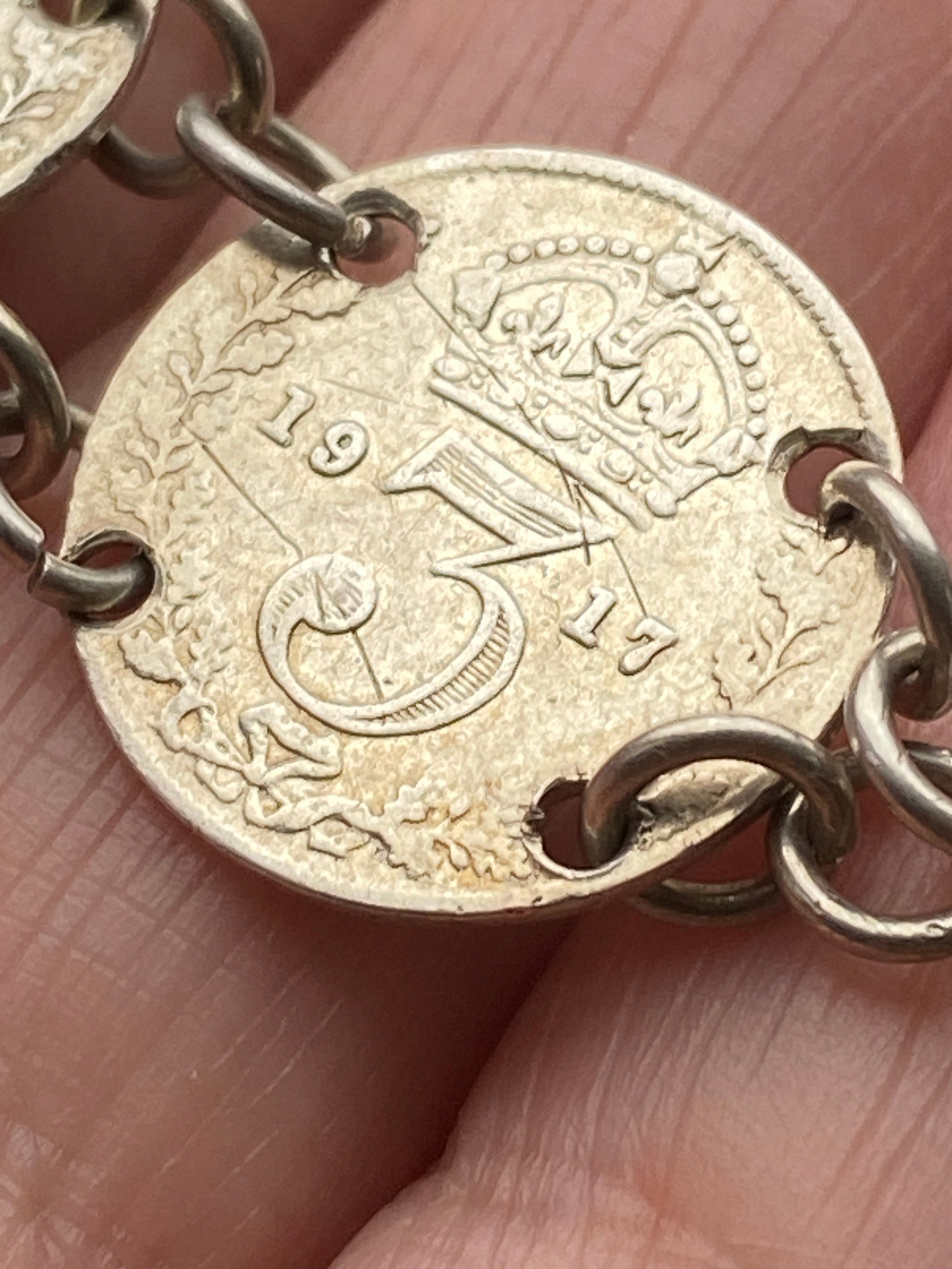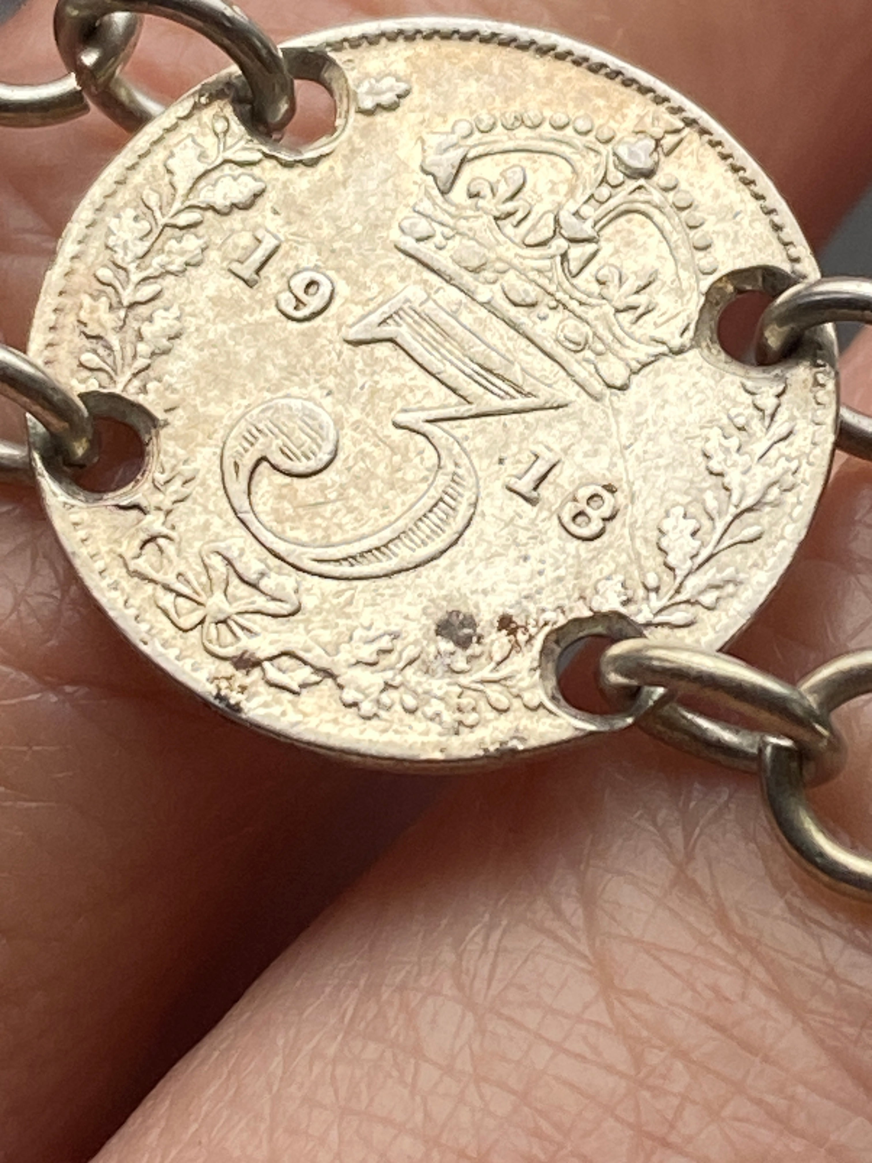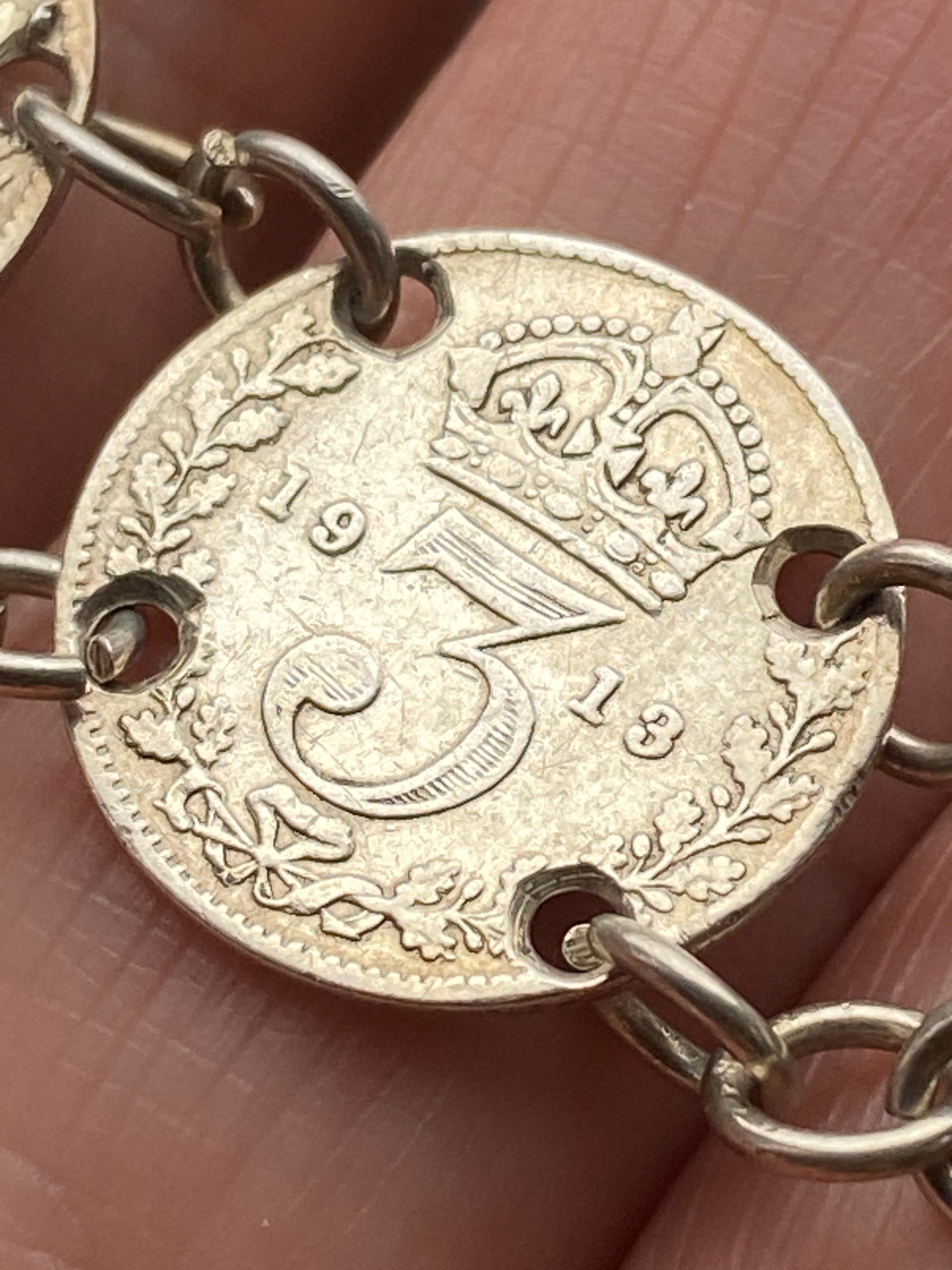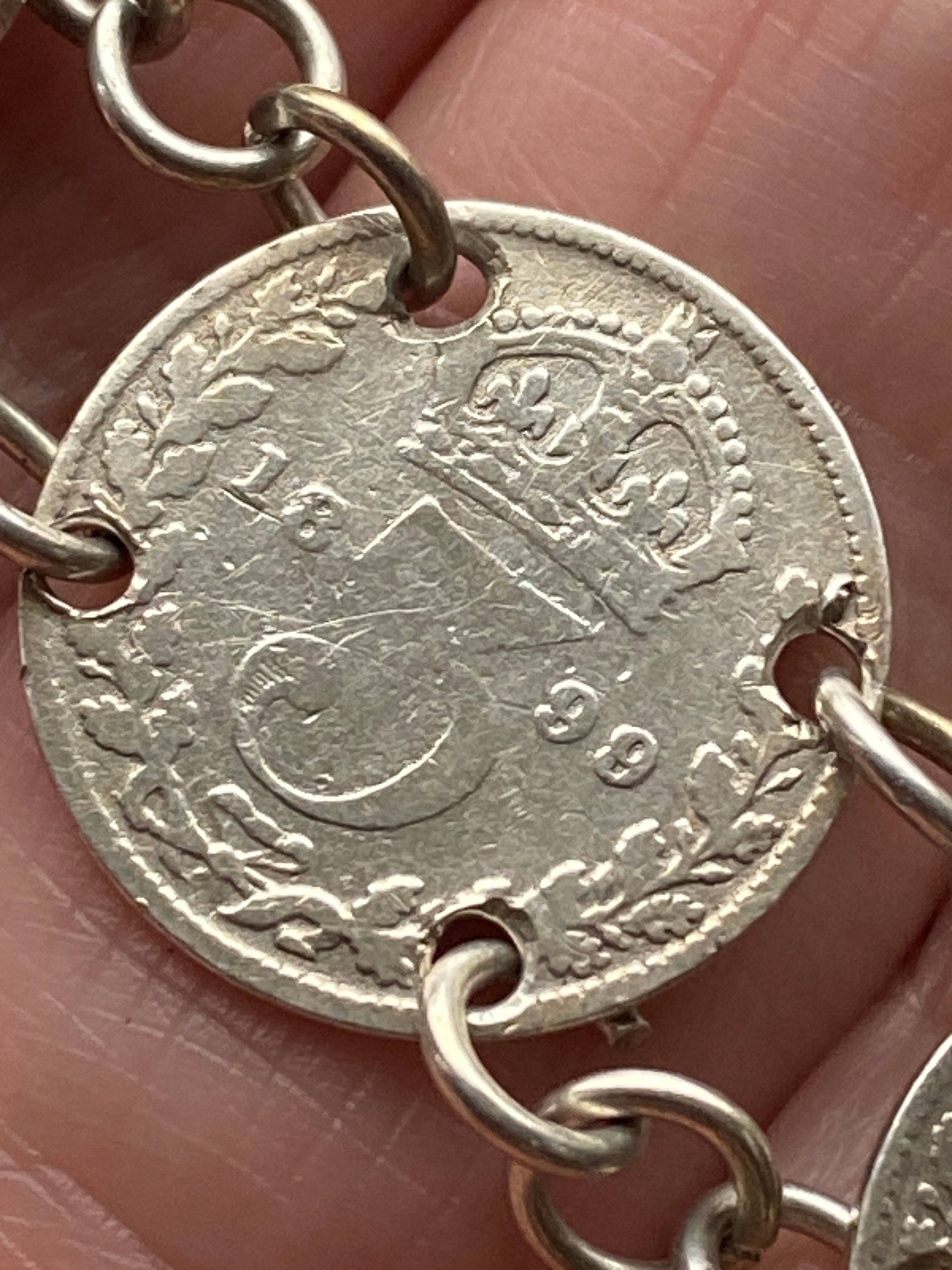An antique three penny coin bracelet with sterling silver fittings