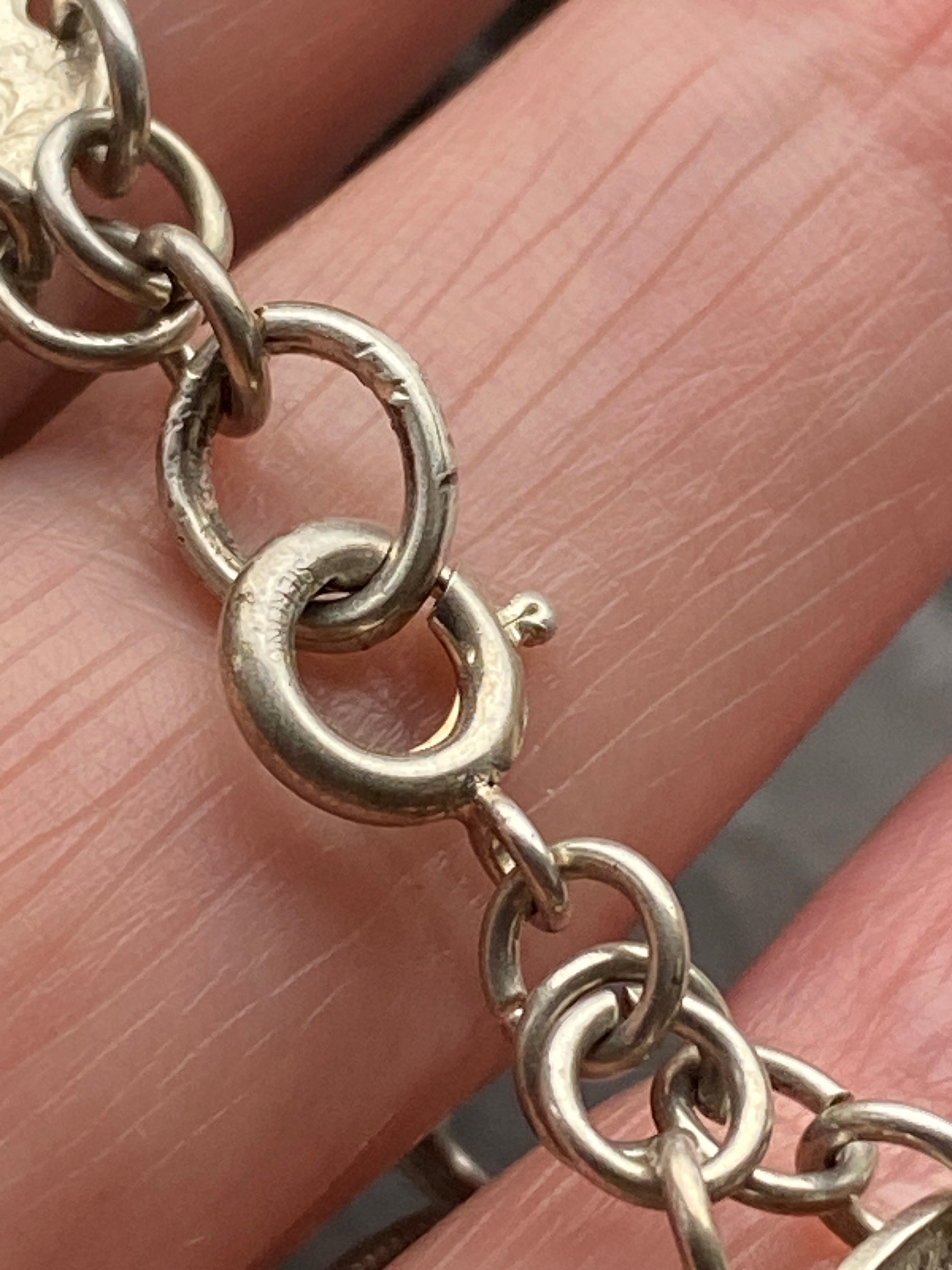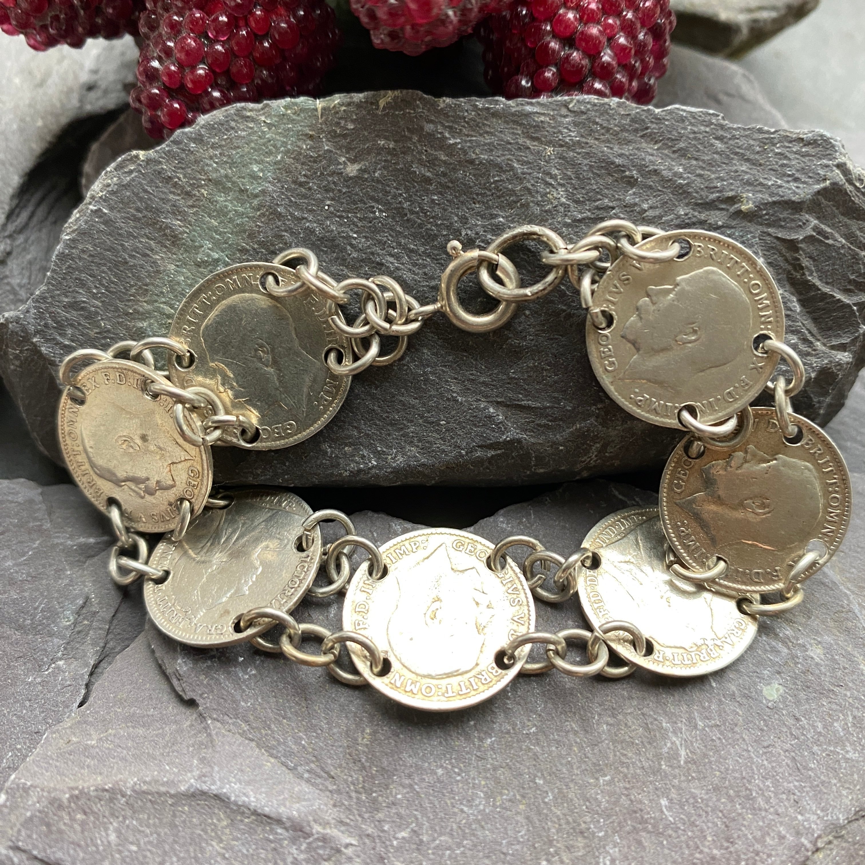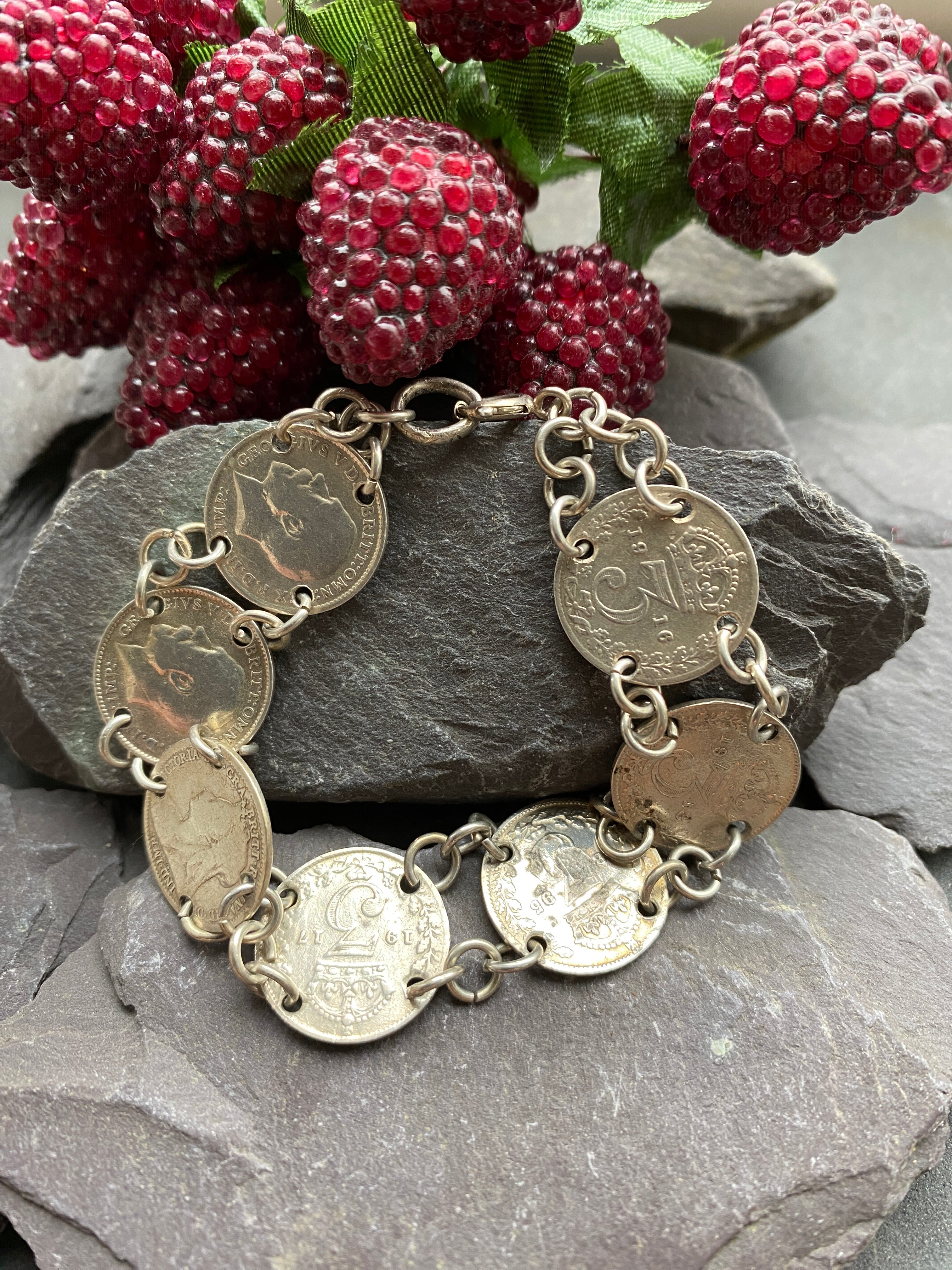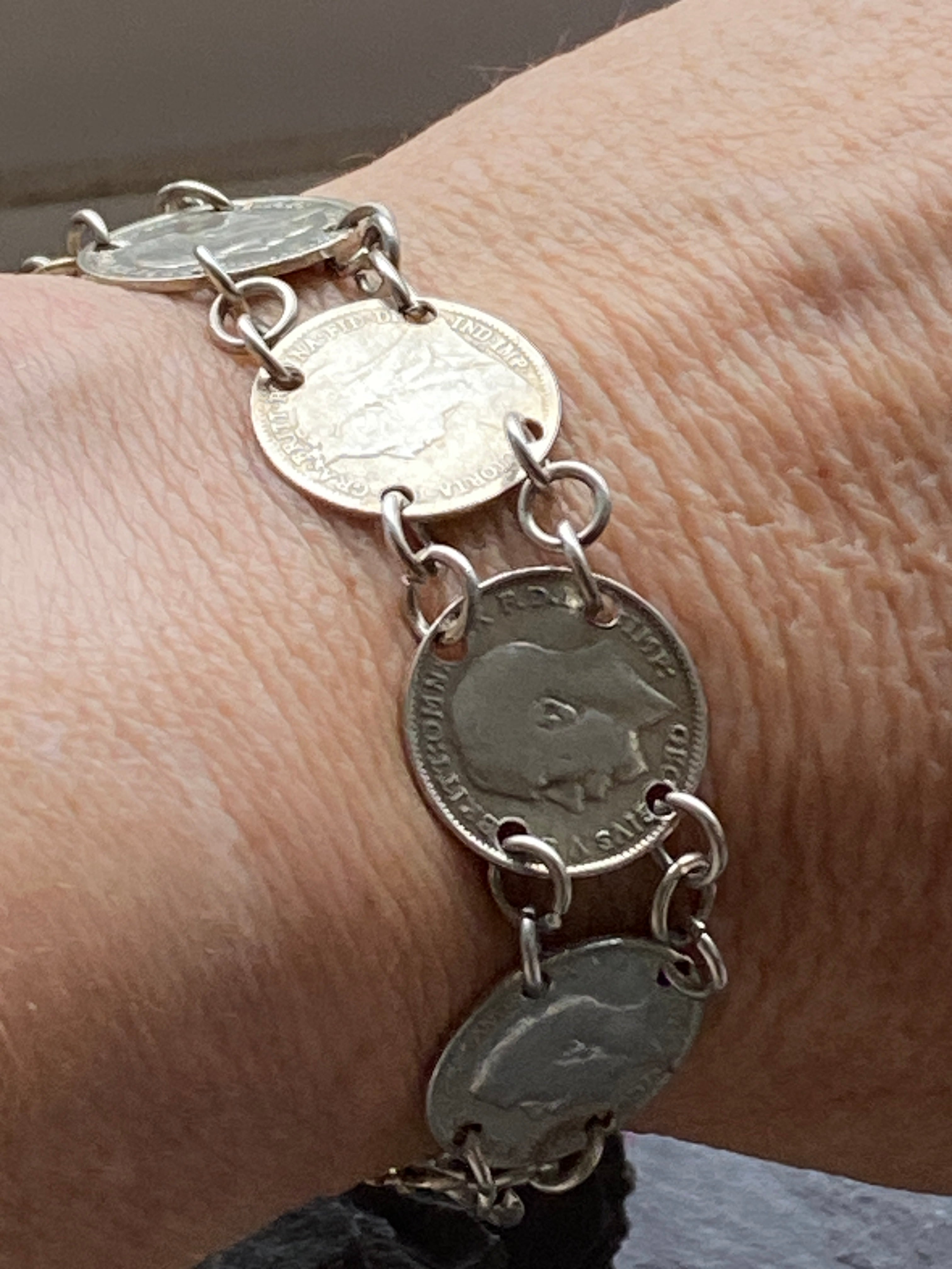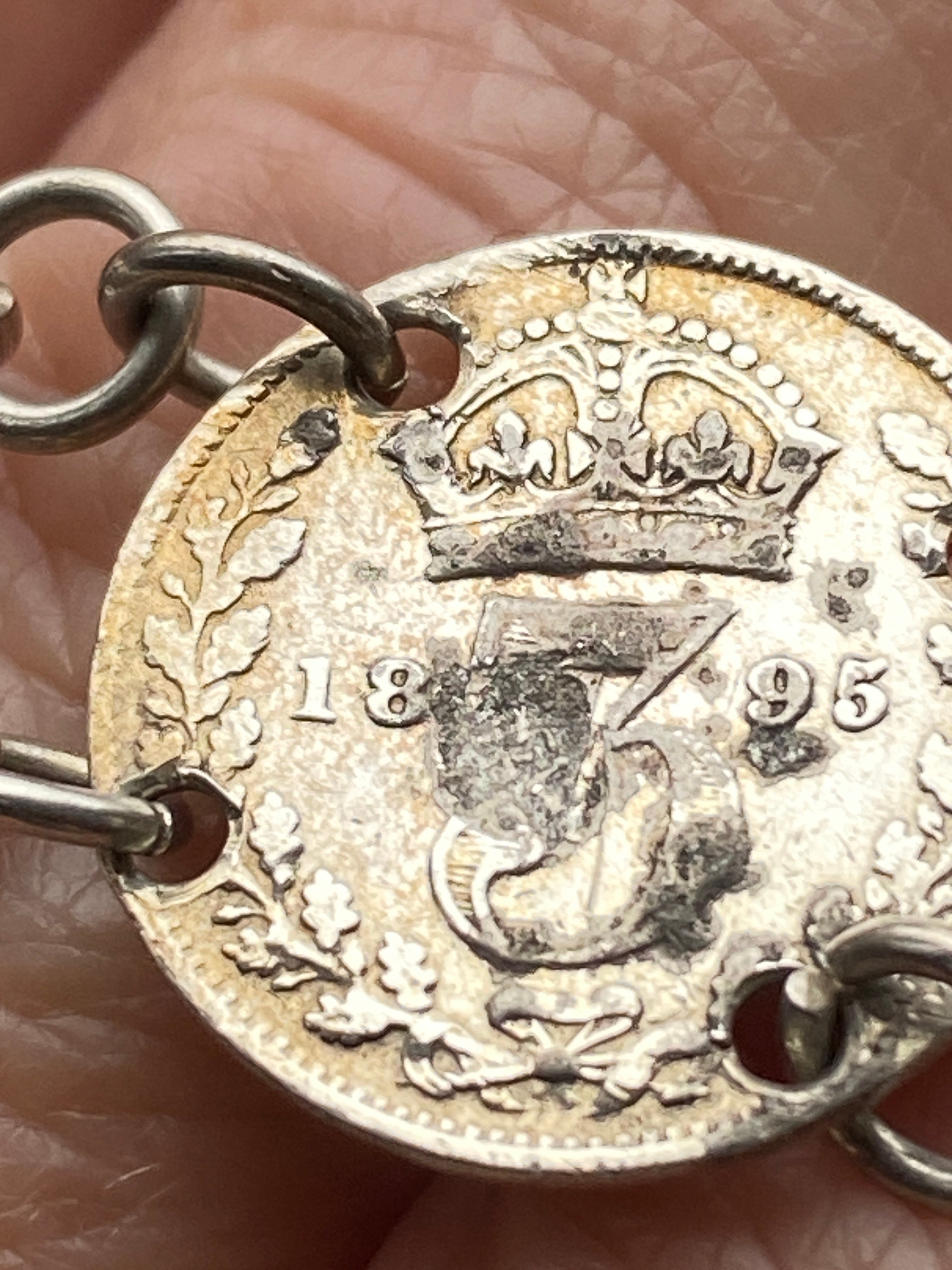 An antique three penny coin bracelet with sterling silver fittings