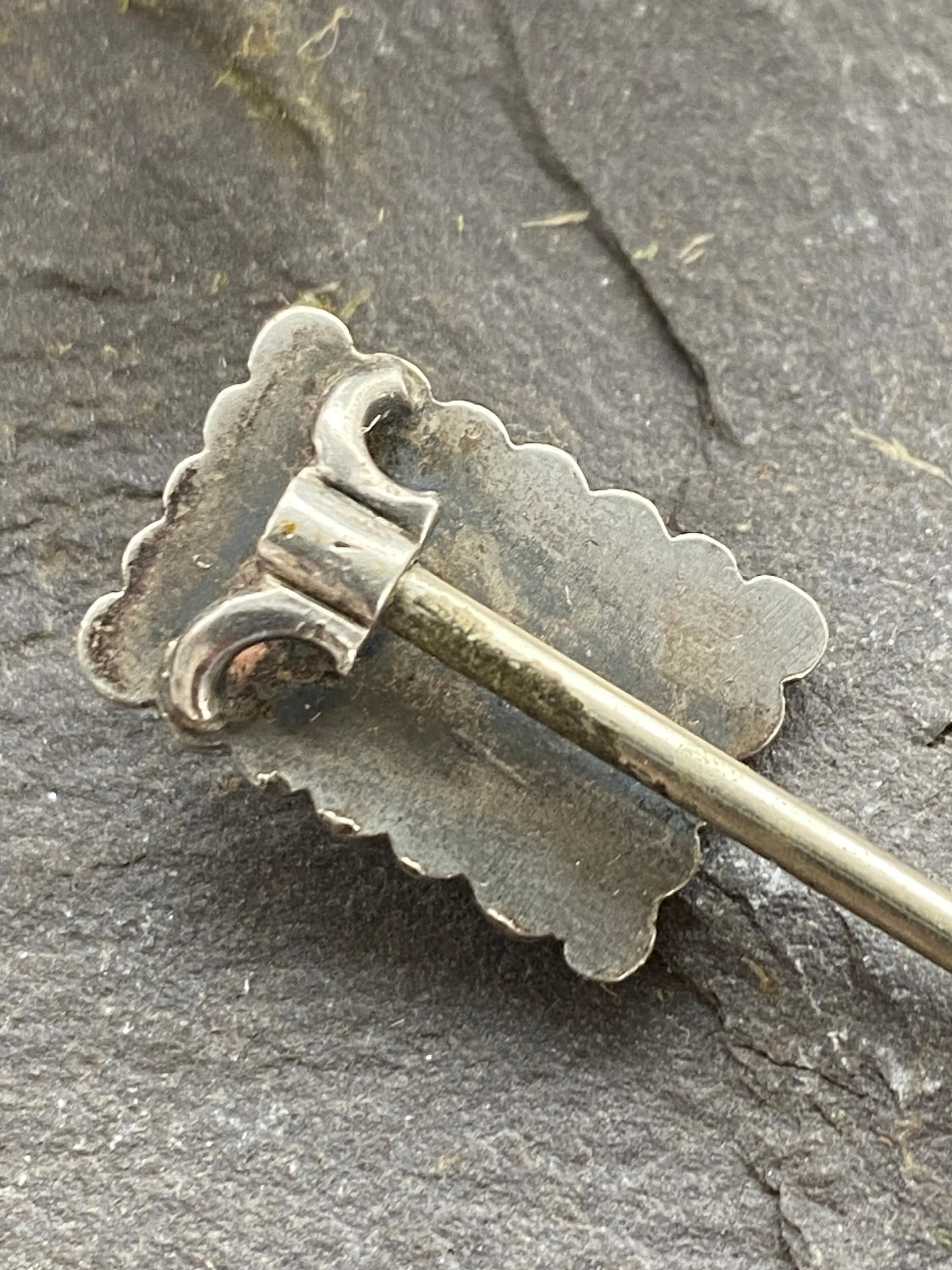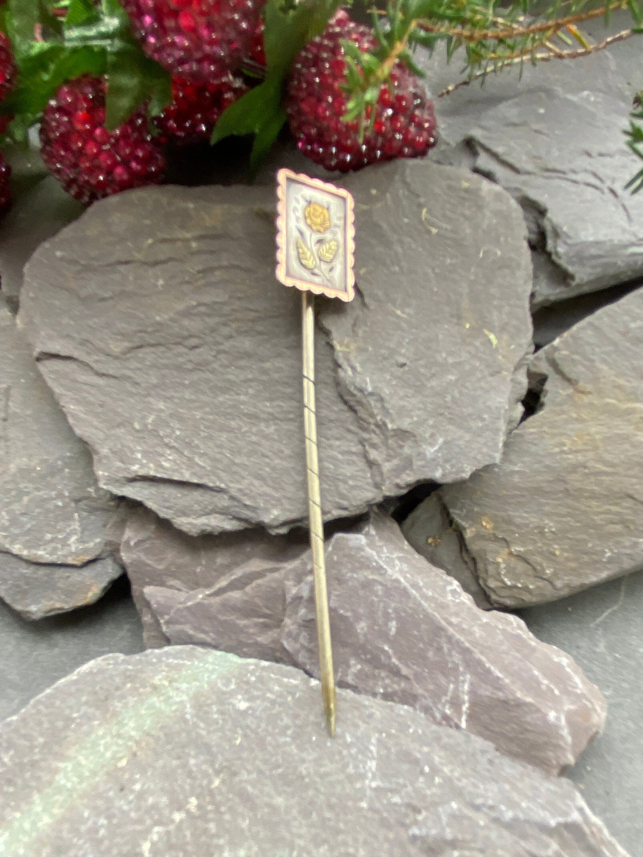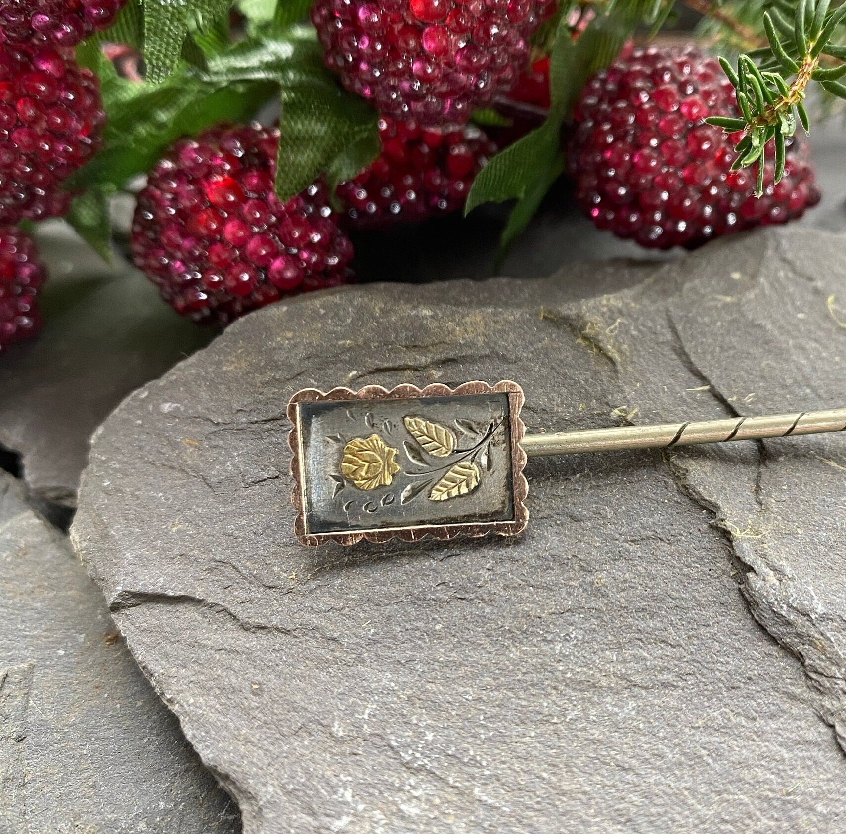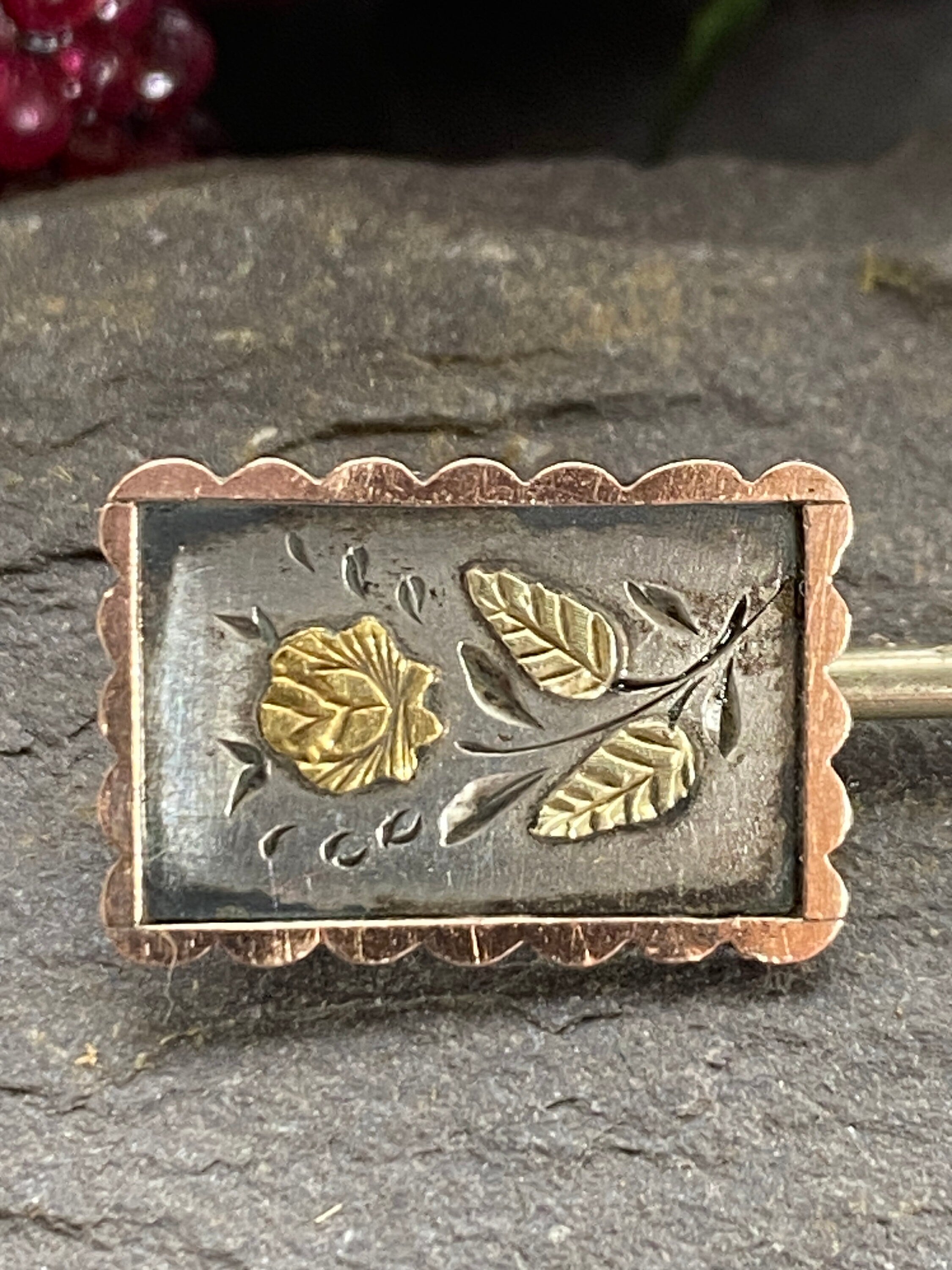 A Victorian stickpin in sterling silver with applied 9ct gold floral and foliate detail in a 9ct gold scalloped border.
