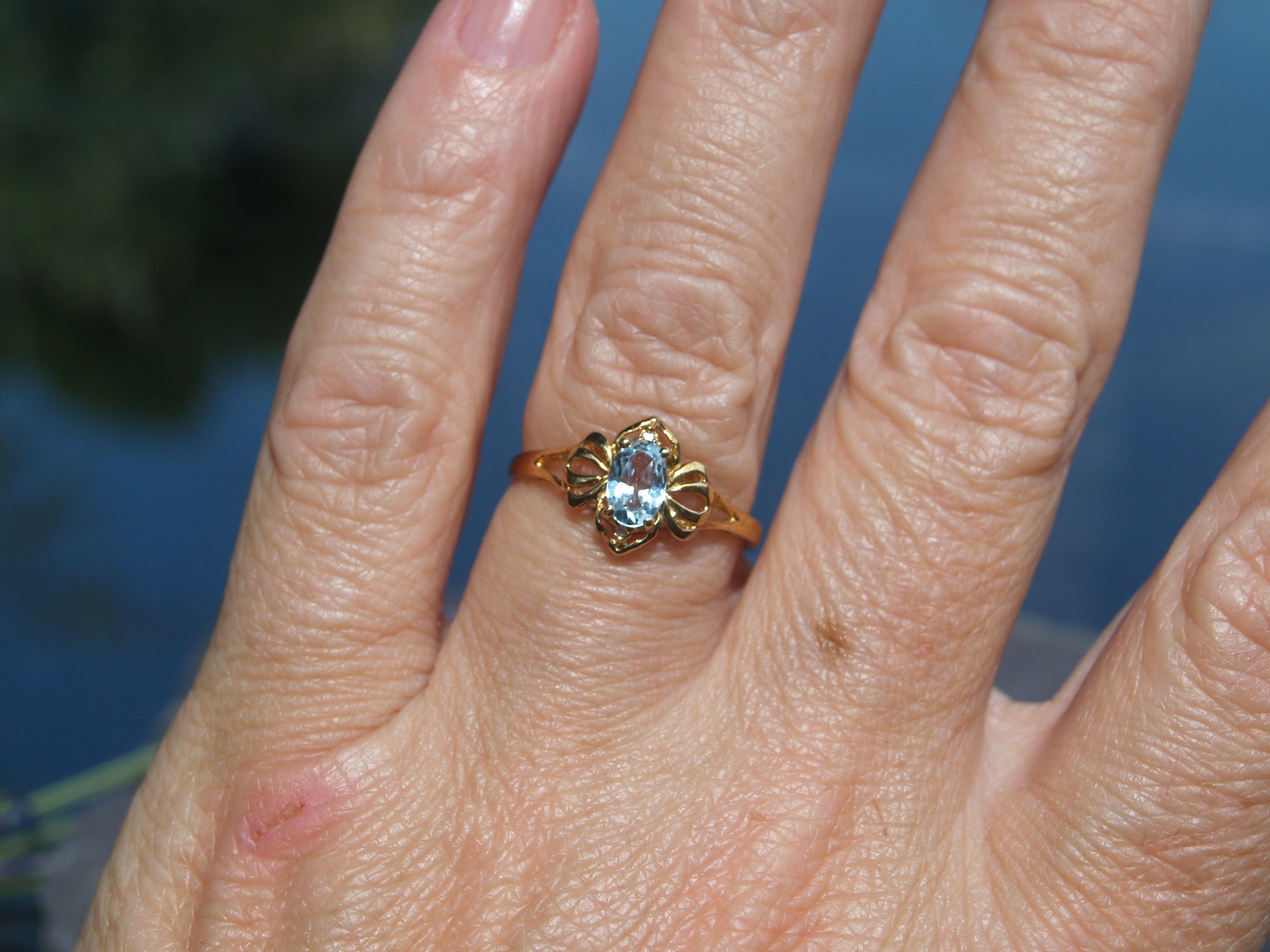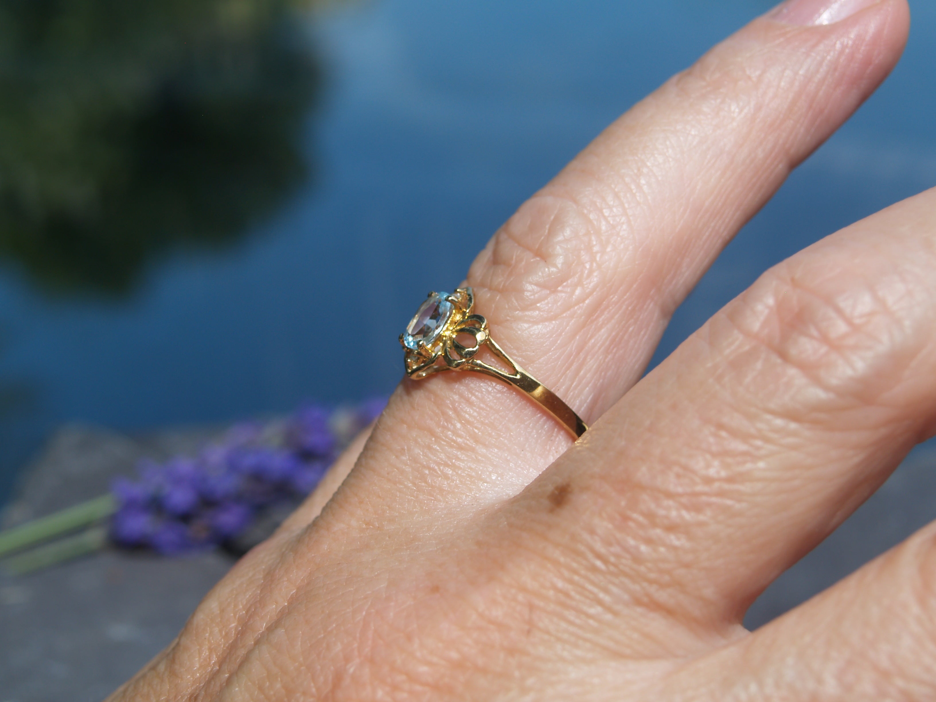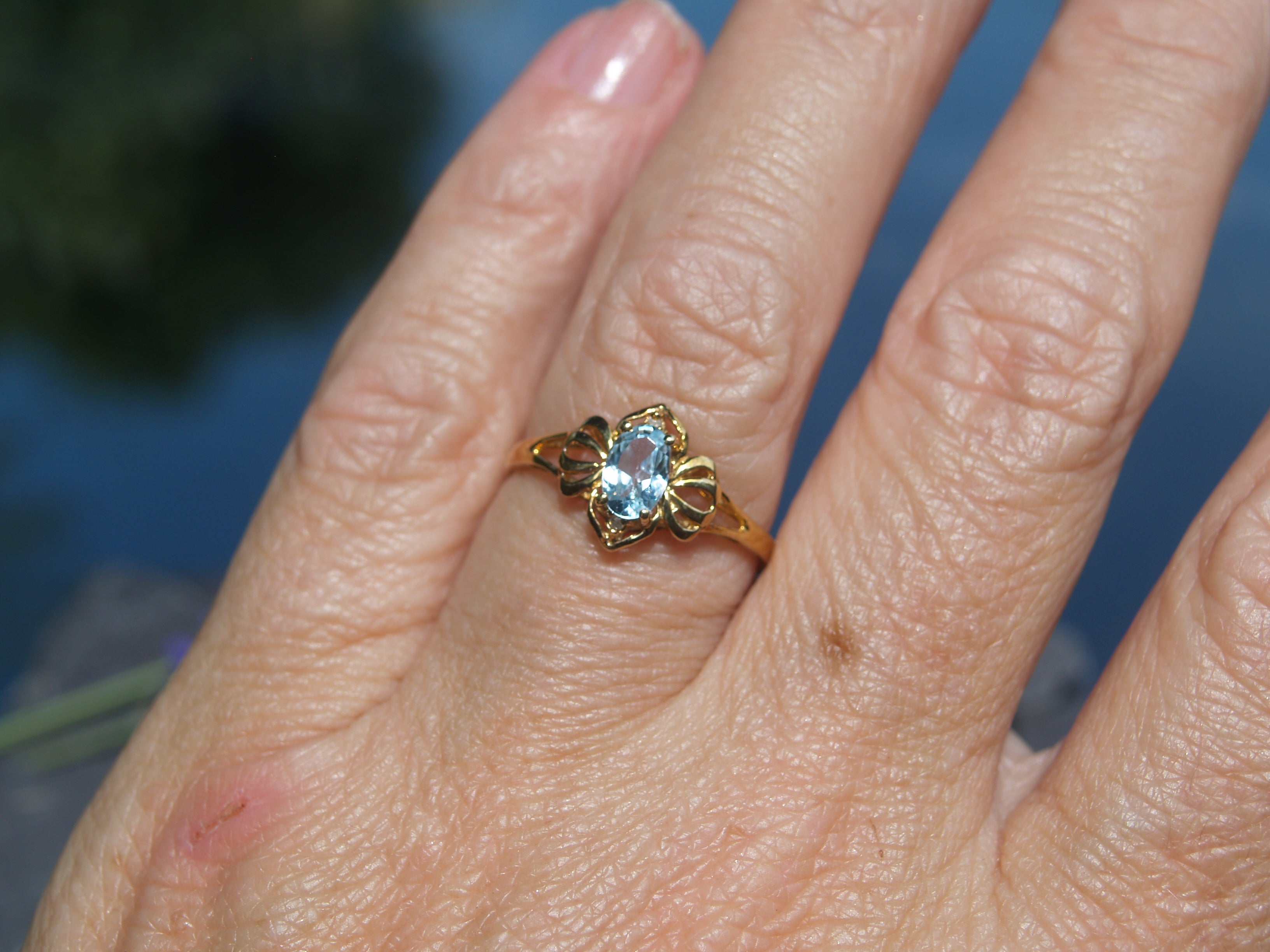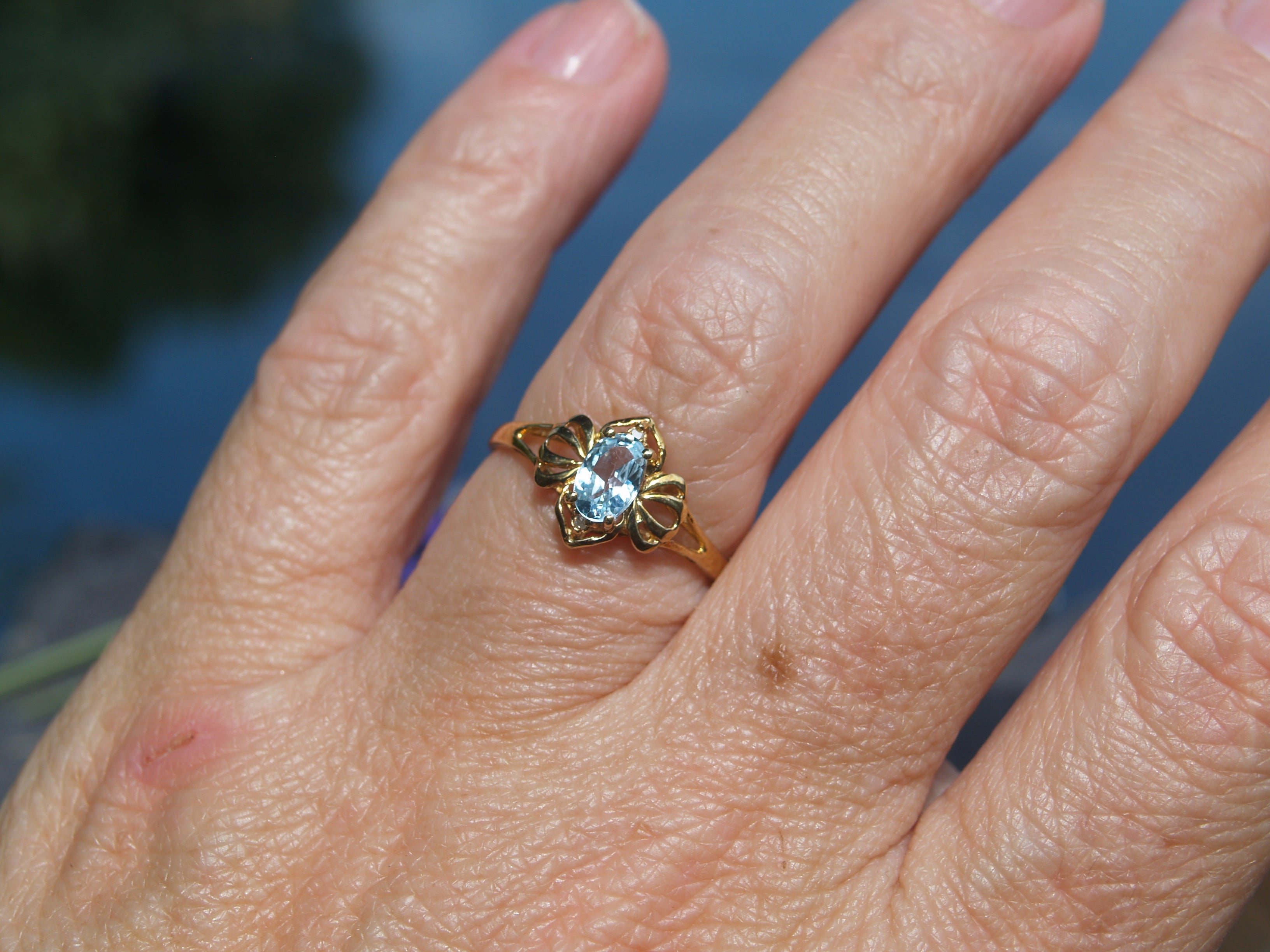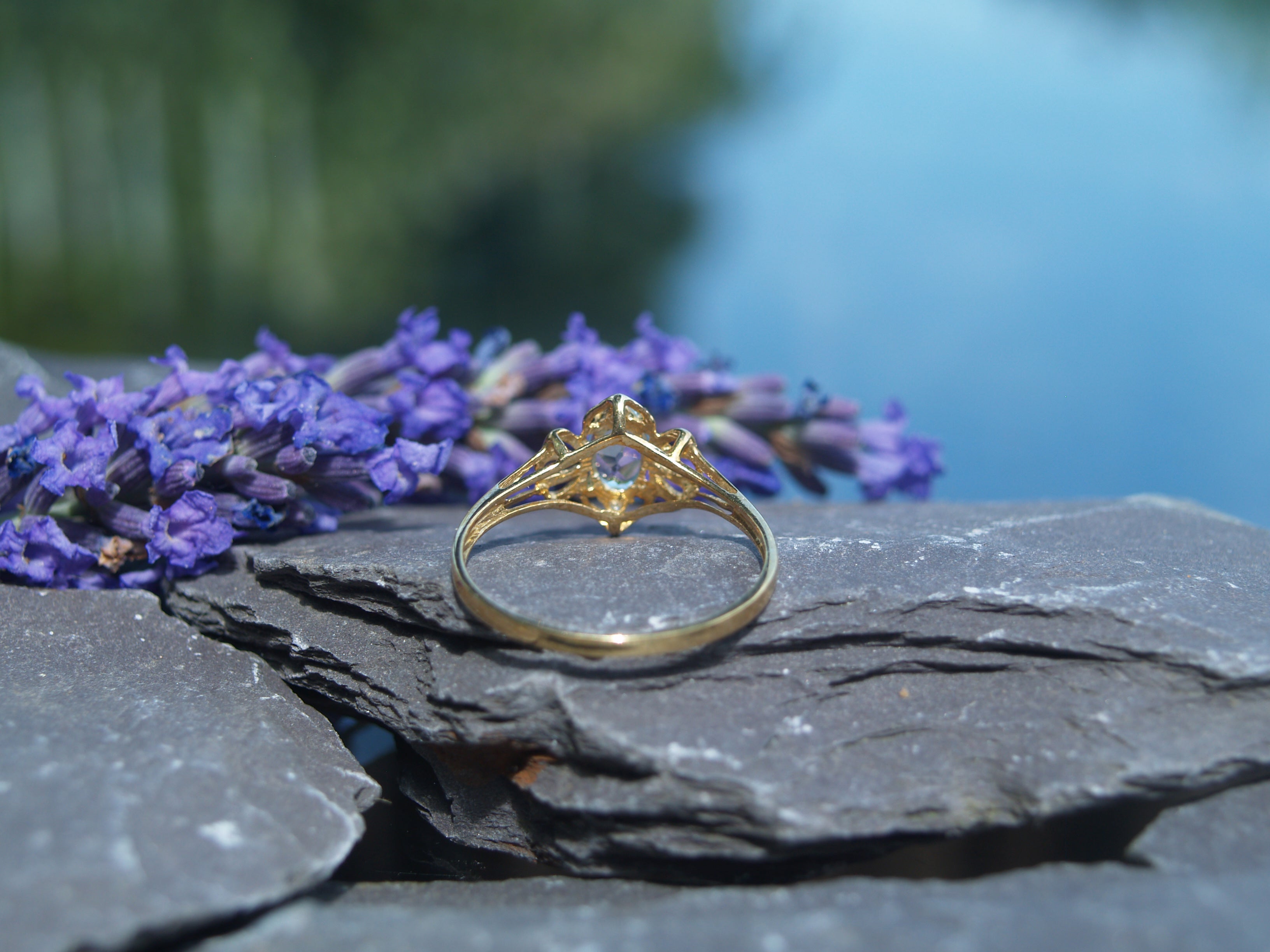 A dainty 9ct yellow gold ring set with an Oval Aquamarine stone tipped with a Diamond each end.