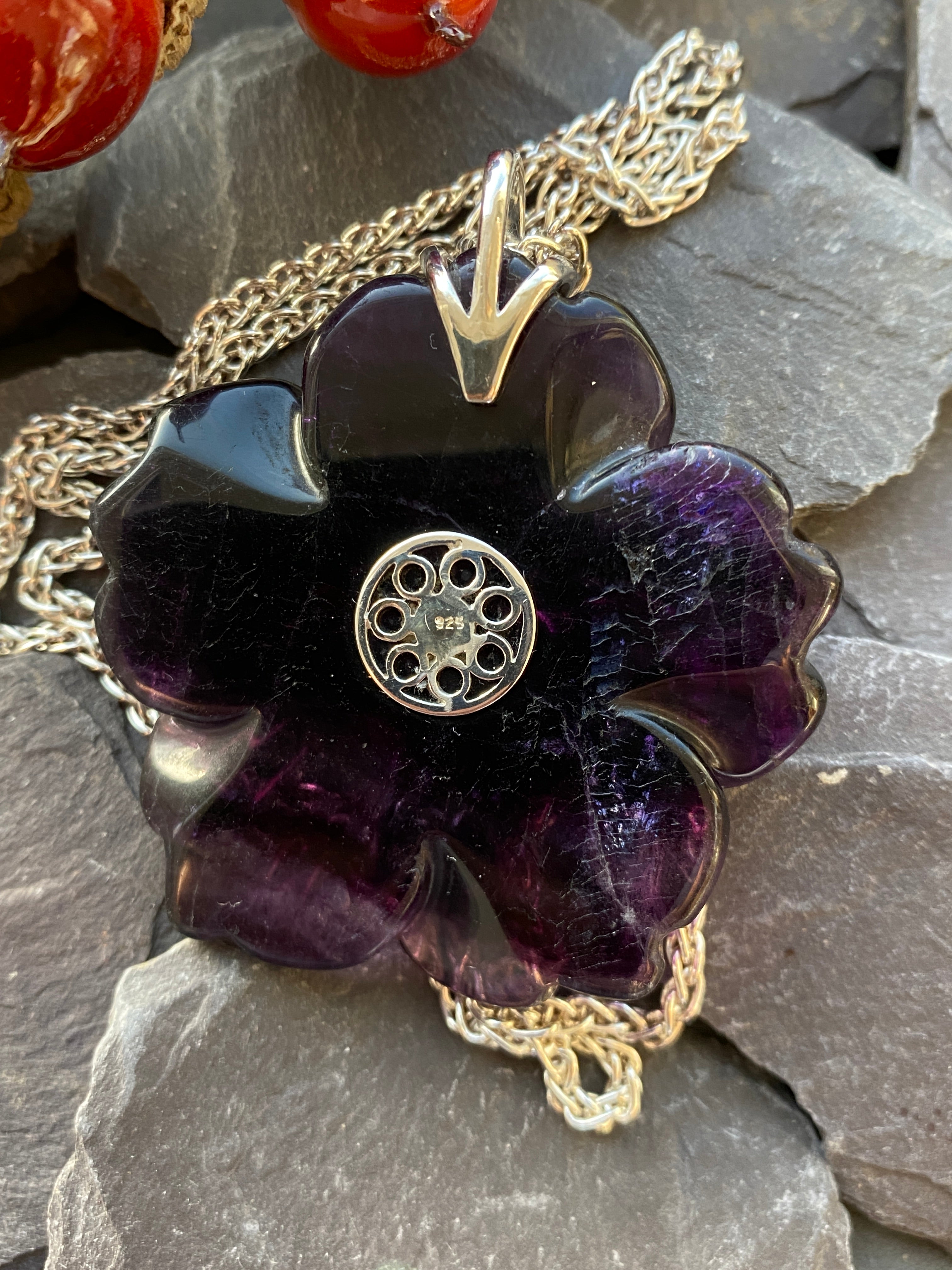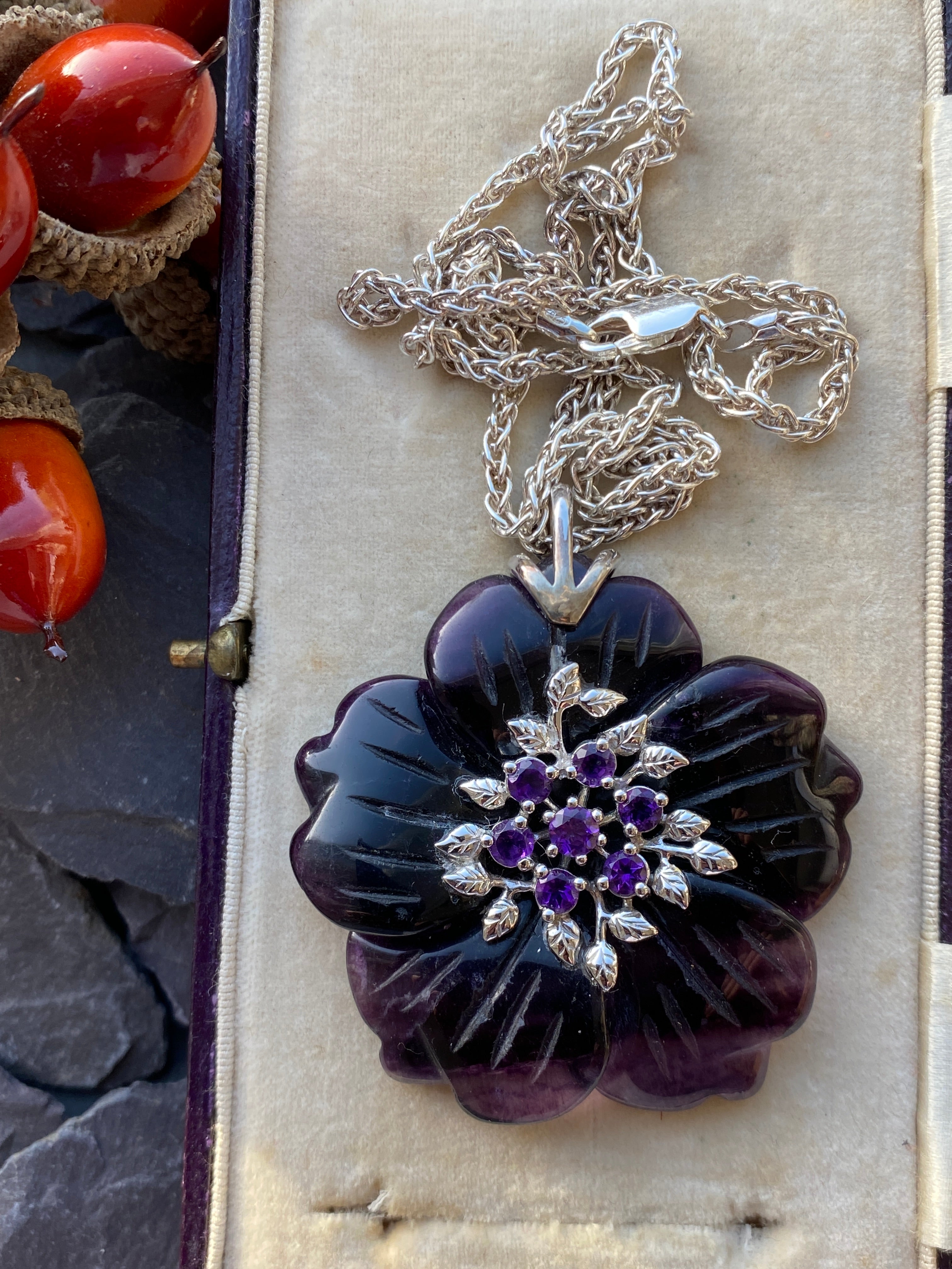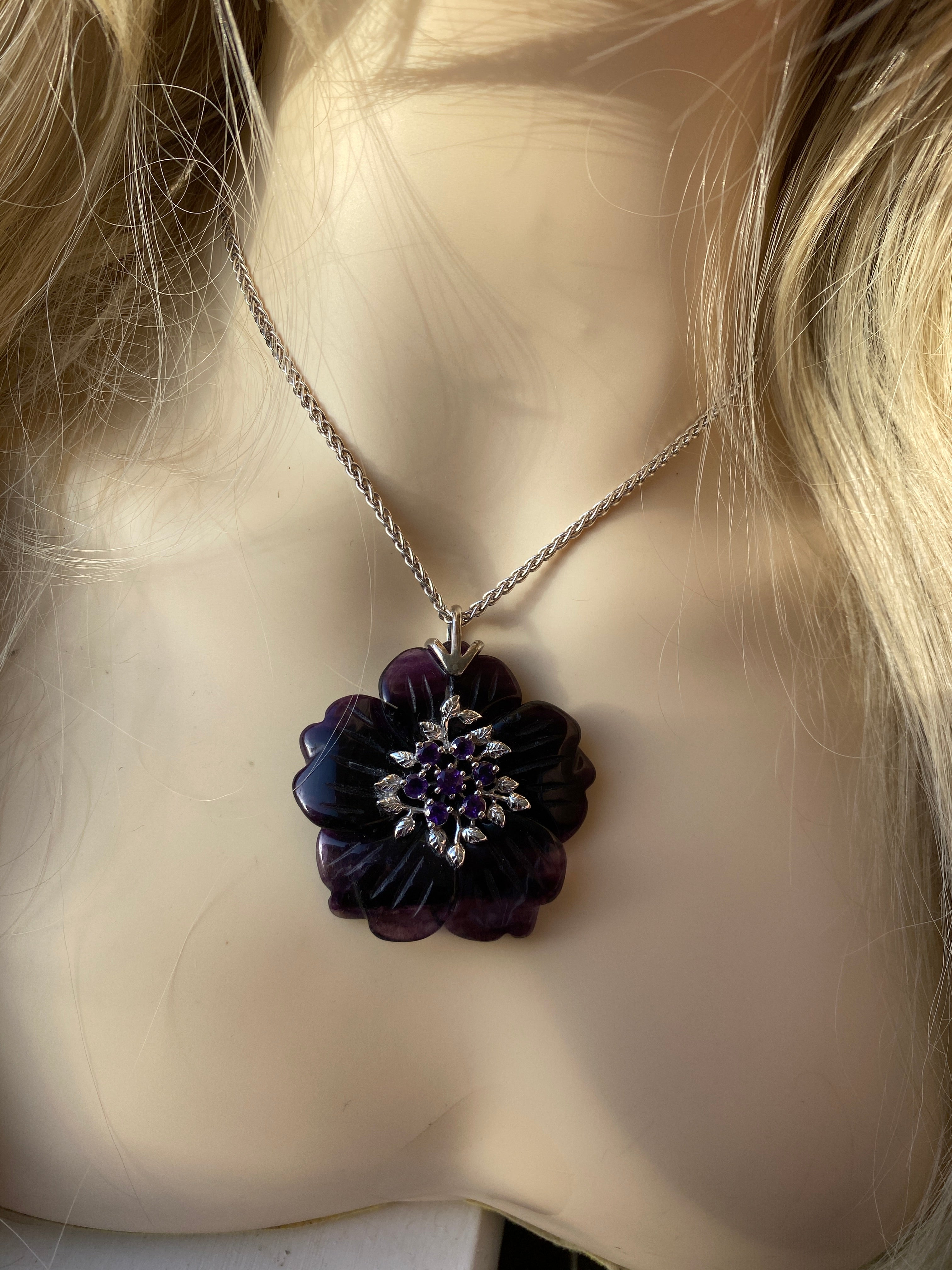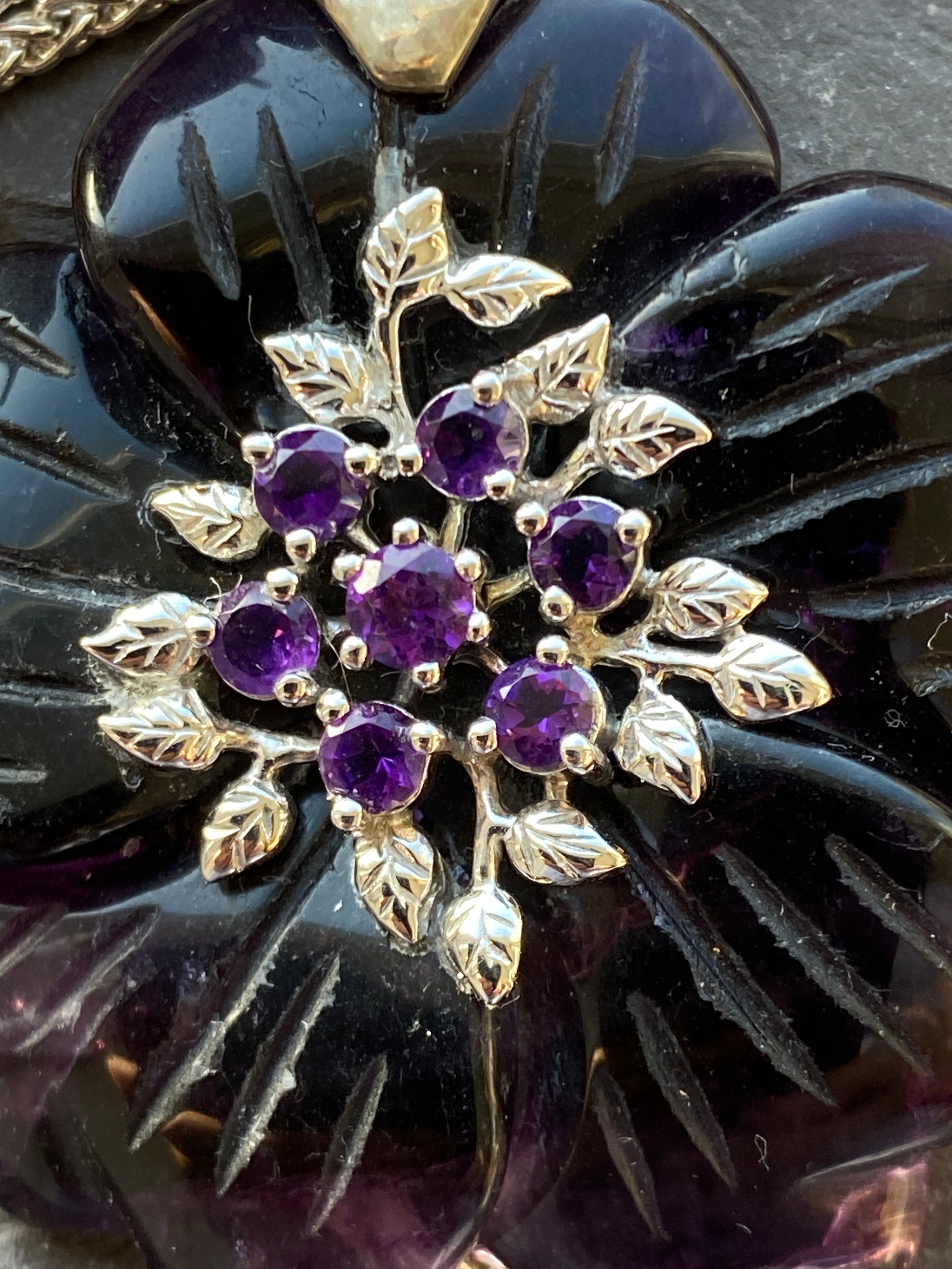 A stunning carved Amethyst flower set in sterling silver with faceted Amethyst central decoration
