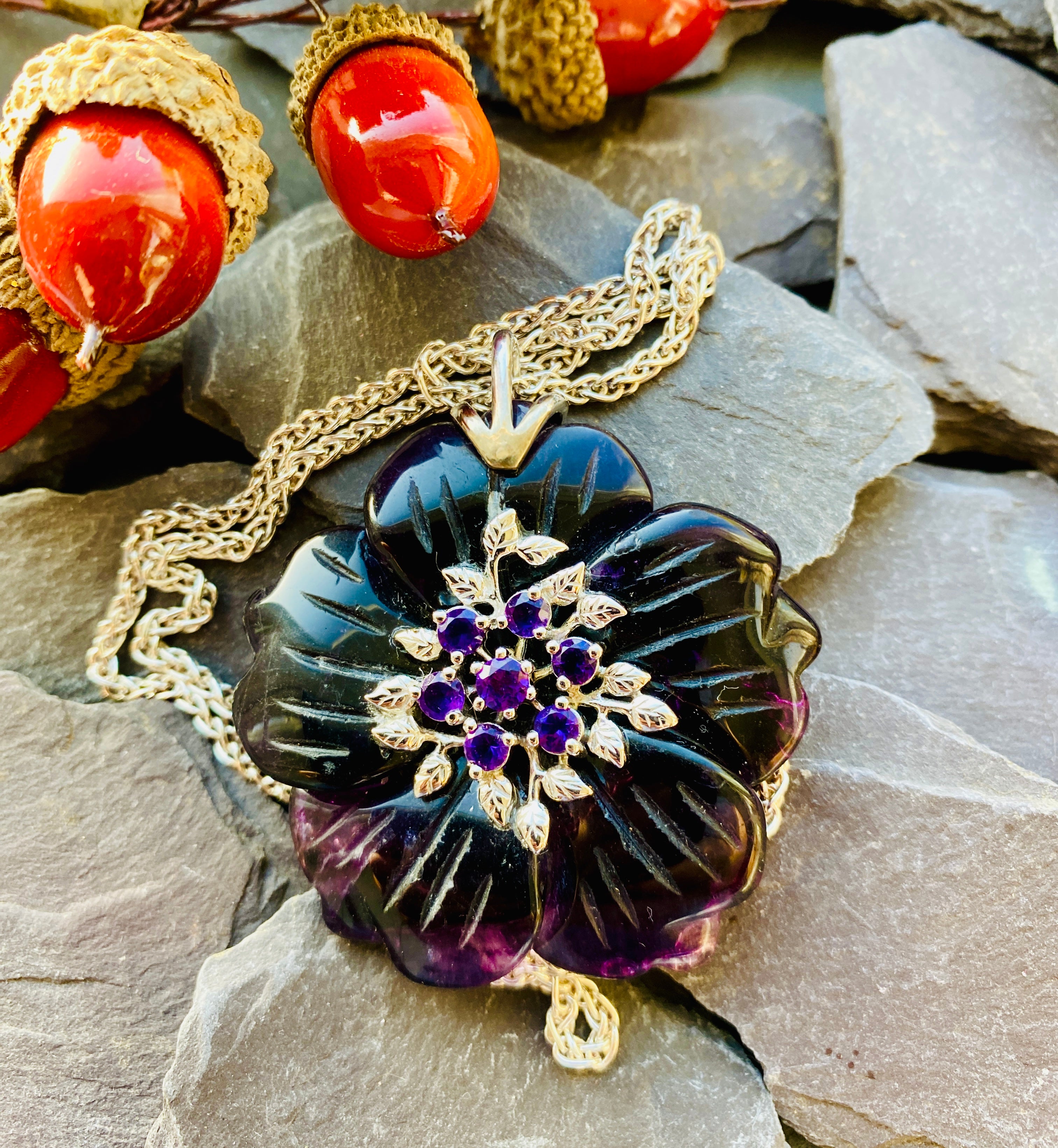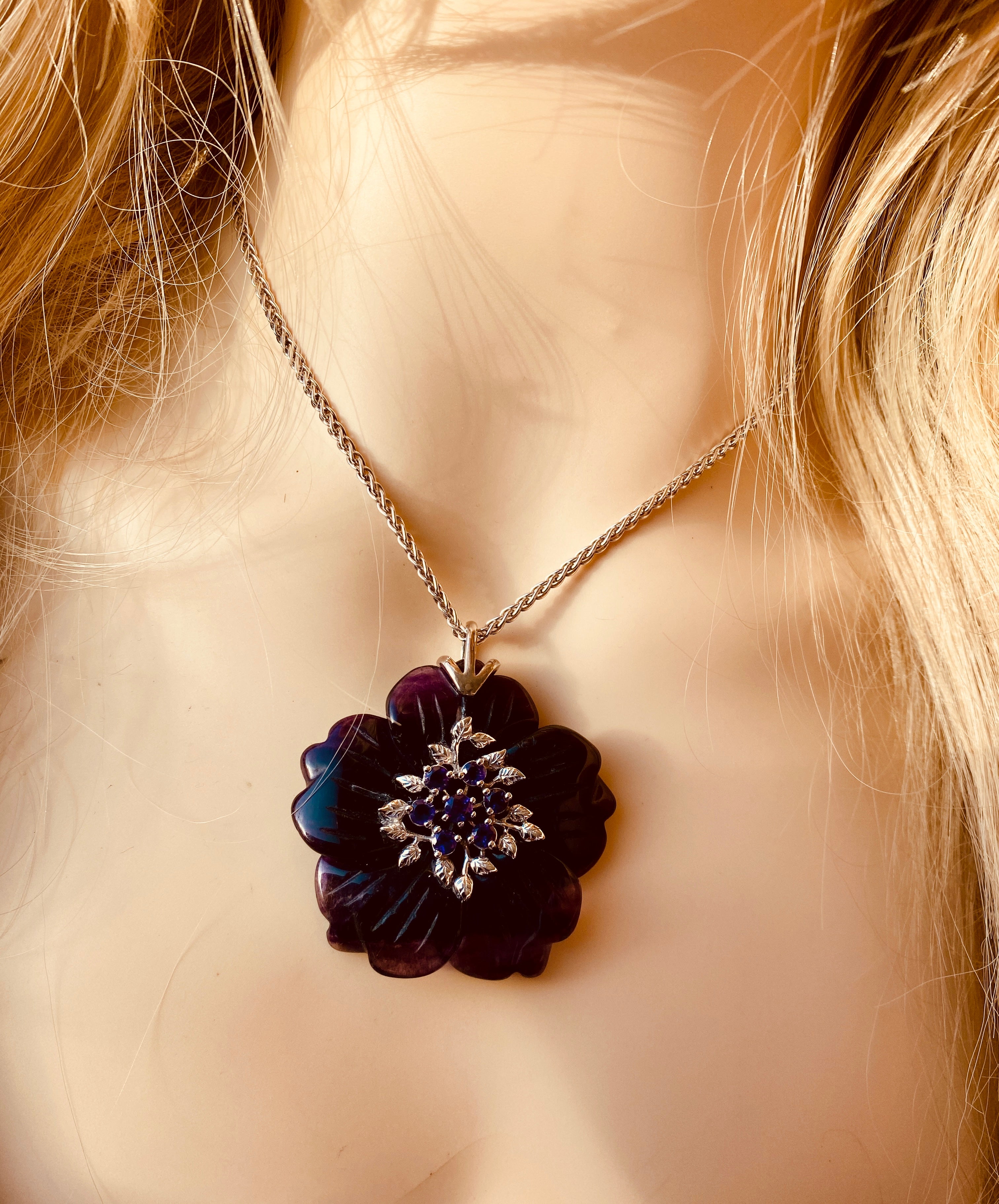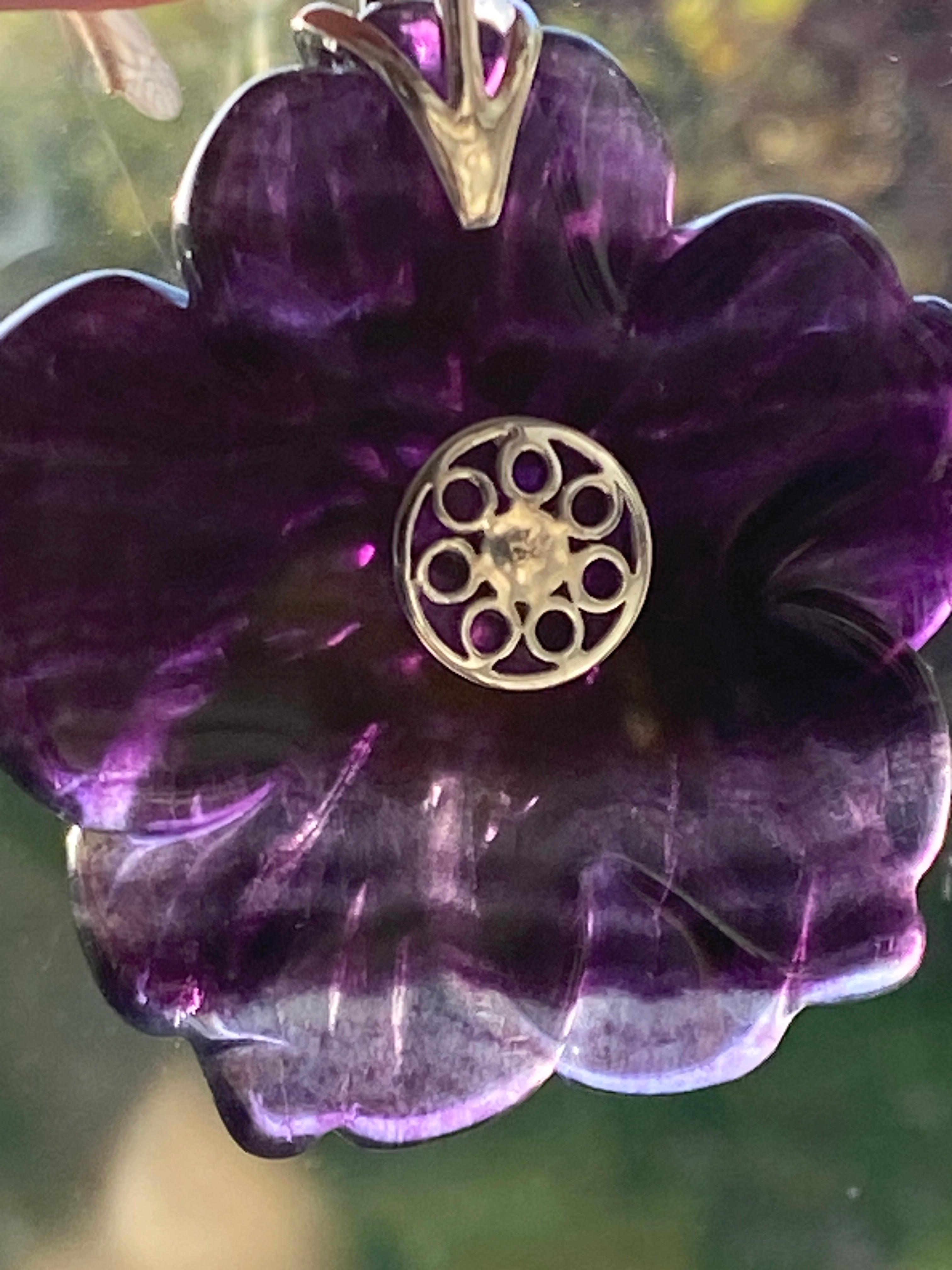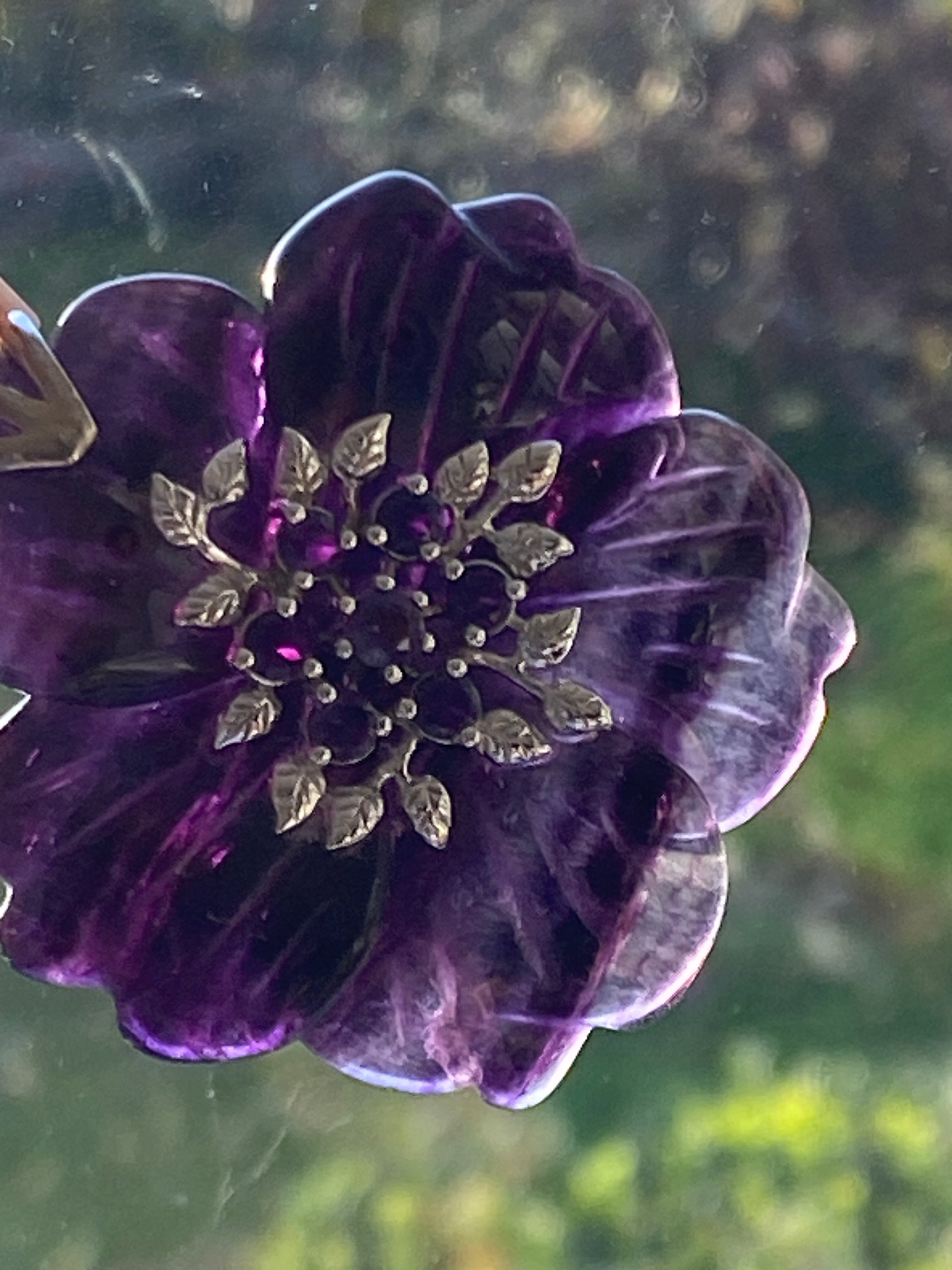 A stunning carved Amethyst flower set in sterling silver with faceted Amethyst central decoration