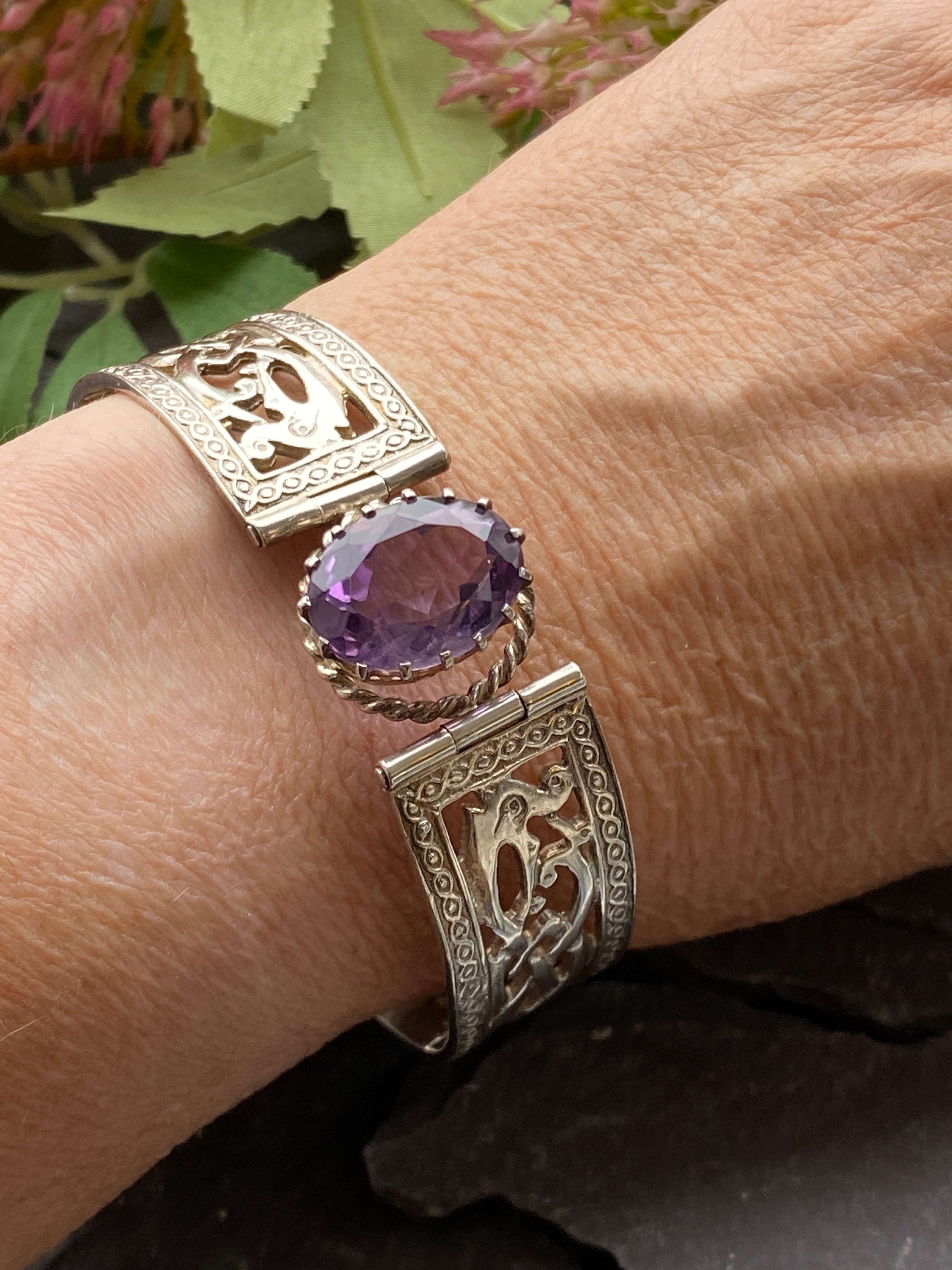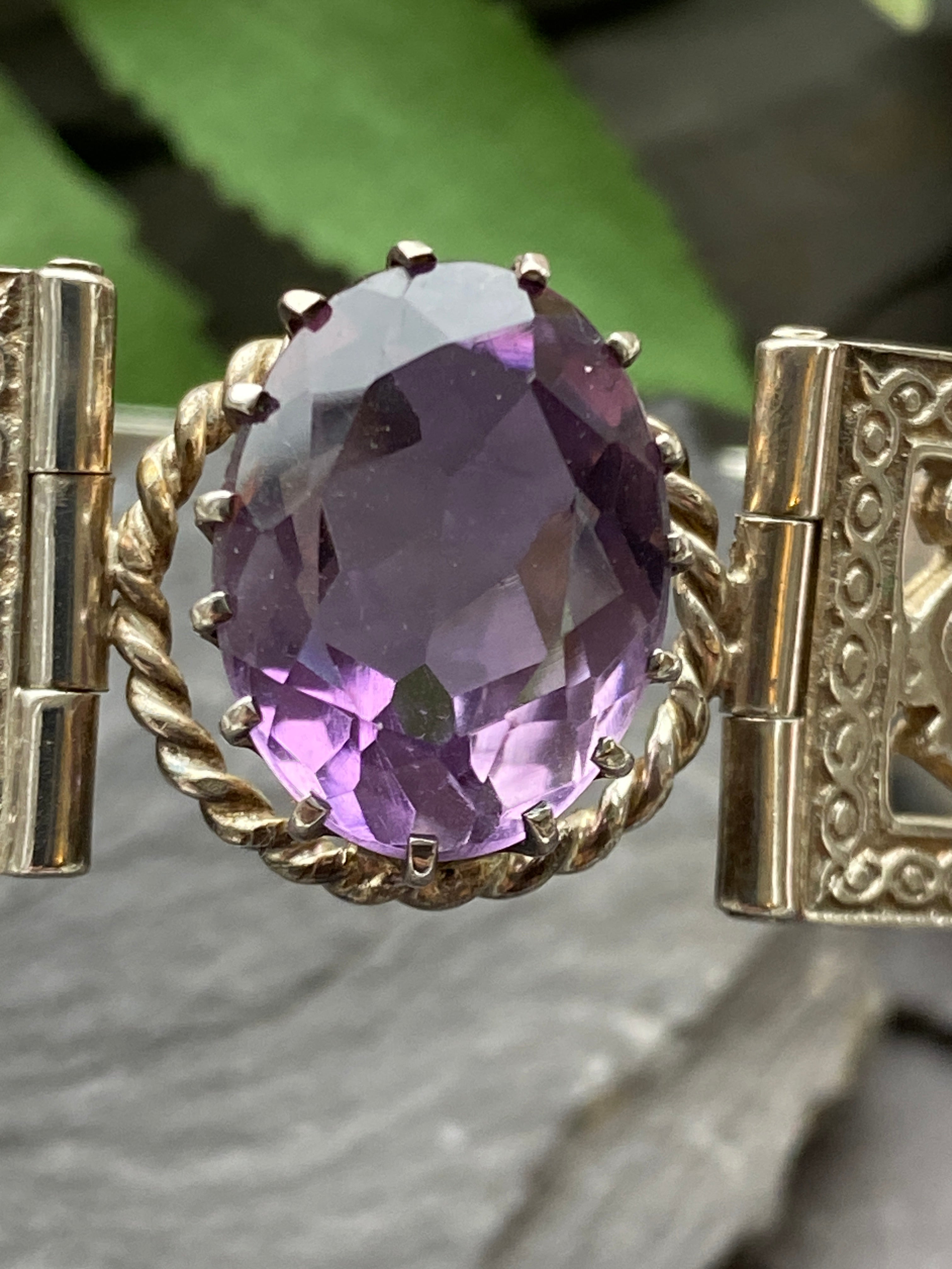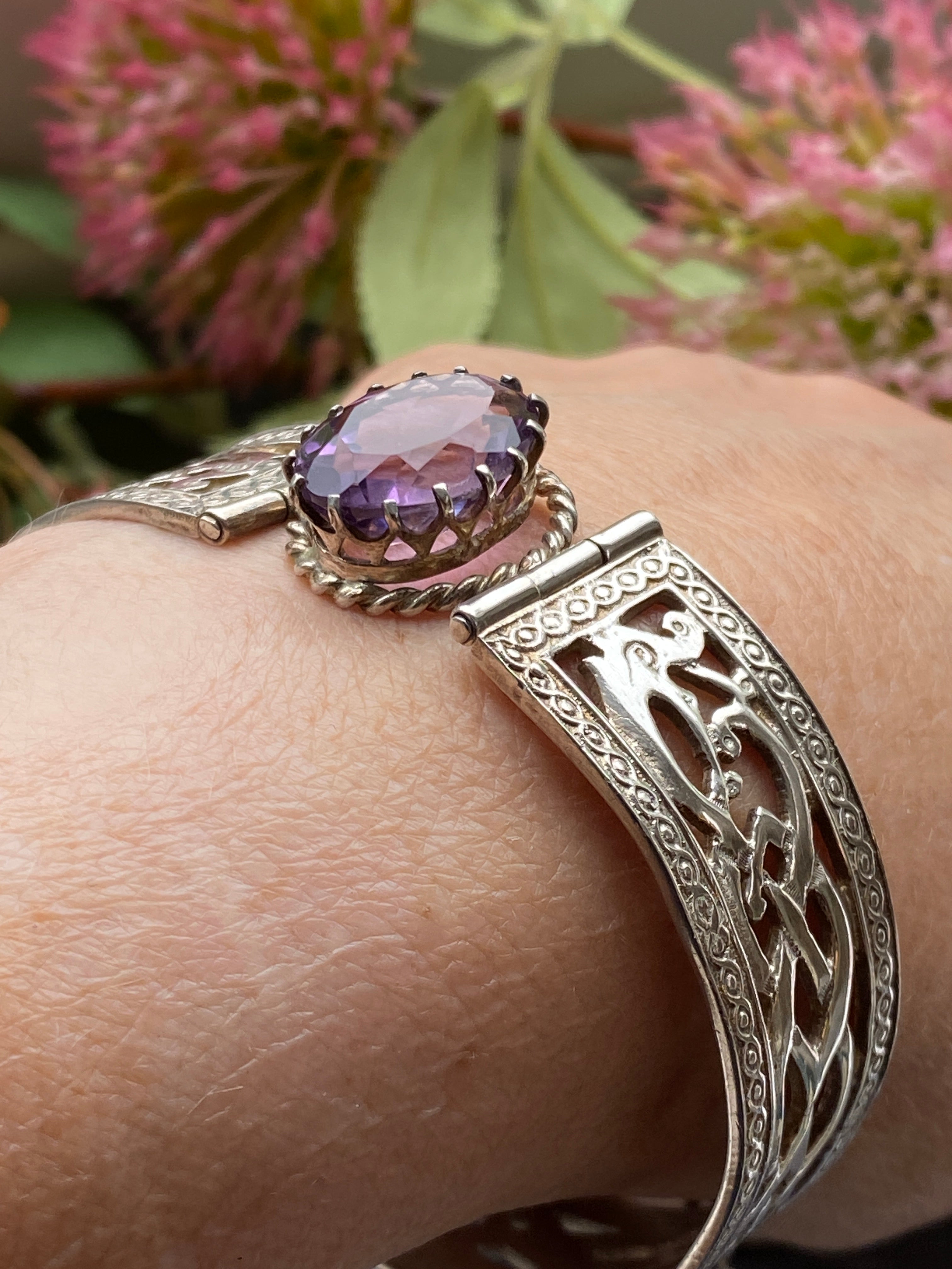 A stunning sterling silver bangle set with a natural faceted Amethyst stone. Approximately 7 inches. Fastens with a pin. You will need help! Cridhe means heart in Gaelic. Made in...