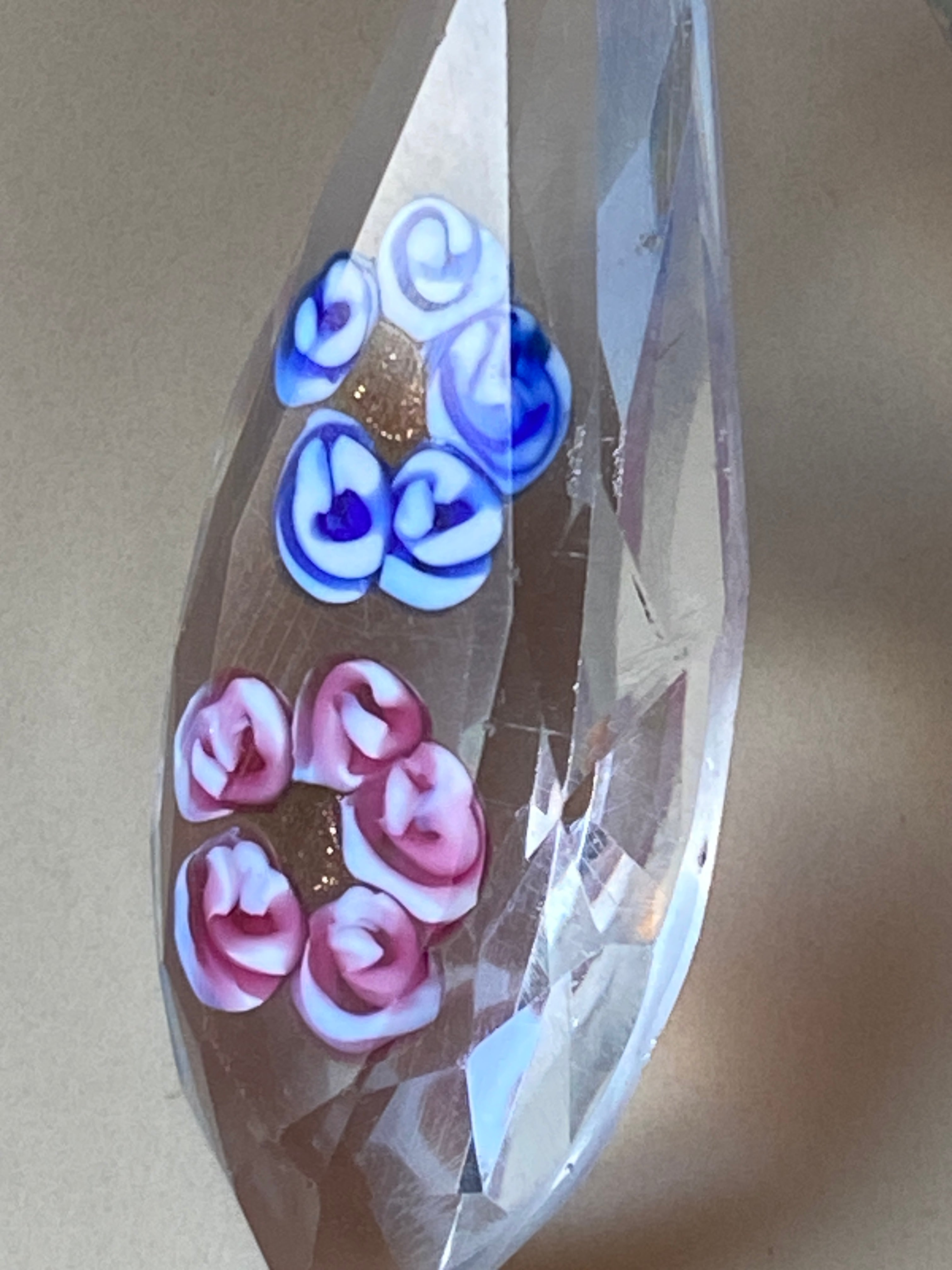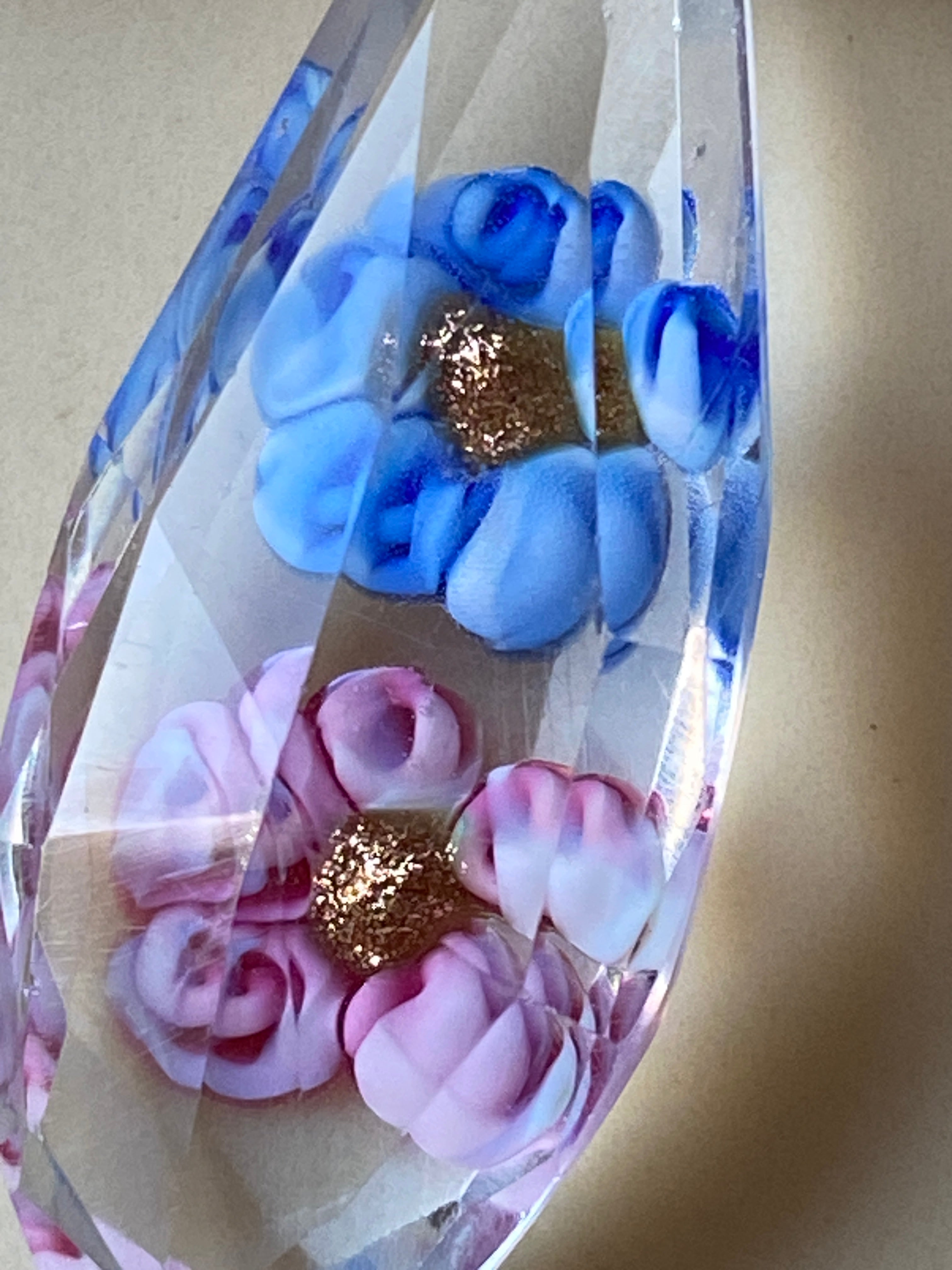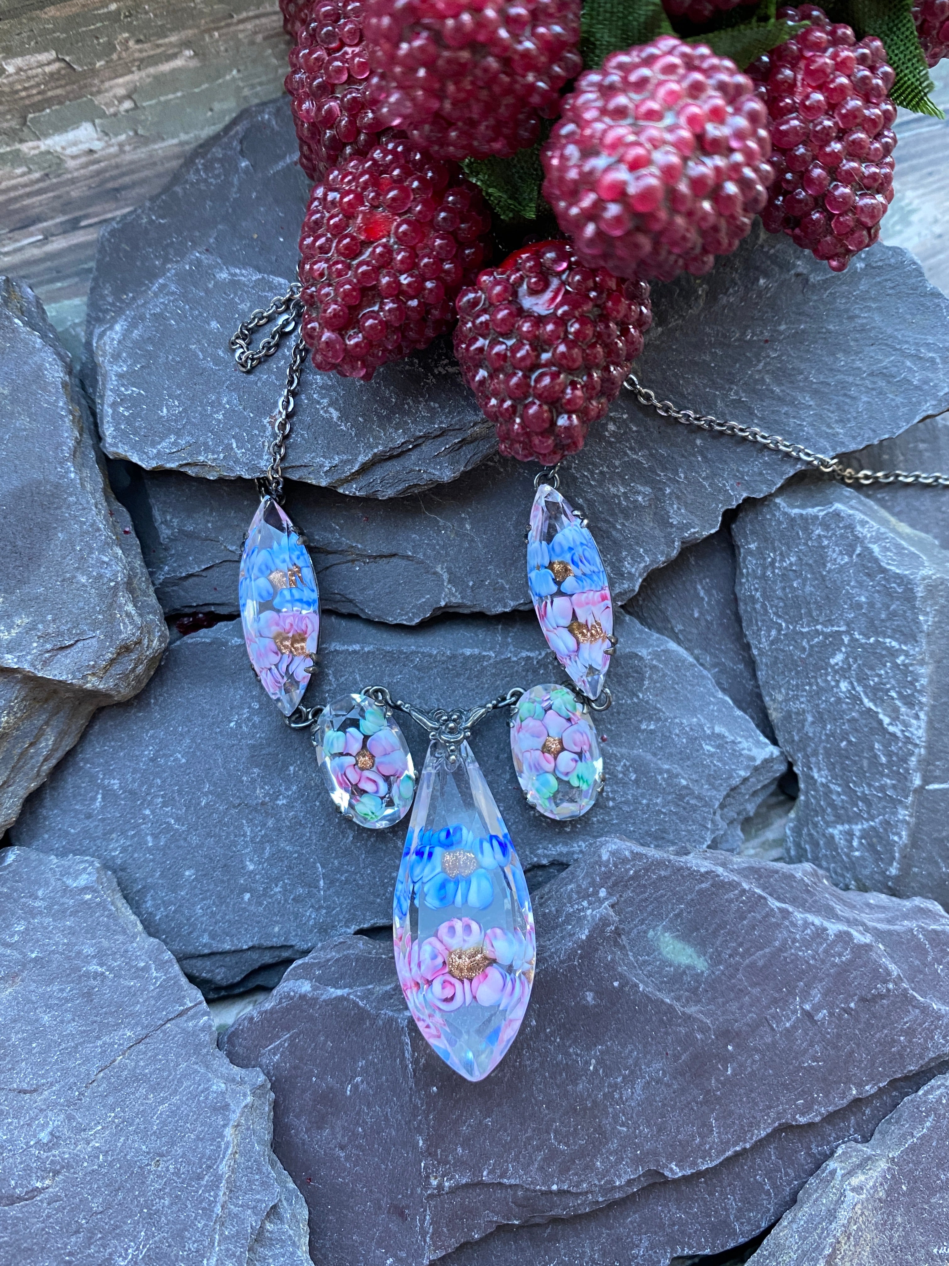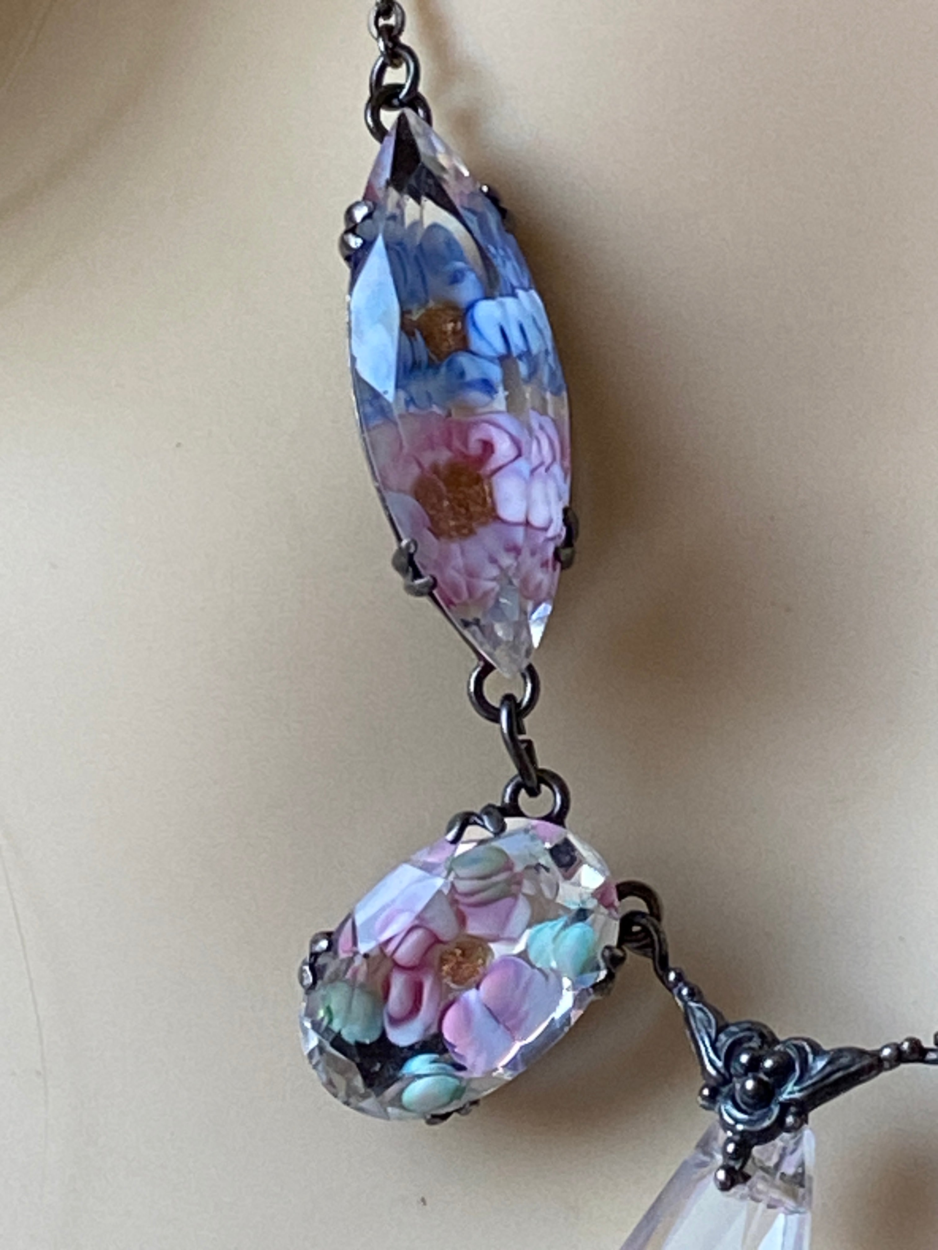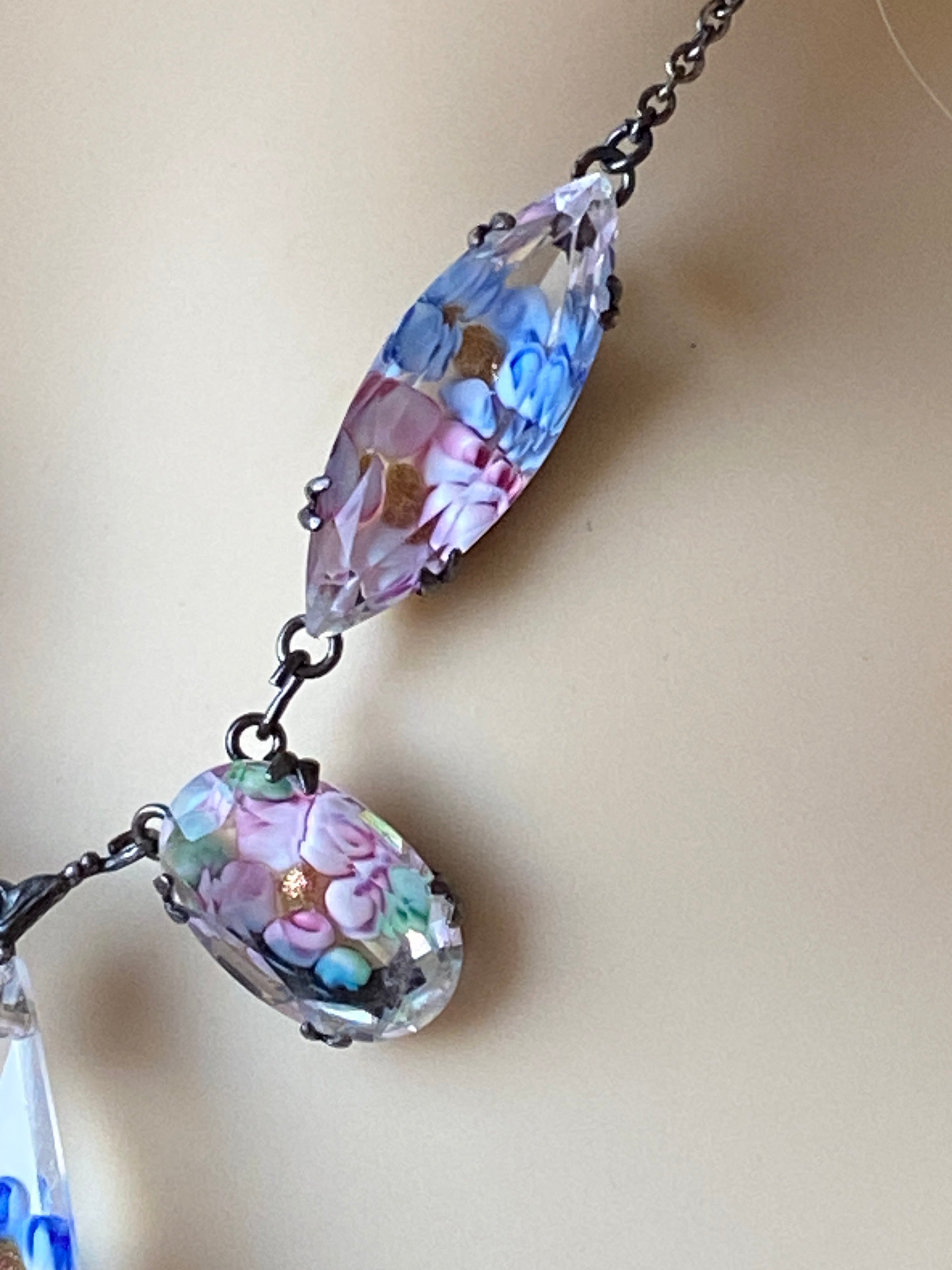 A stunning Art Deco necklace with hand blown faceted glass drops with pink and blue flowers.