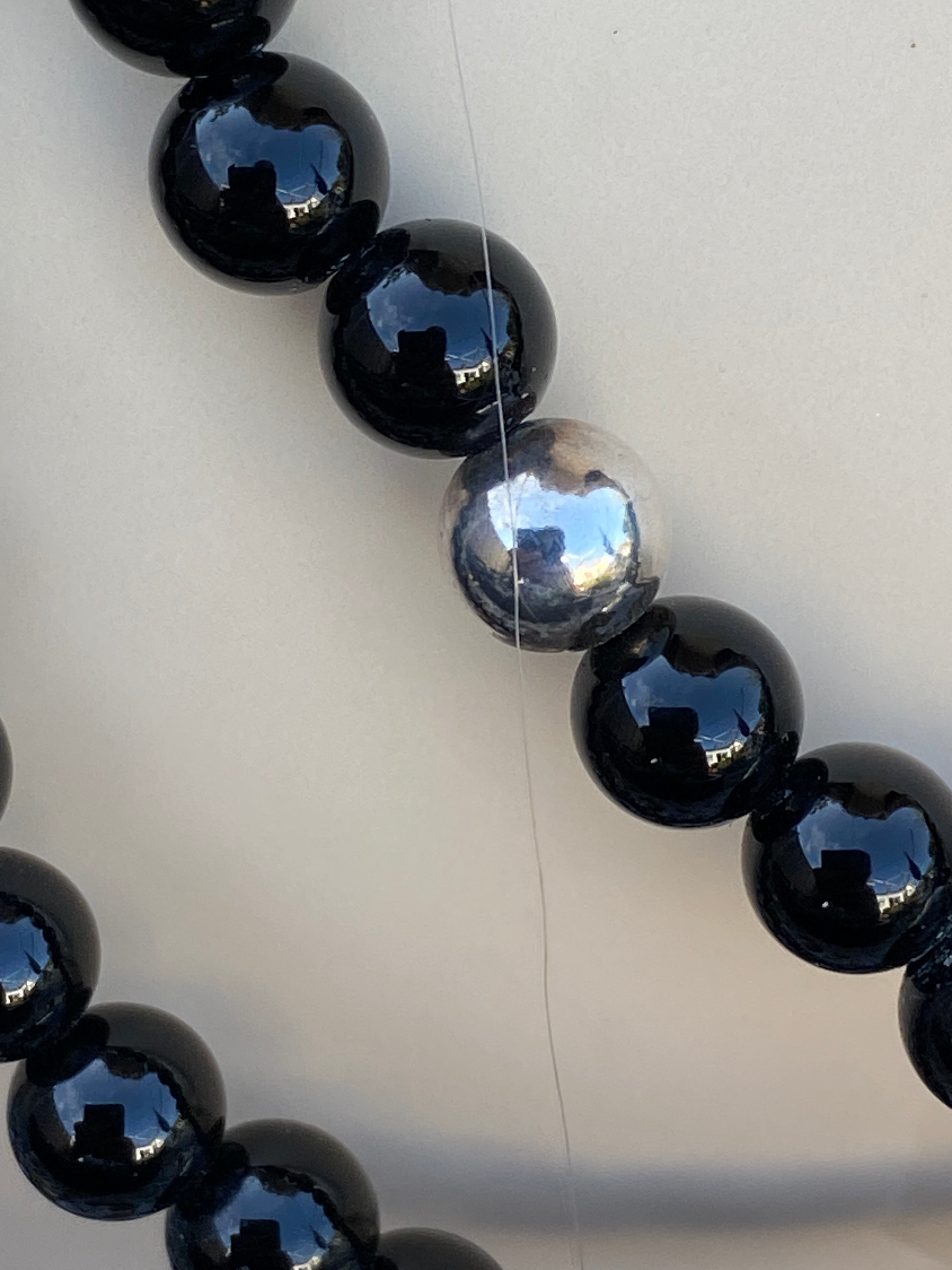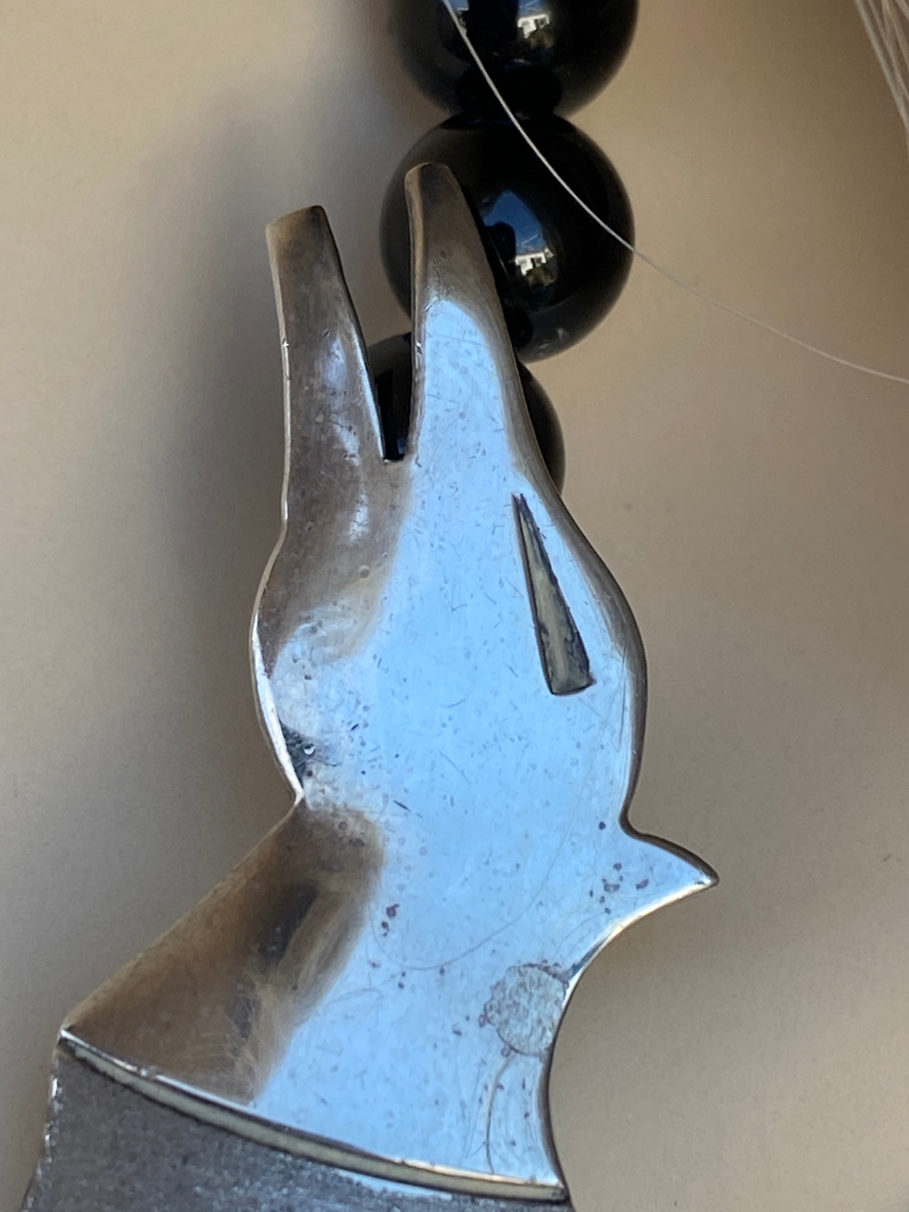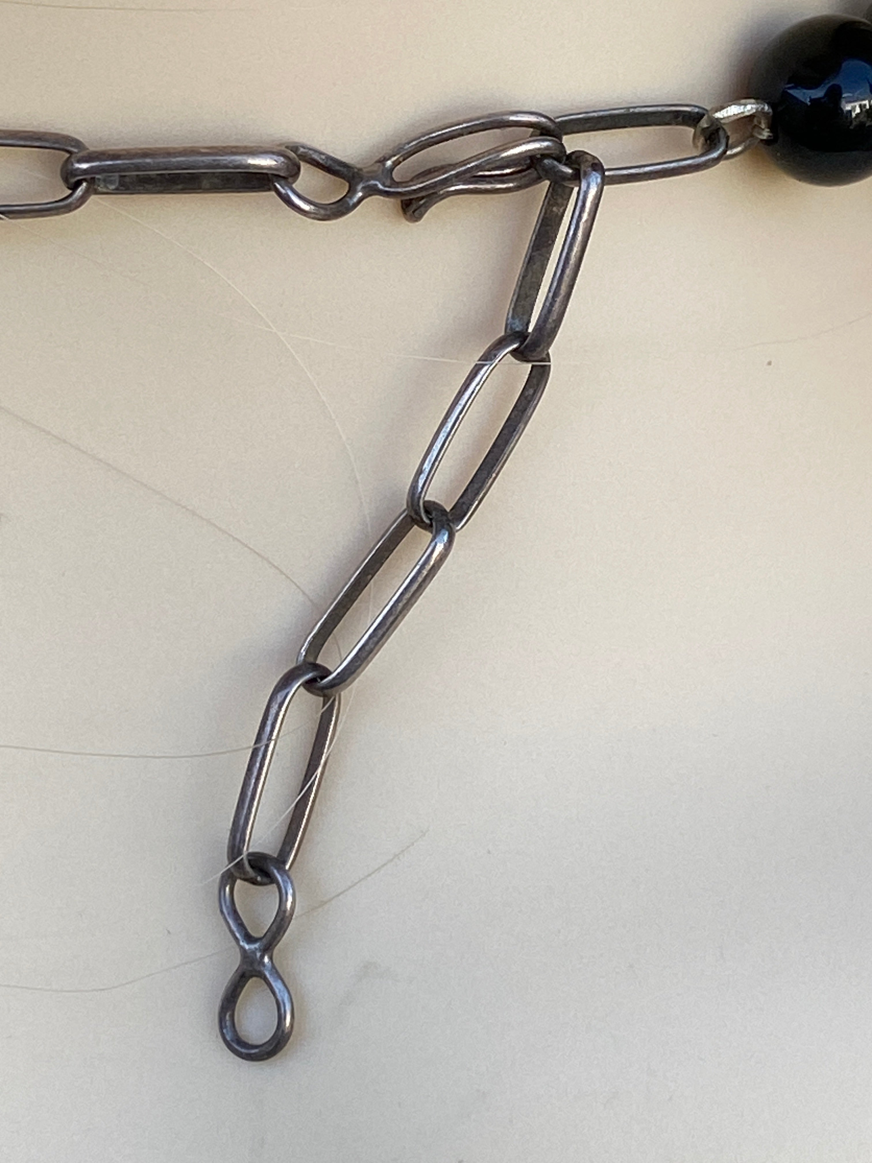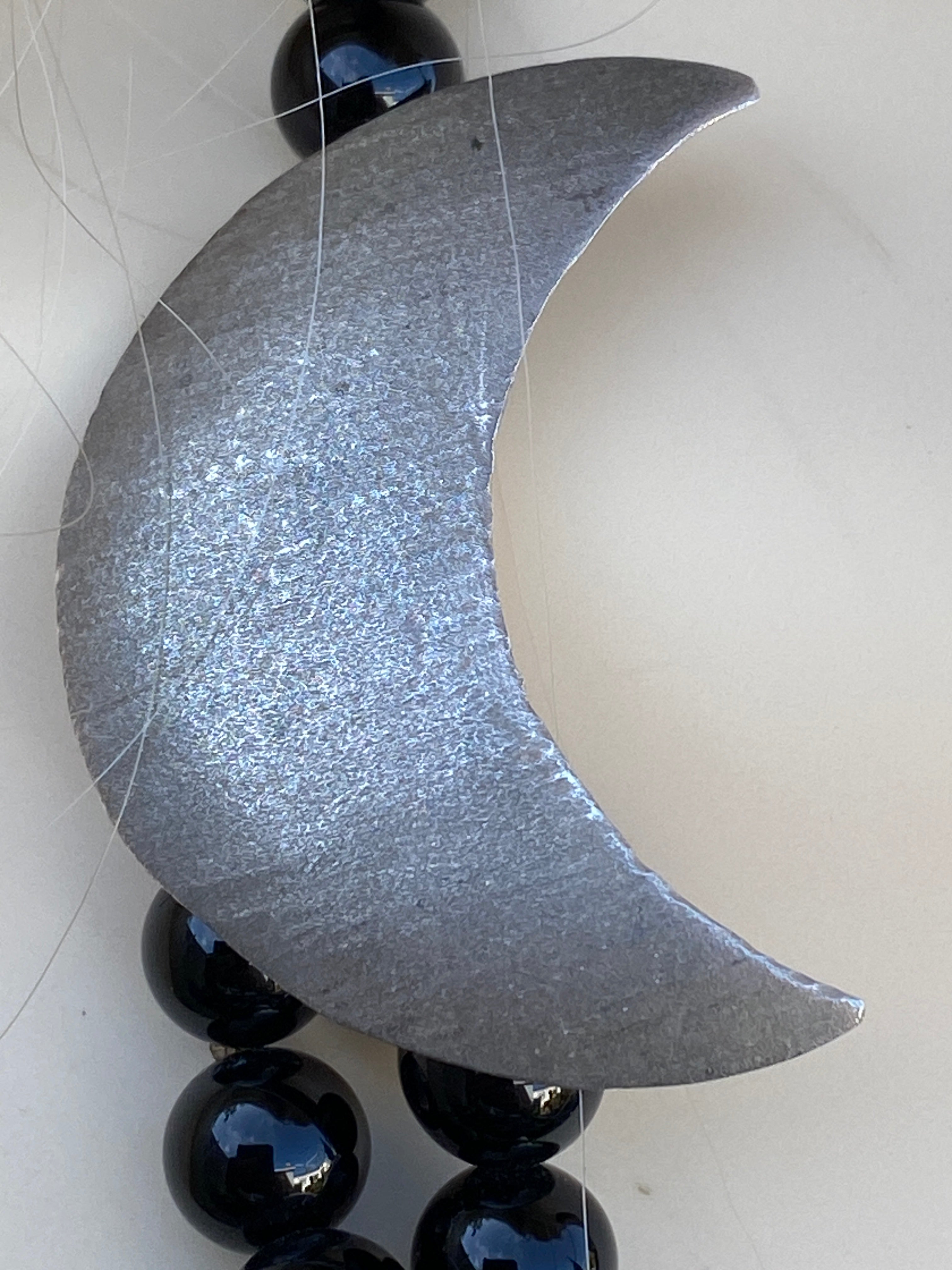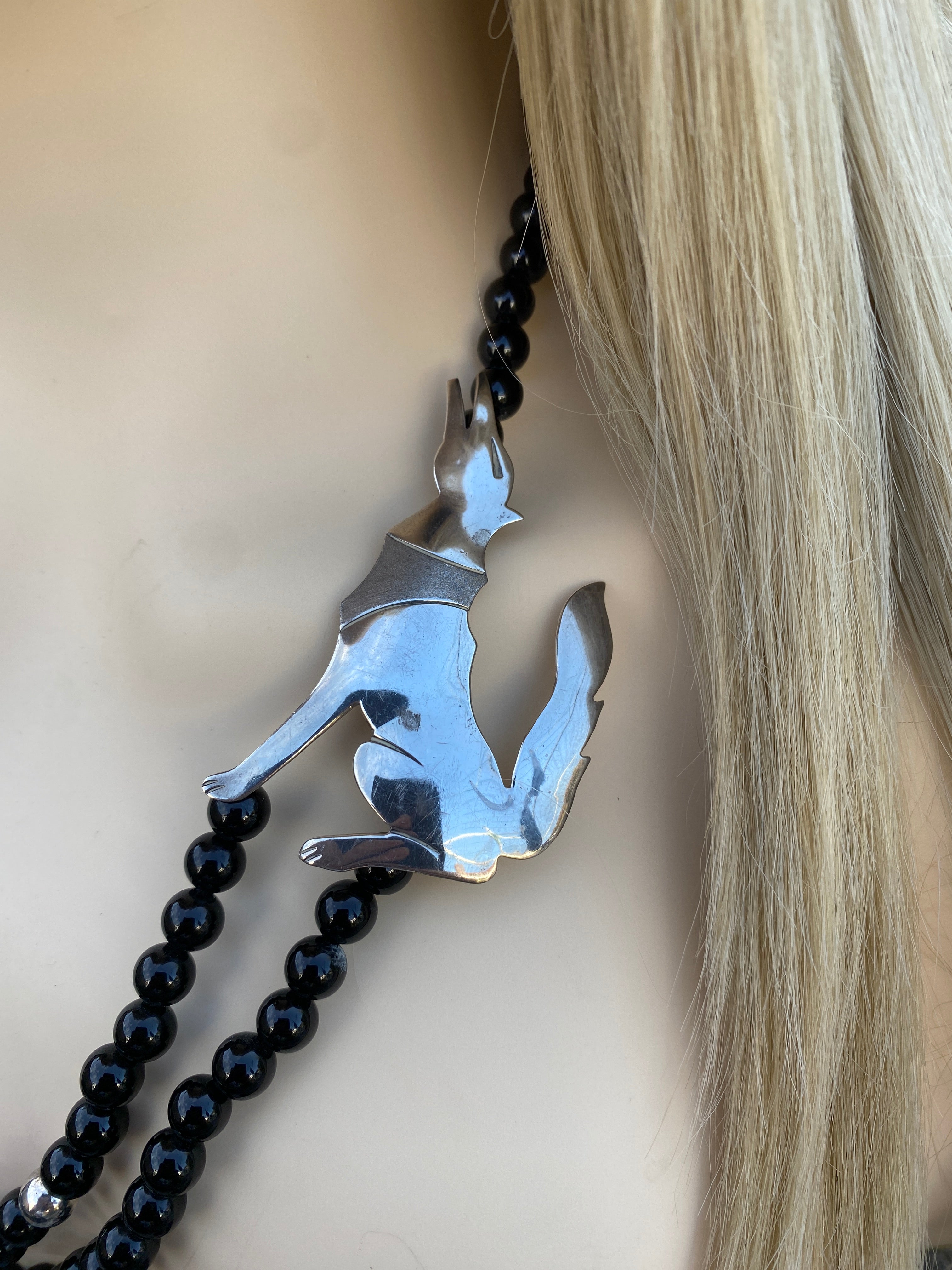 Crafted in sterling silver, this elegant necklace features a wolf howling towards a crescent moon, balanced by black onyx beads accented with sterling silver spacers. The wolf pendant stands 75mm tall, with a chain length starting at 23 inches and extending by an additional 2 inches for a perfect fit. Marked with EP Sterling, this piece arrives beautifully wrapped and includes complimentary tracked shipping or UK special delivery.