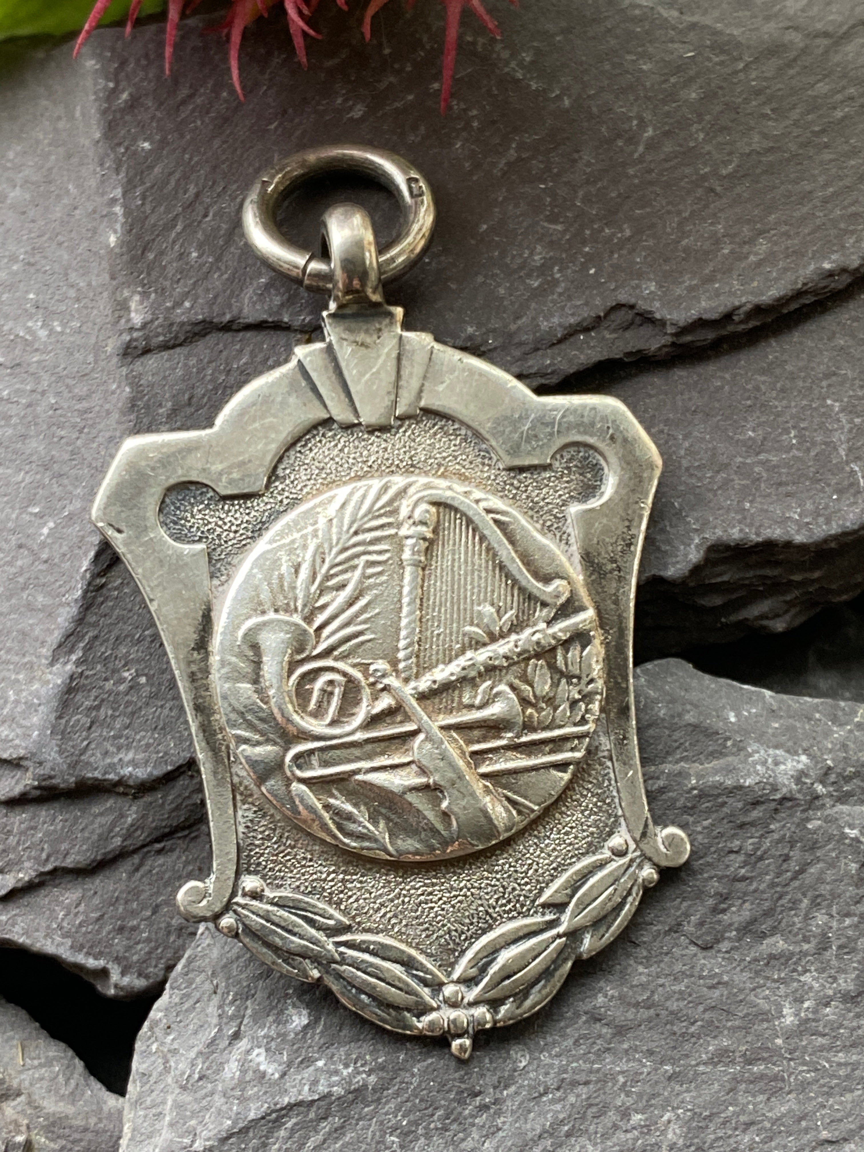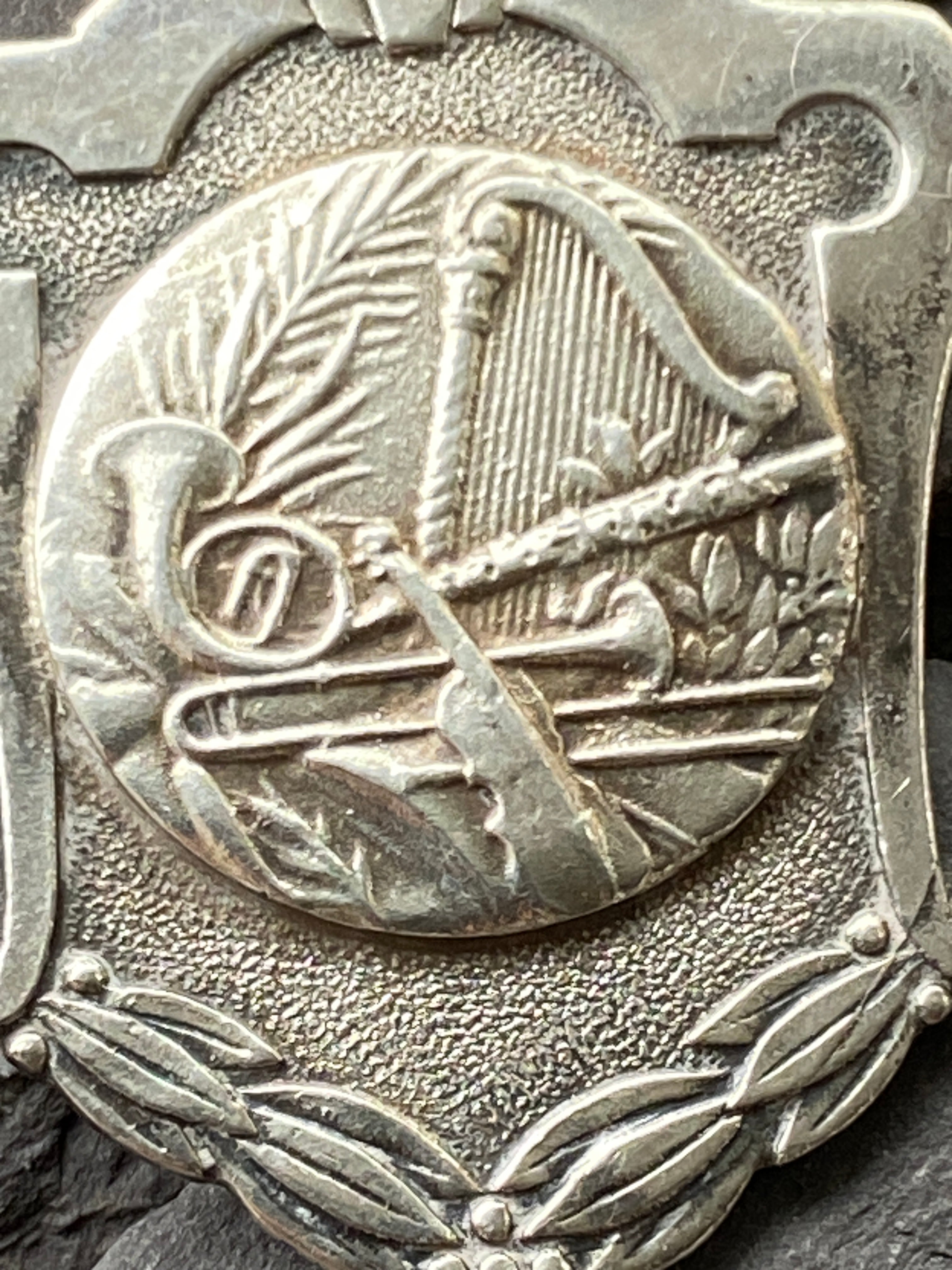 Decorated with several different wind and string instruments with laurel leaf decoration.