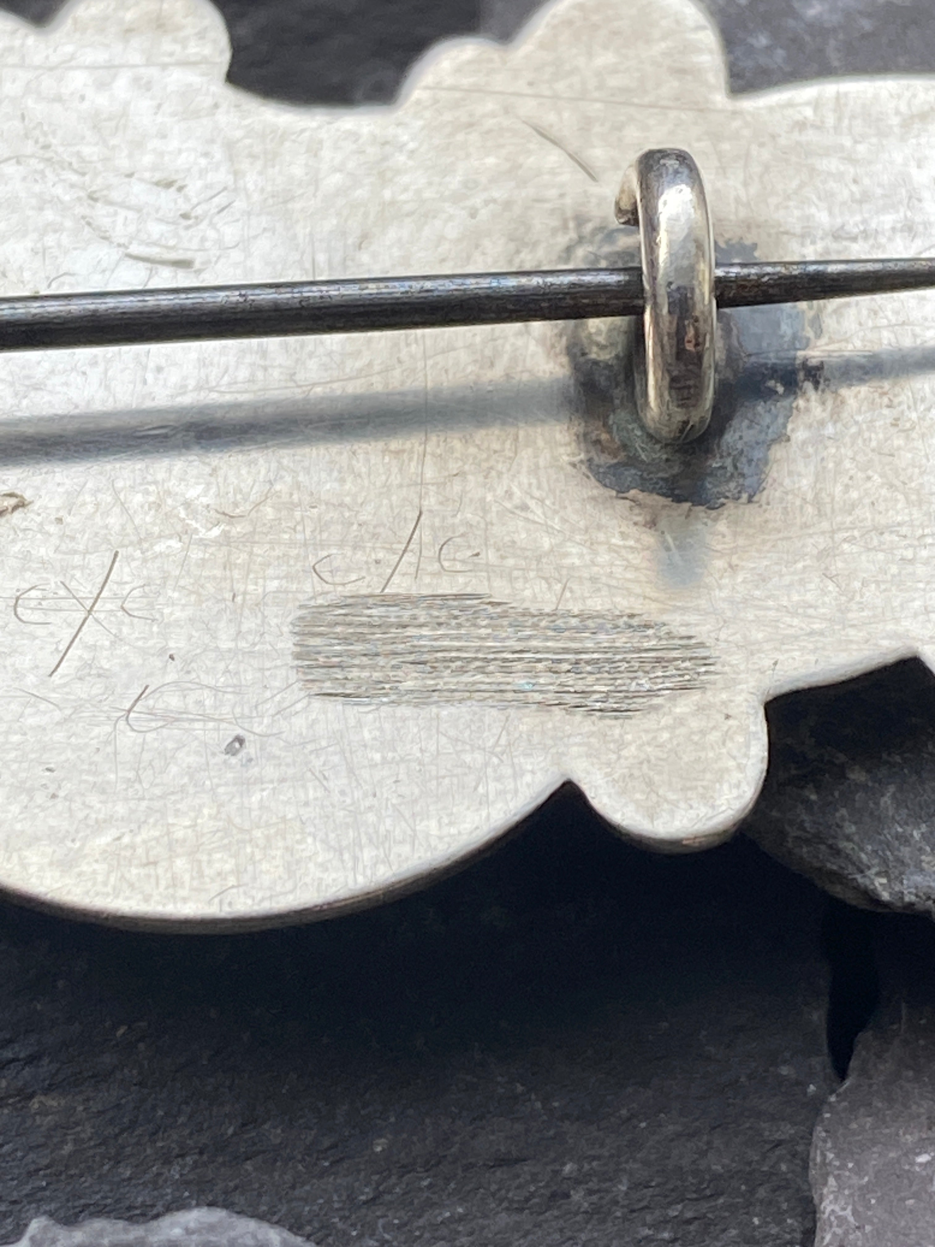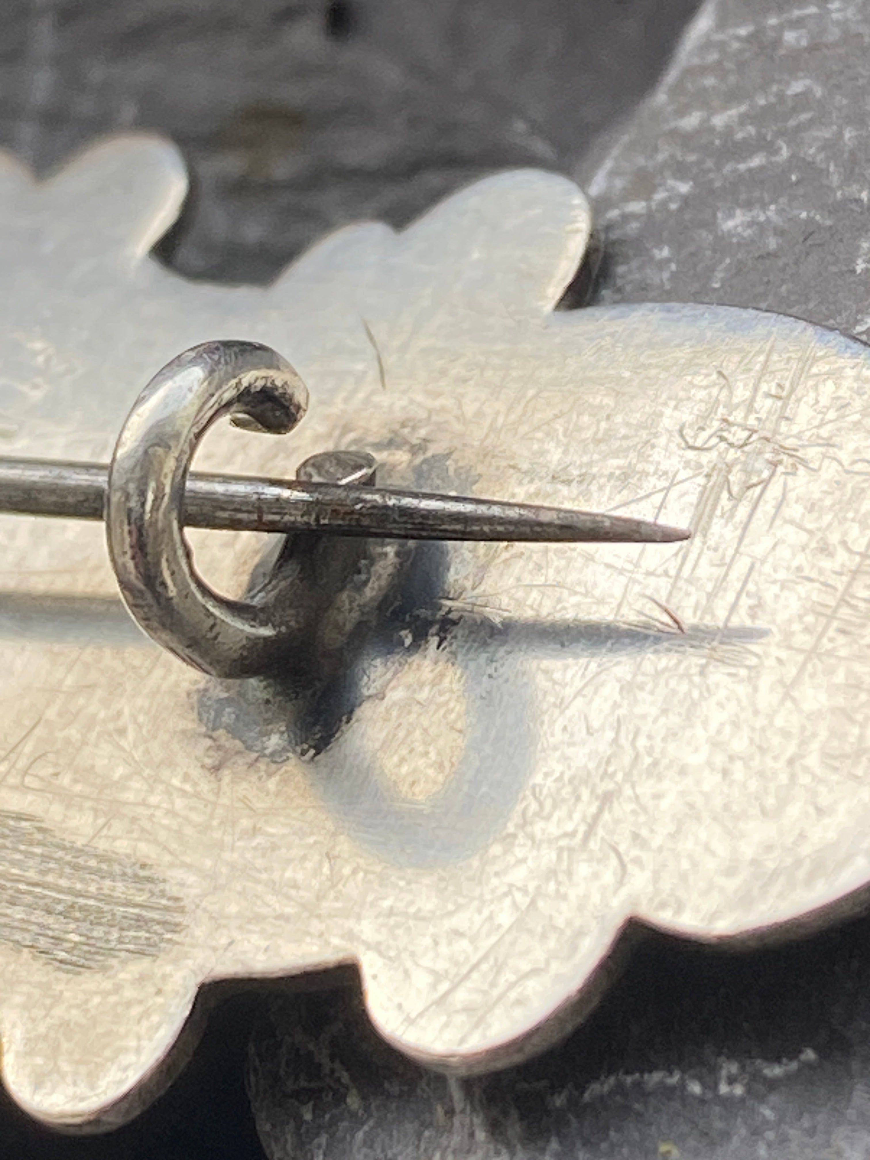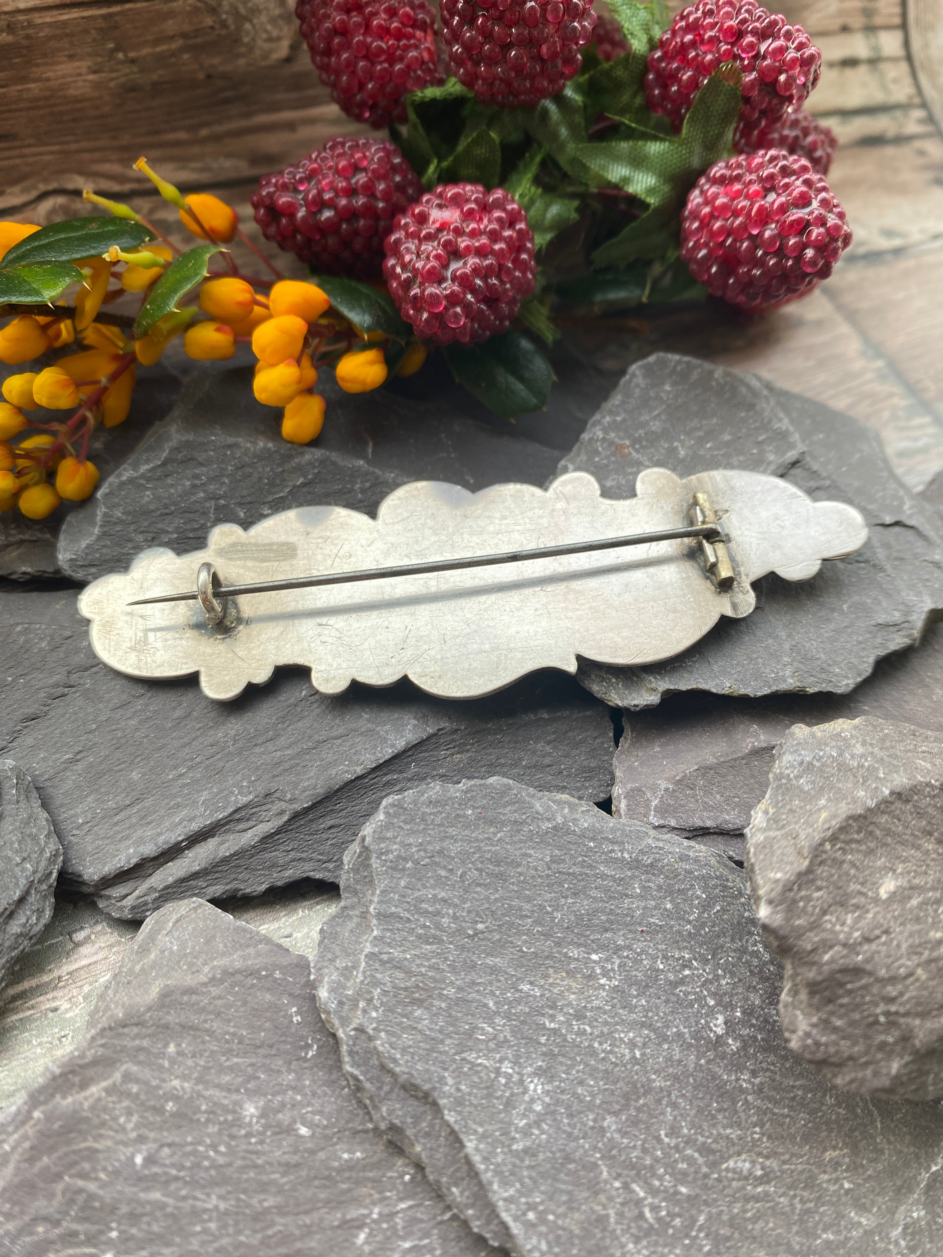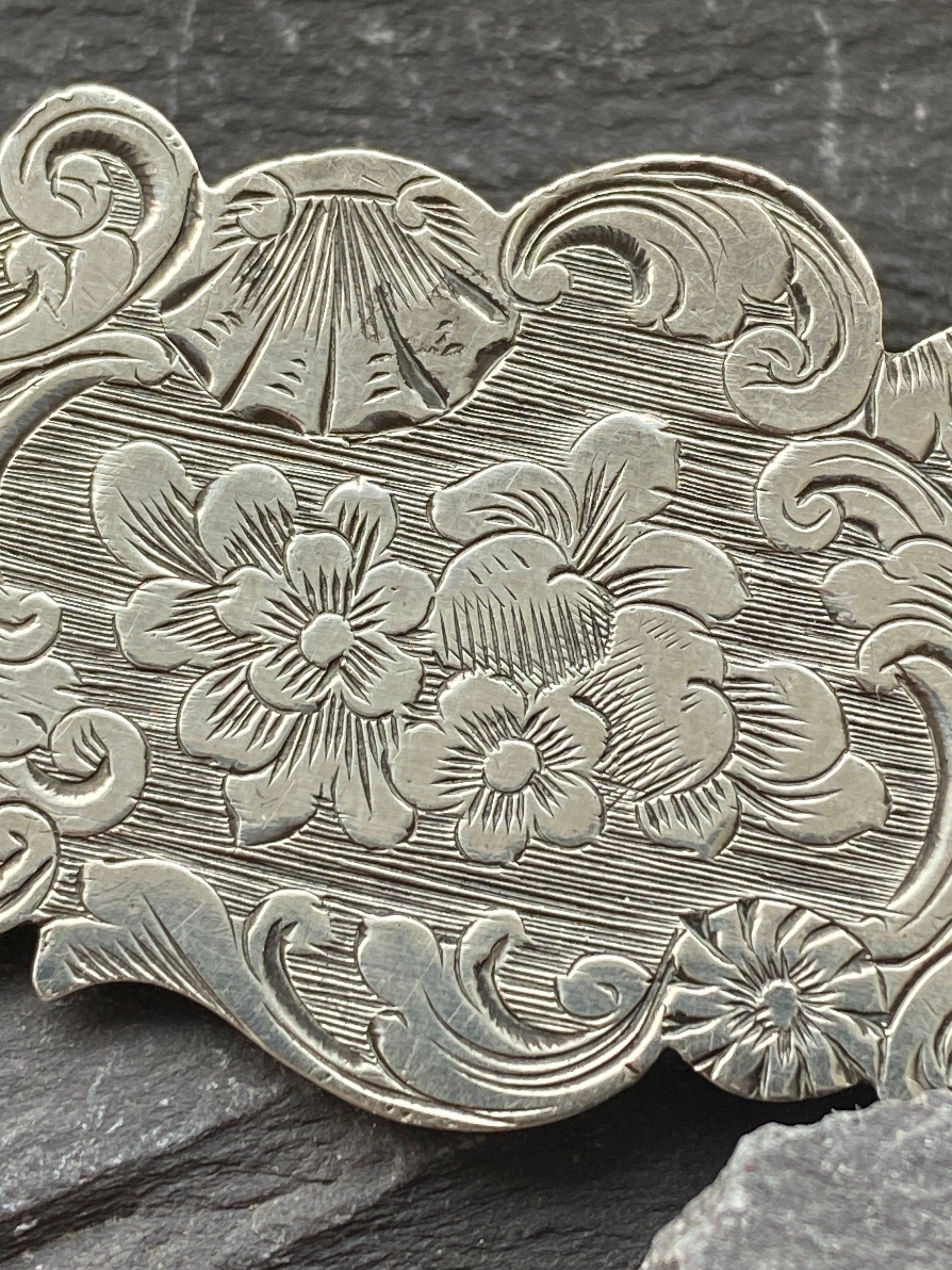 A beautiful Victorian sterling silver brooch with intricate hand chased detail of flowers and shell.