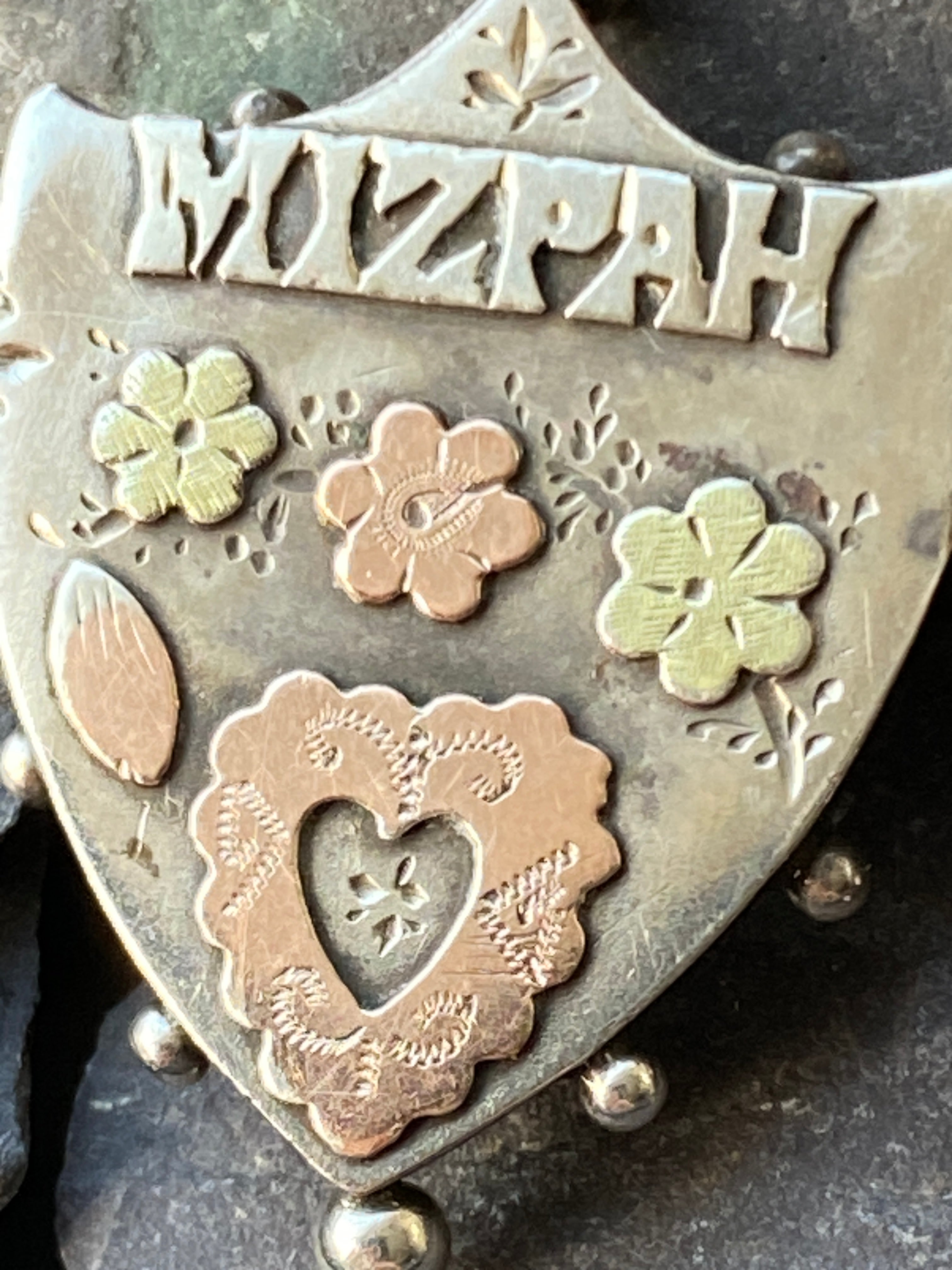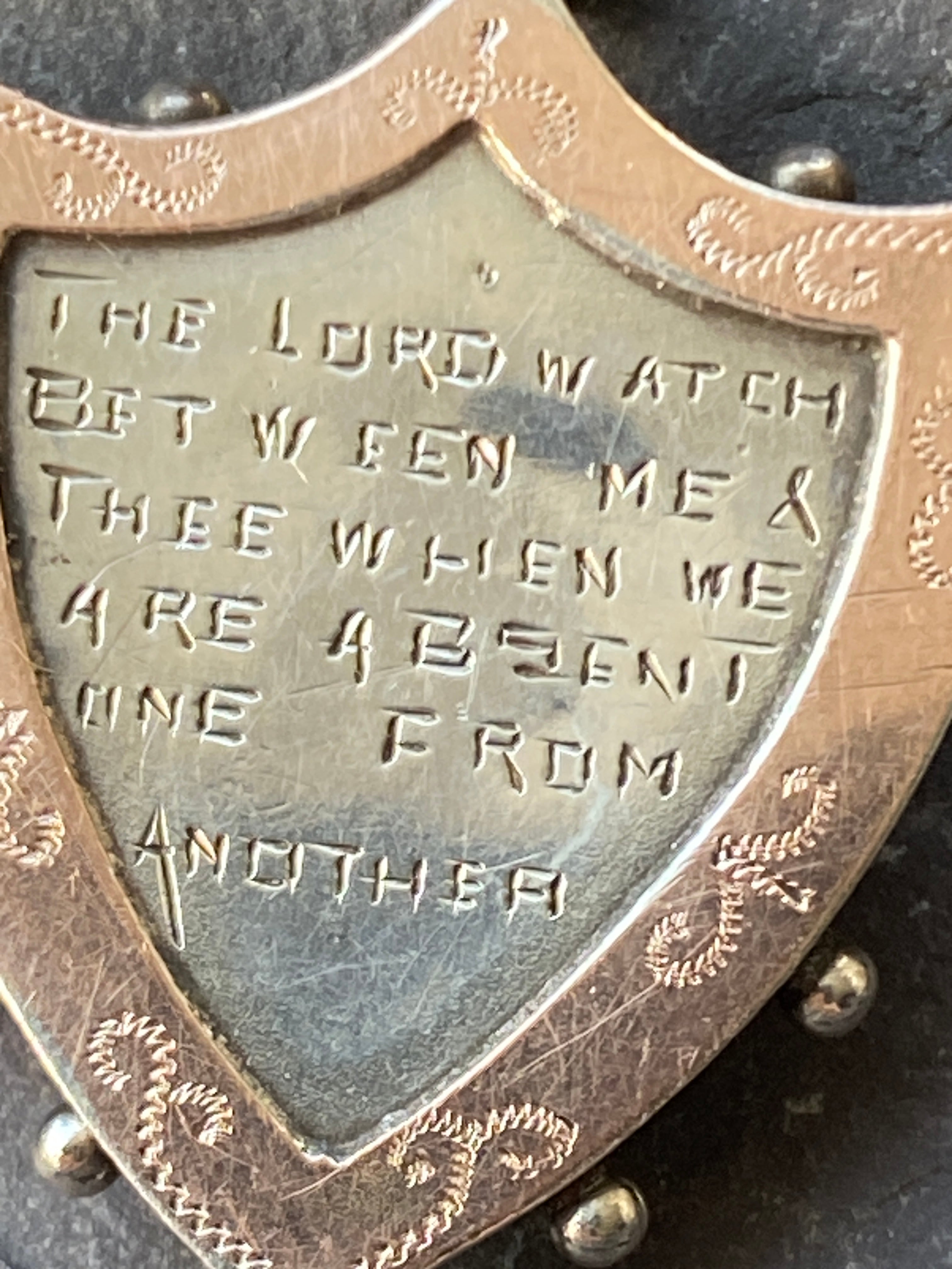 Double shield formation with hearts , forget me nots and the sentence from Genesis 'The lord watch between me and thee when we are absent from another'