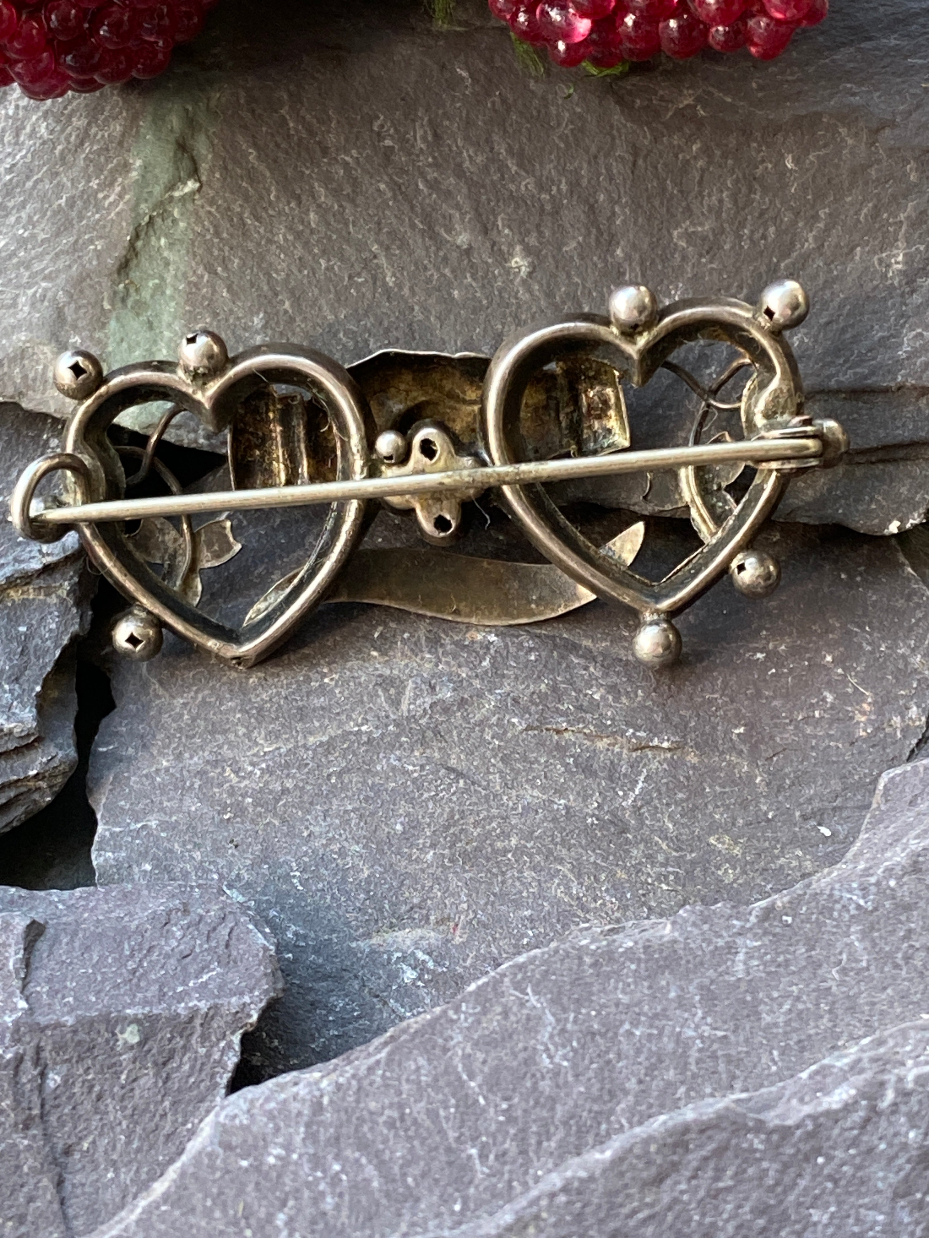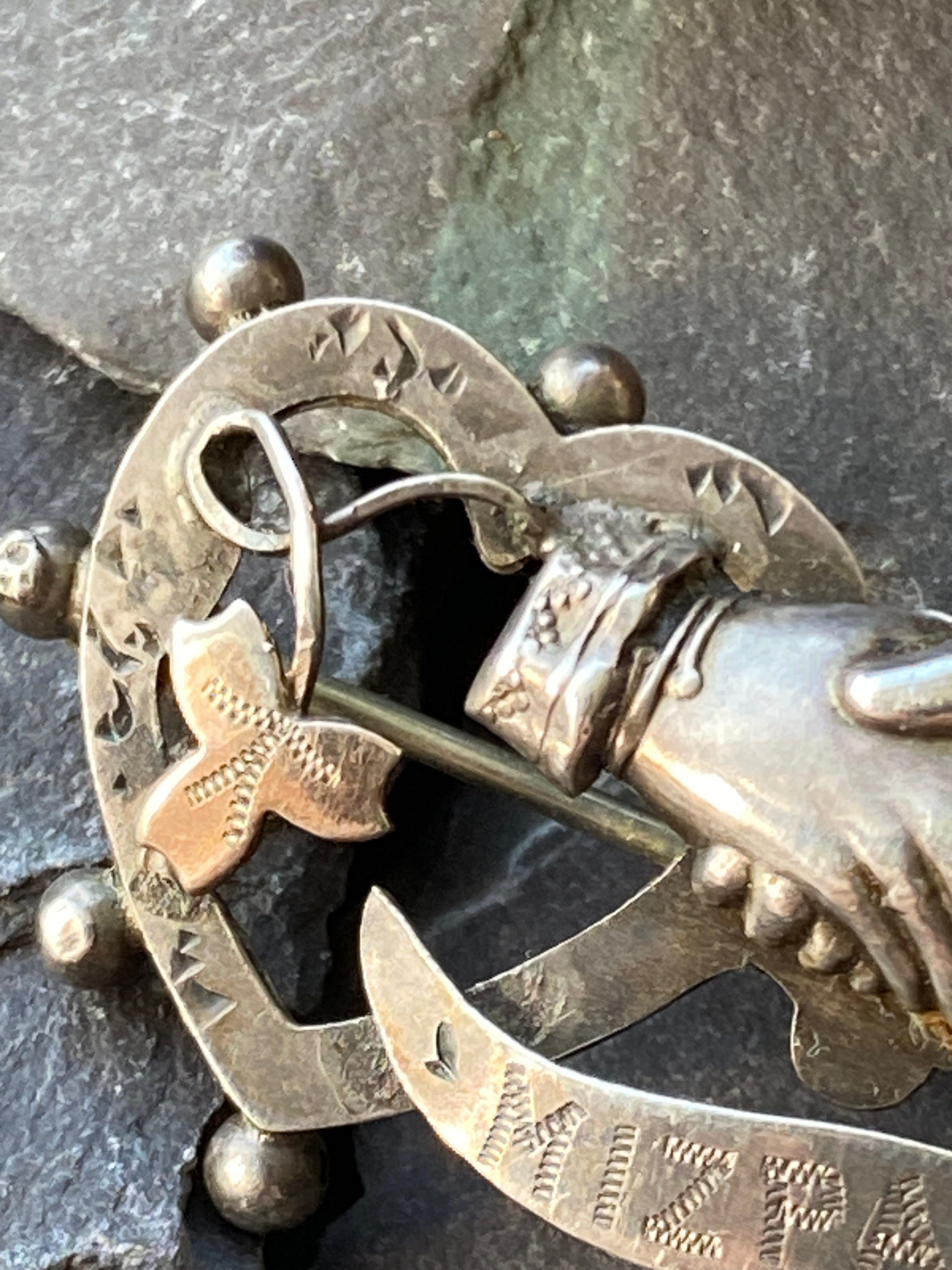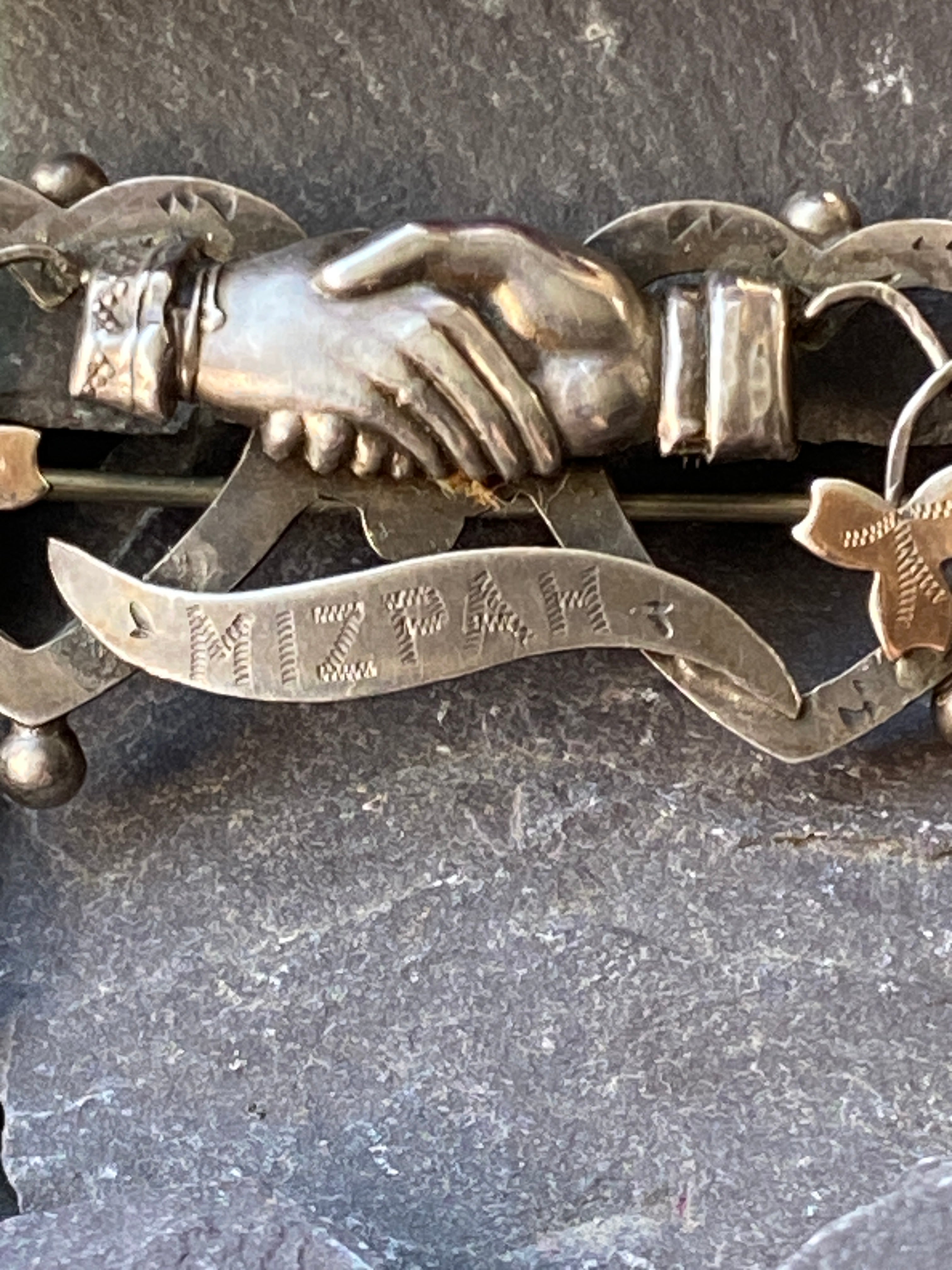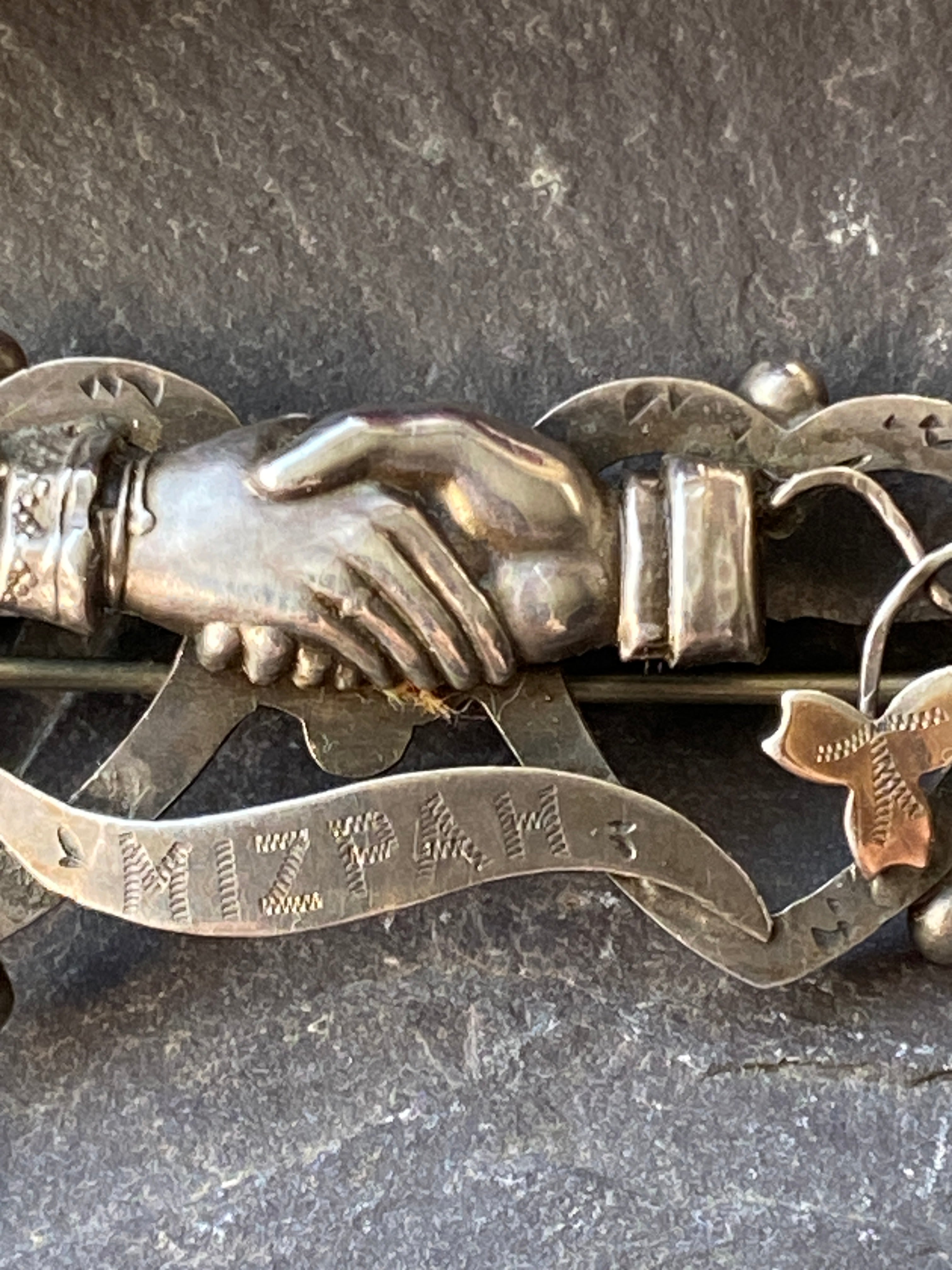 A beautiful example of Antique sentiment jewellery. Set in sterling silver a male and female hand clasp between two hearts with a chased inscription 'Mizpah'.