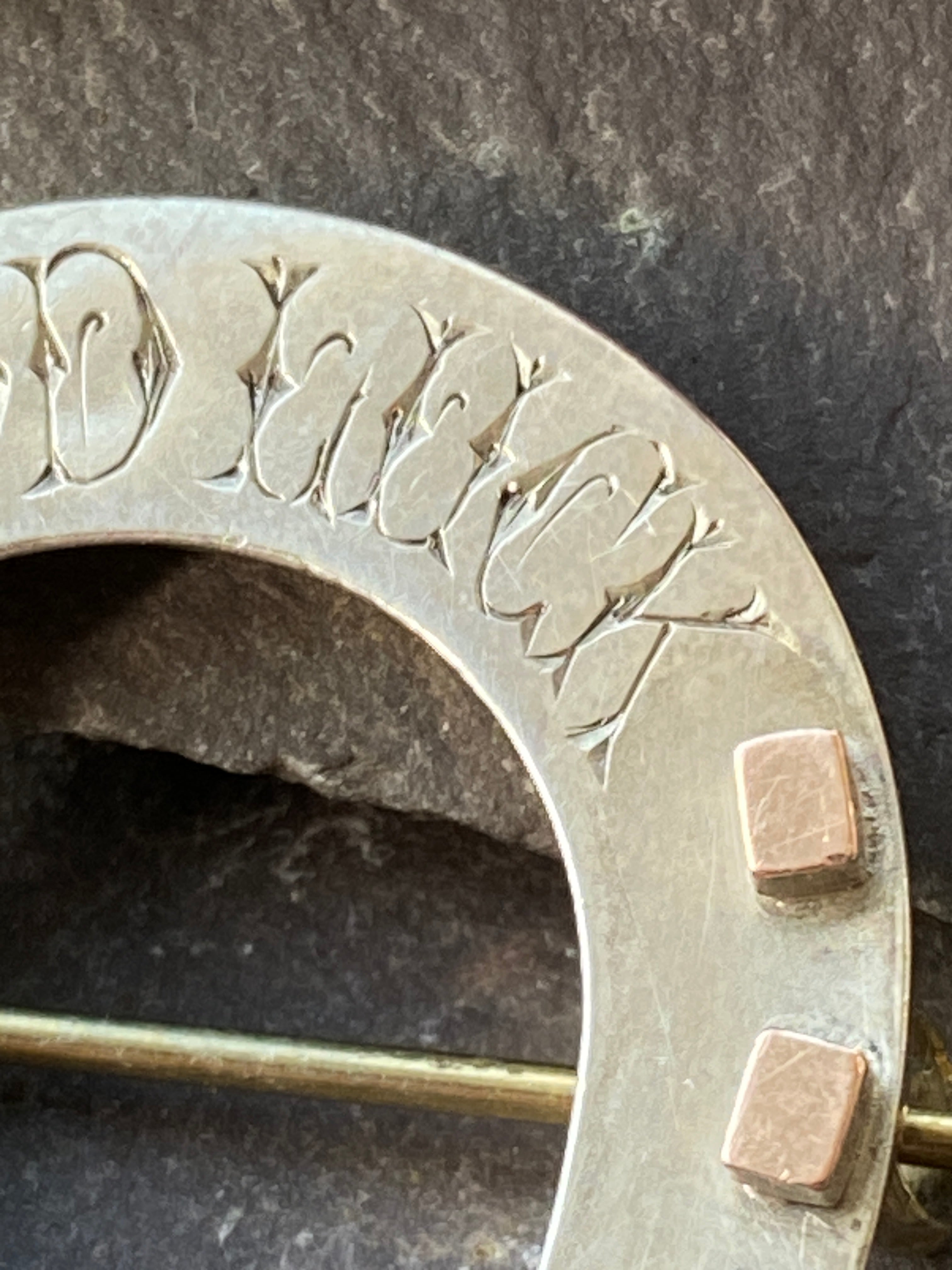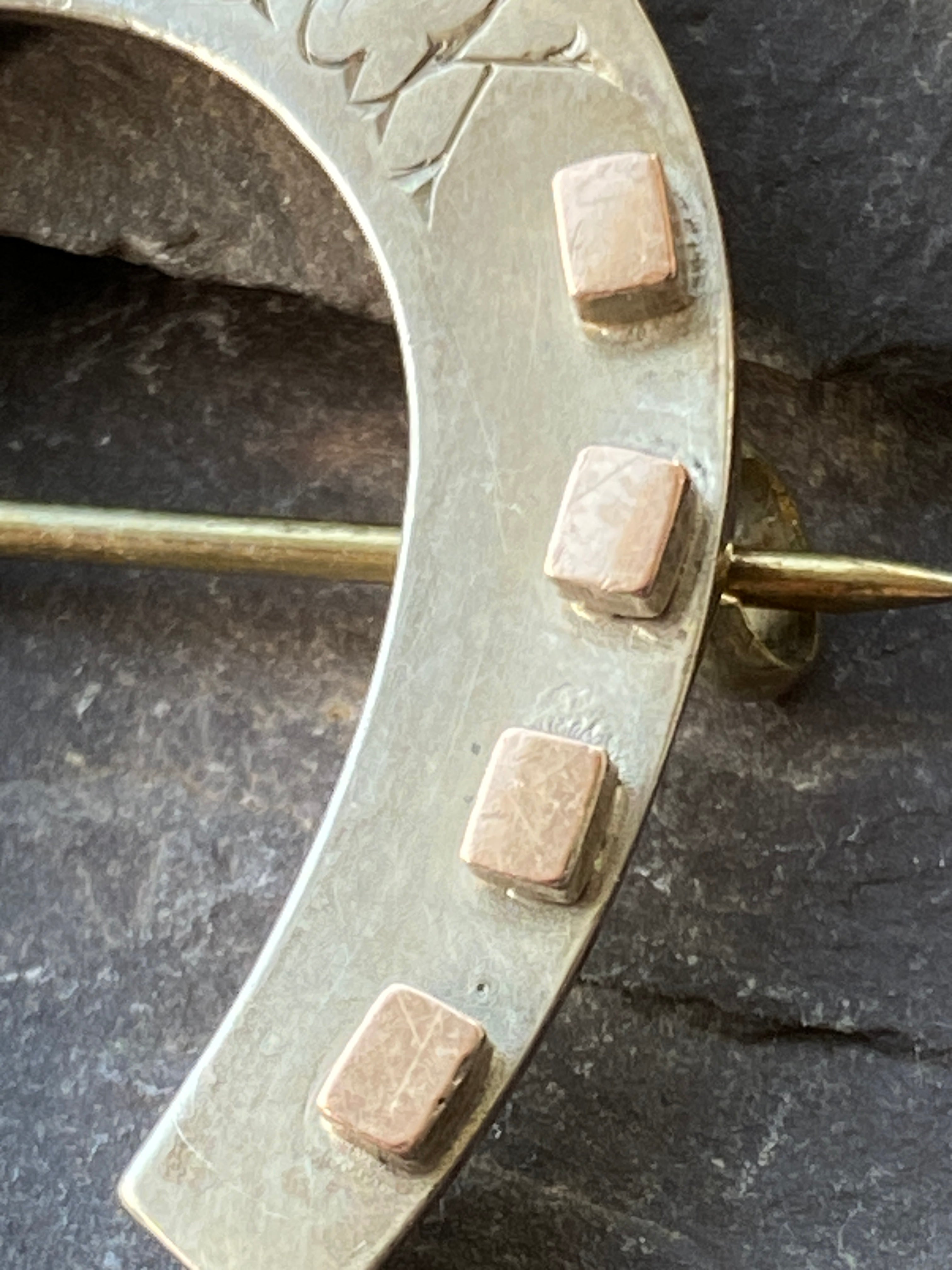 An antique Victorian sterling silver horseshoe brooch with gold accents to the nail heads.