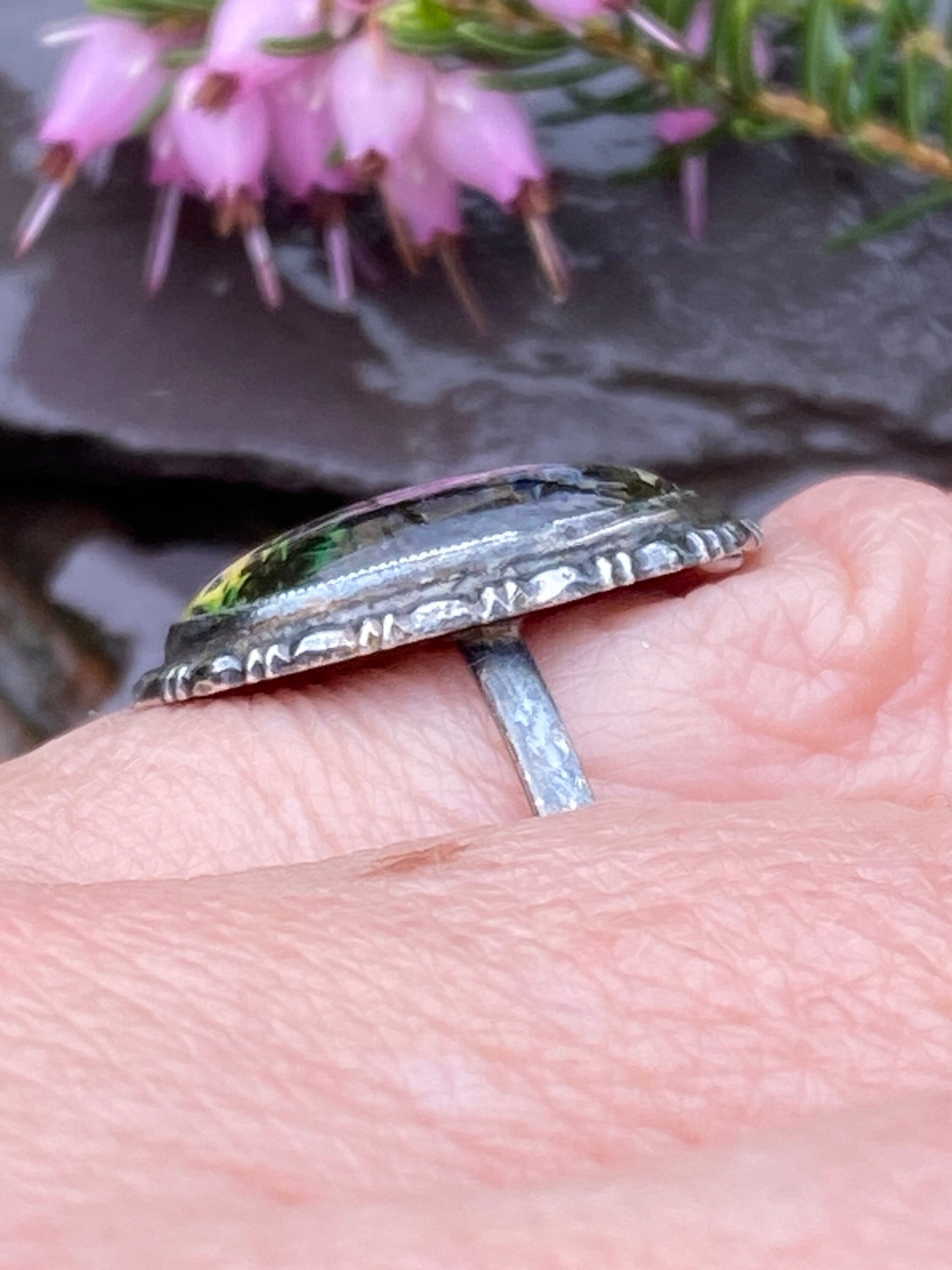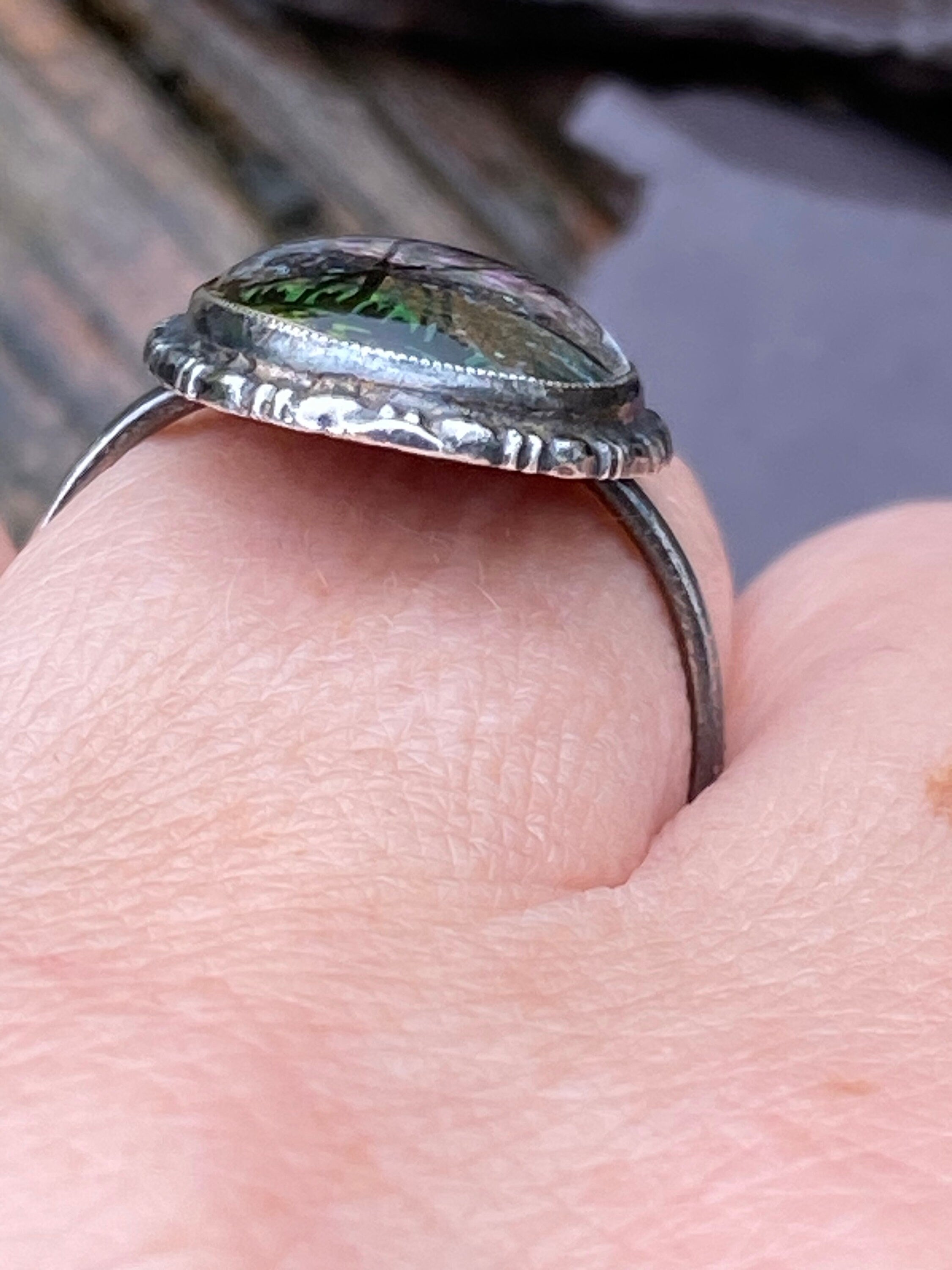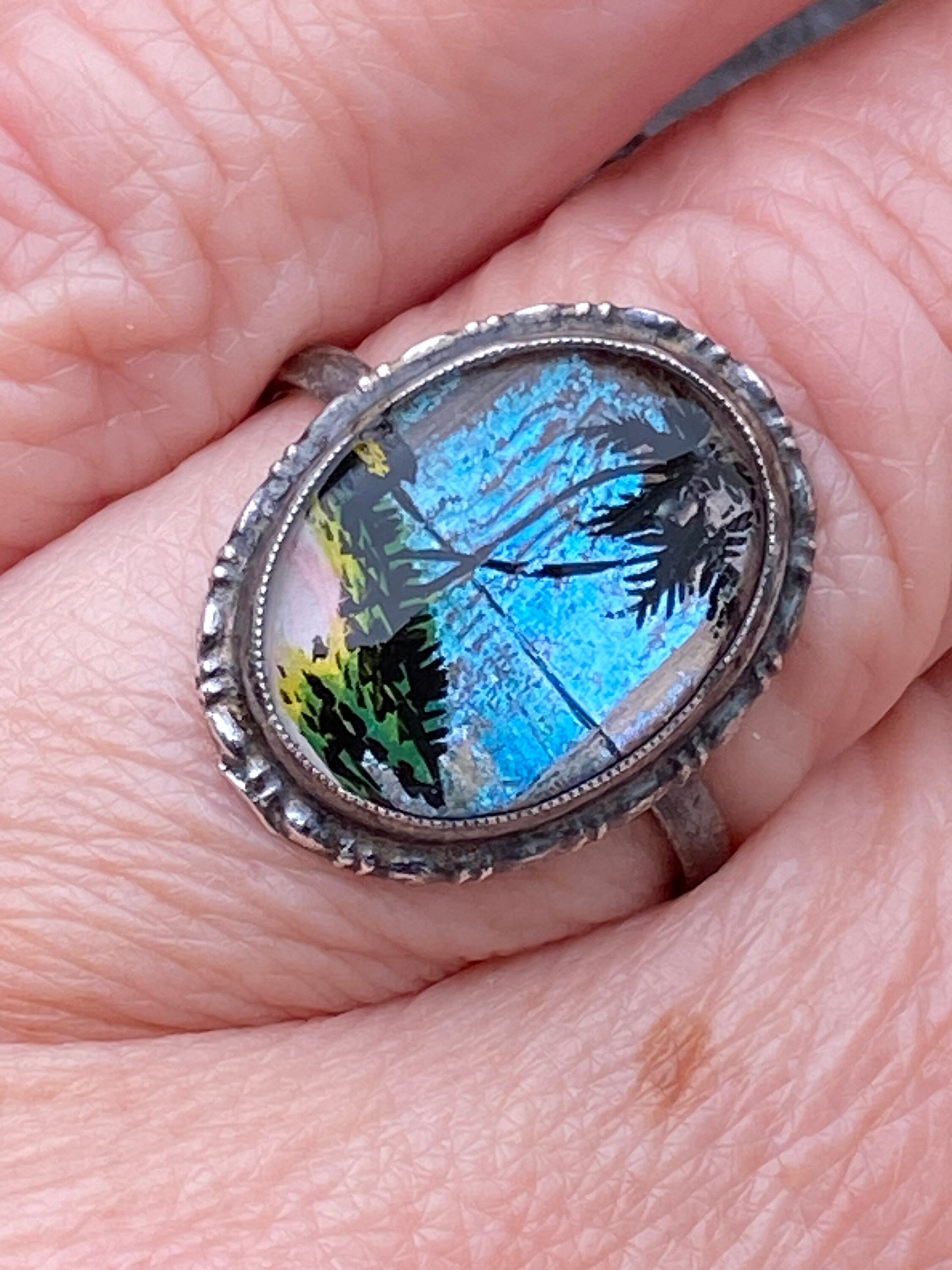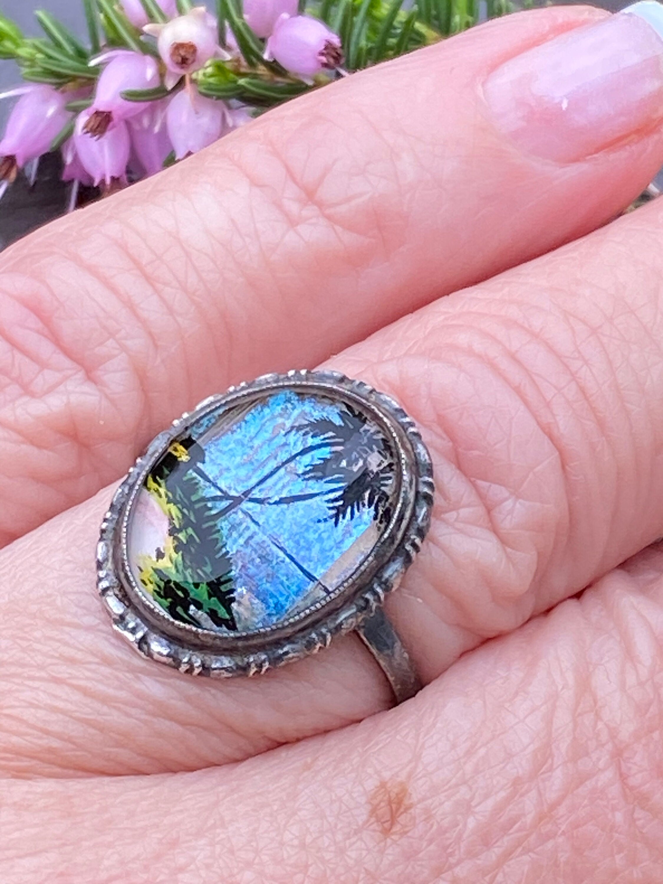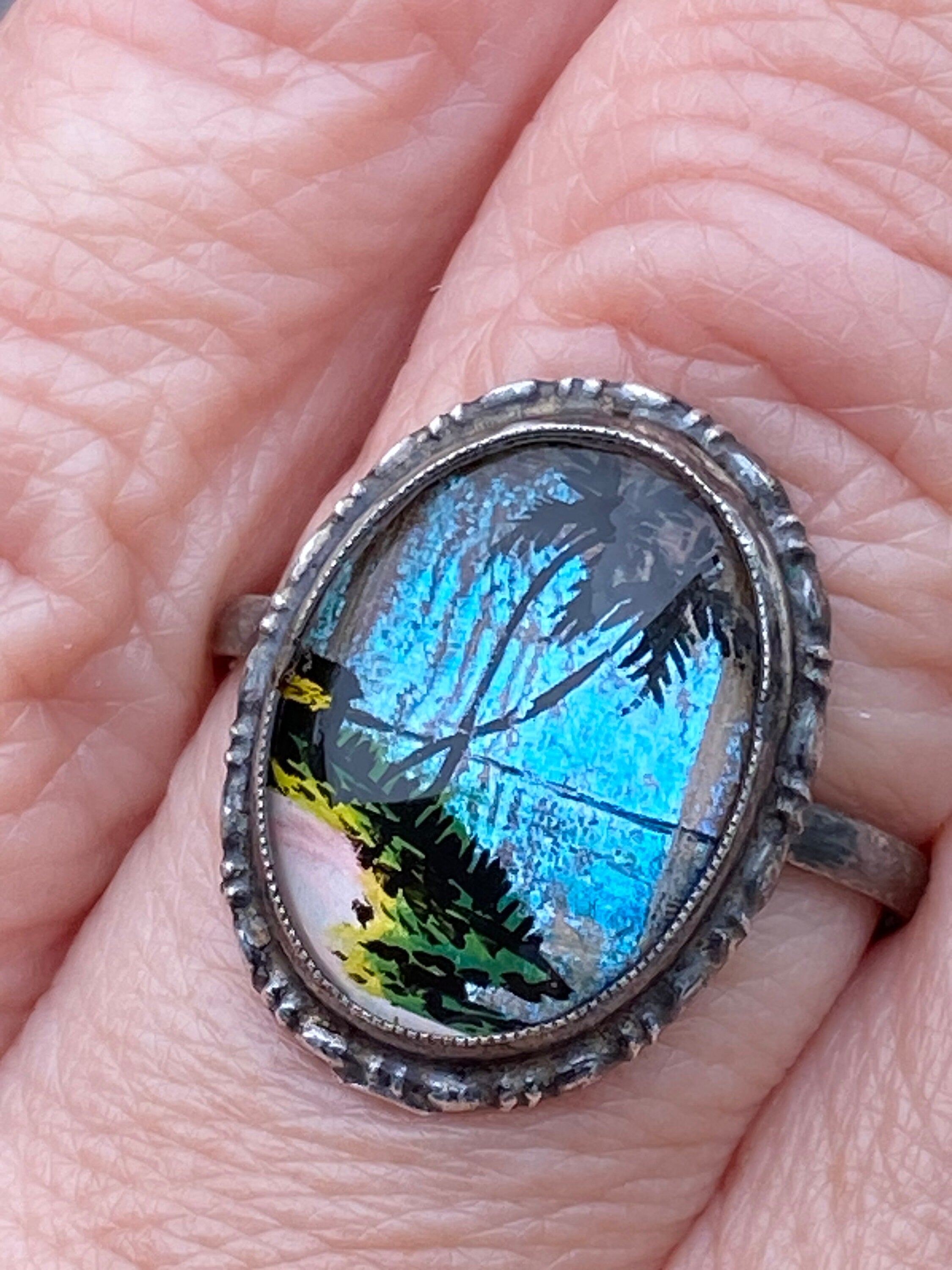 This exquisite butterfly wing ring is an iconic example of Art Deco jewelry. Featuring genuine sterling silver, painted butterfly wing, and stamped with TLM sterling England, this ring will make an elegant and timeless addition to any jewelry collection. Crafted by the renowned Thomas Mott London, this ring comes in a finger size of P or 7 3/4 US, and arrives in a gift box for the perfect presentation.