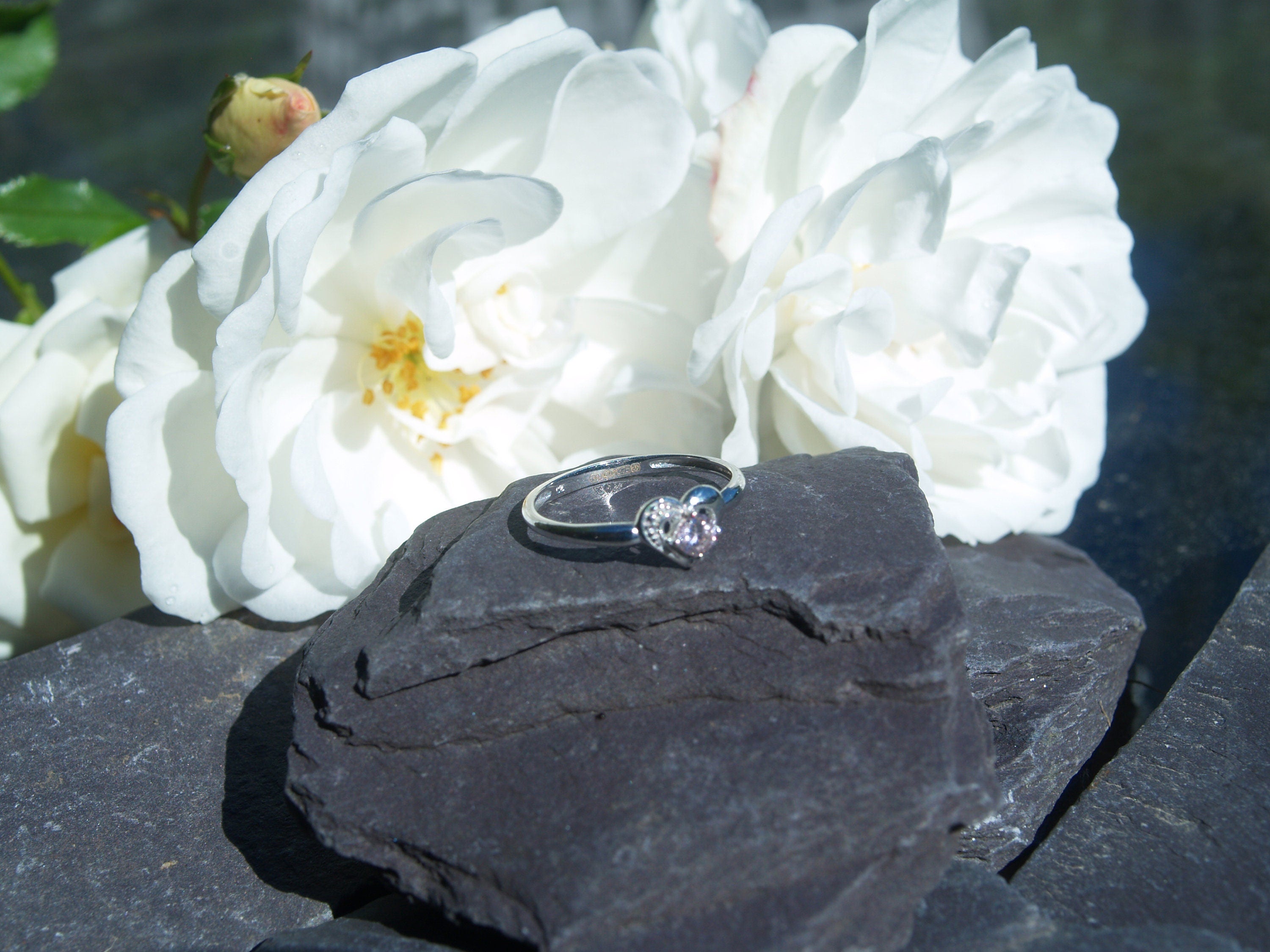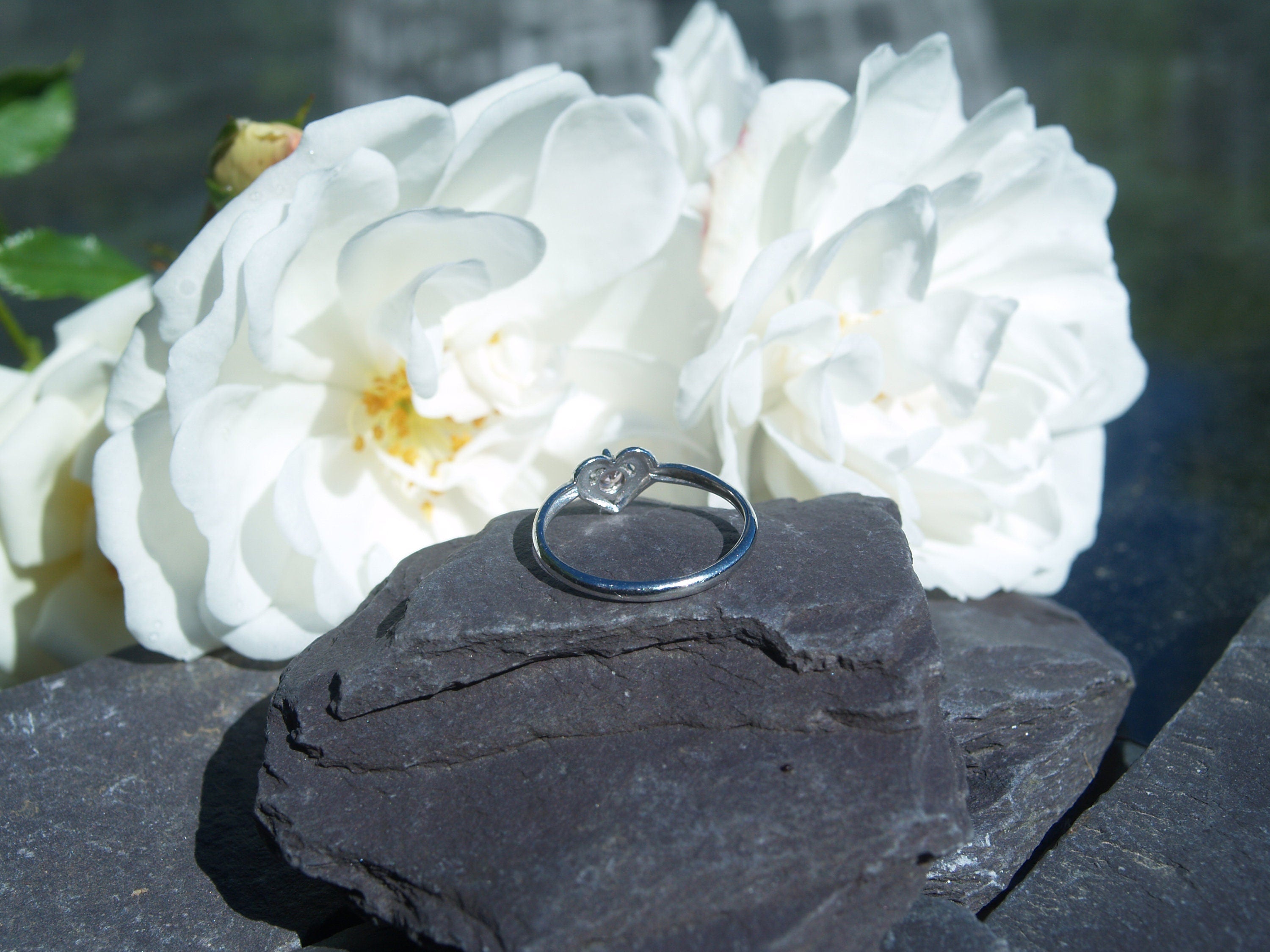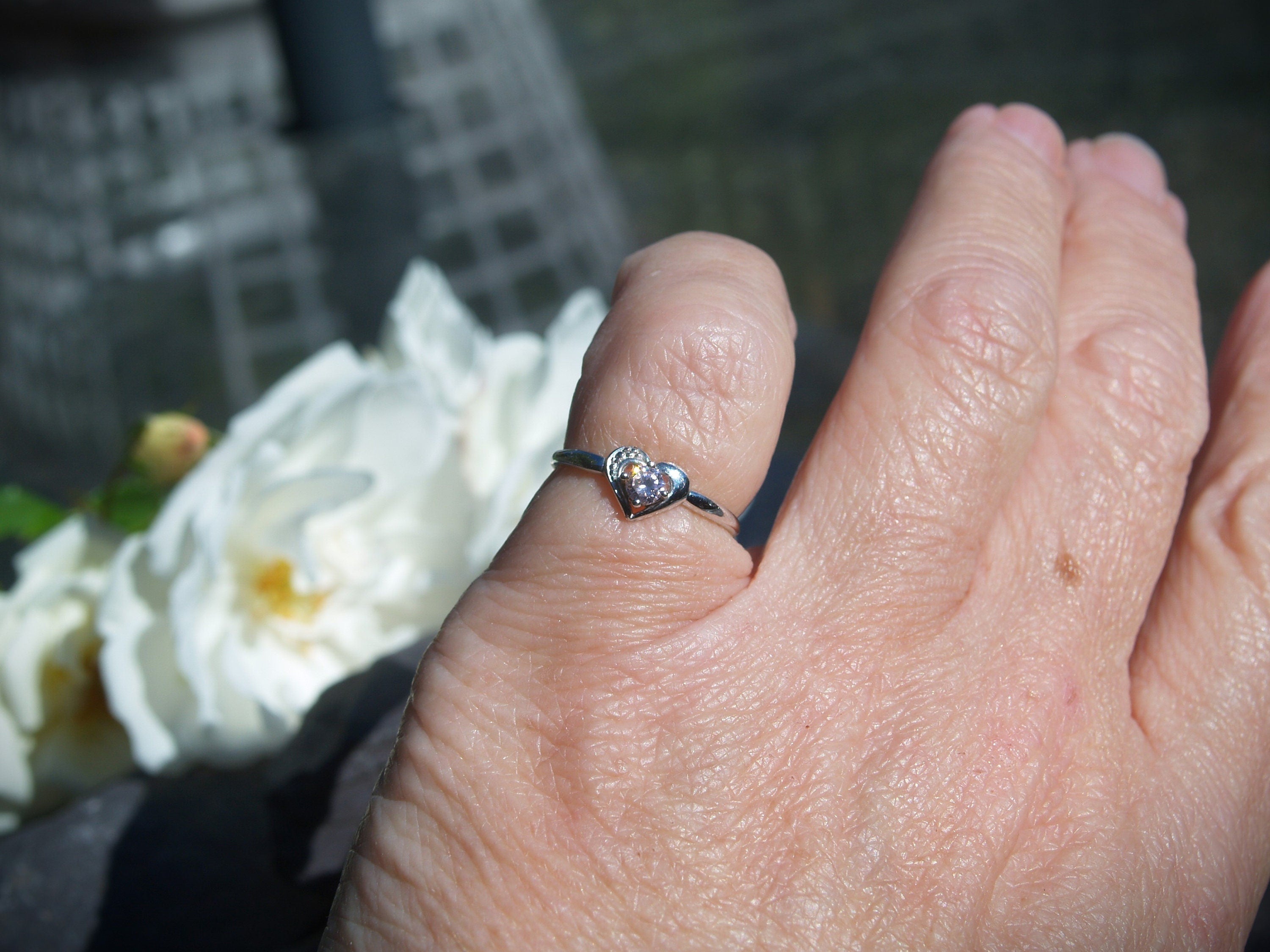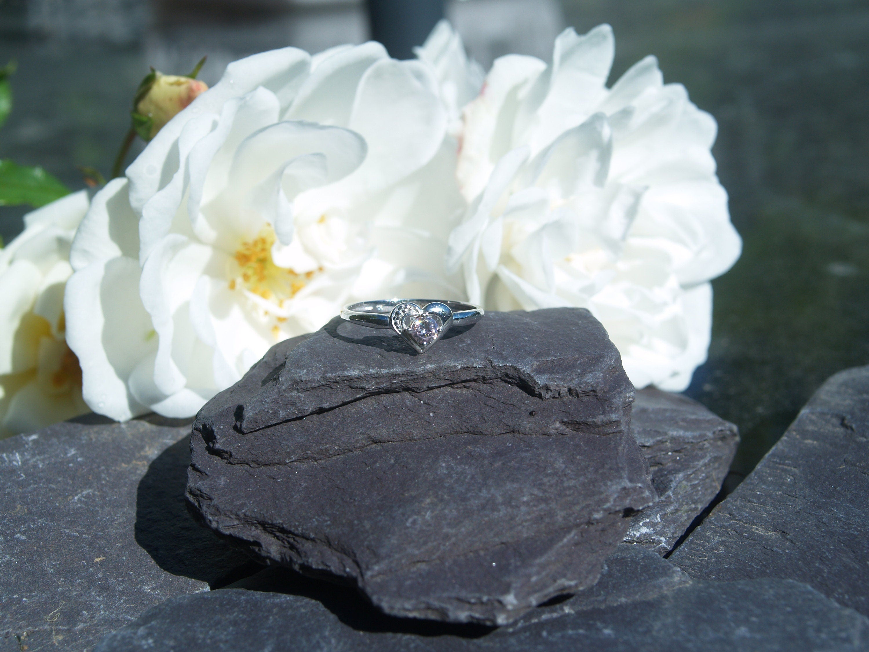 9ct white gold ring set with a pink Cubic Zirconia in a heart setting.