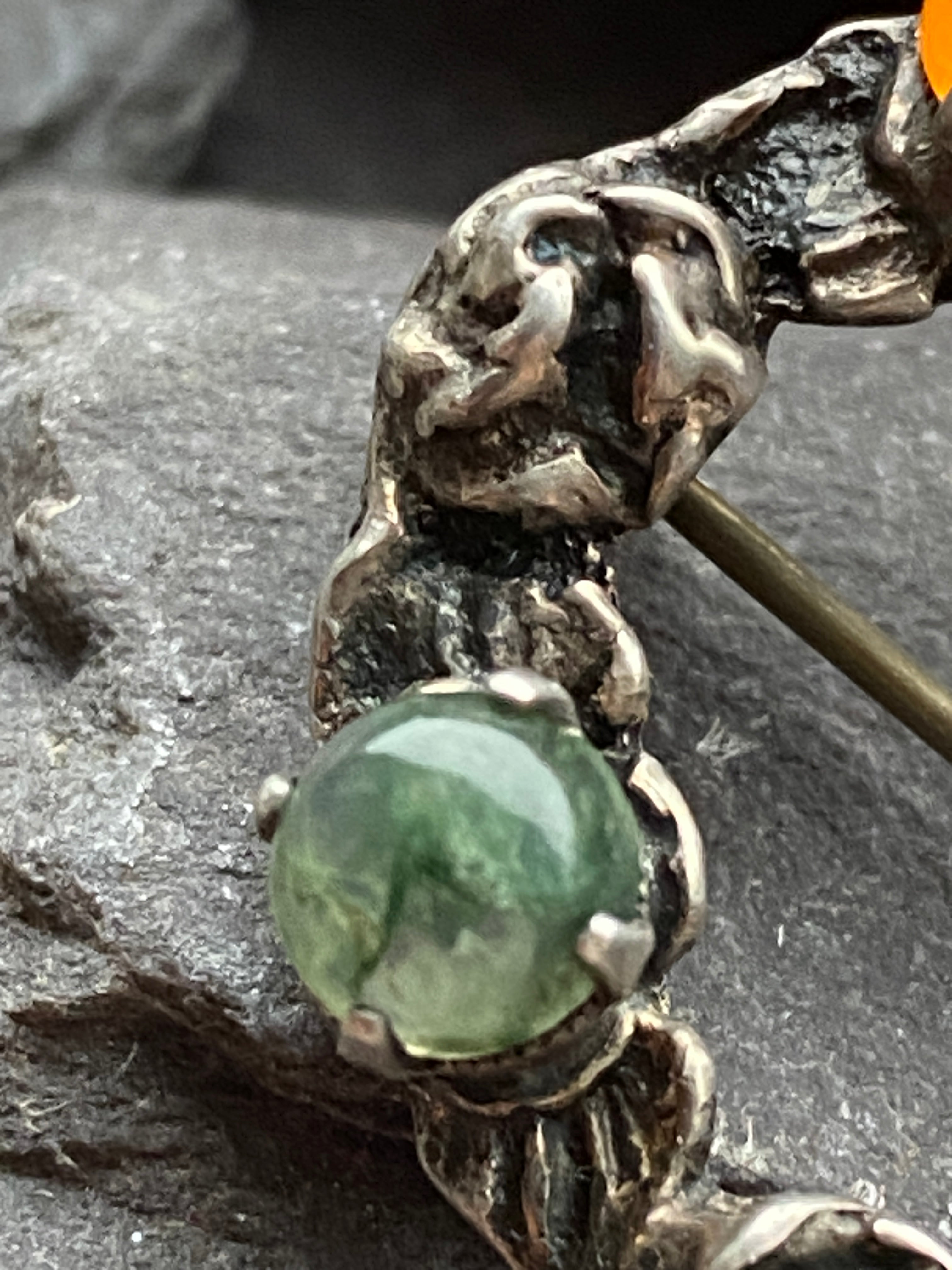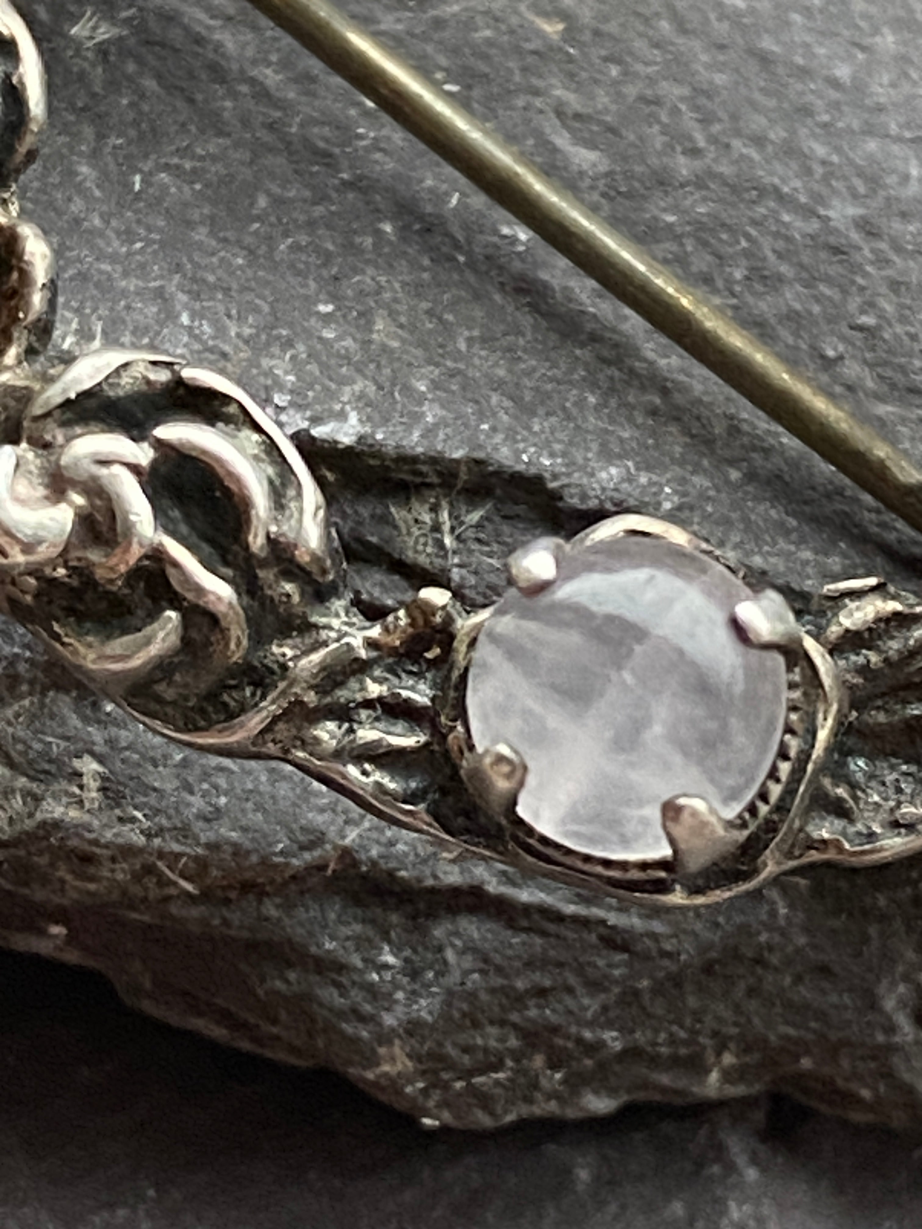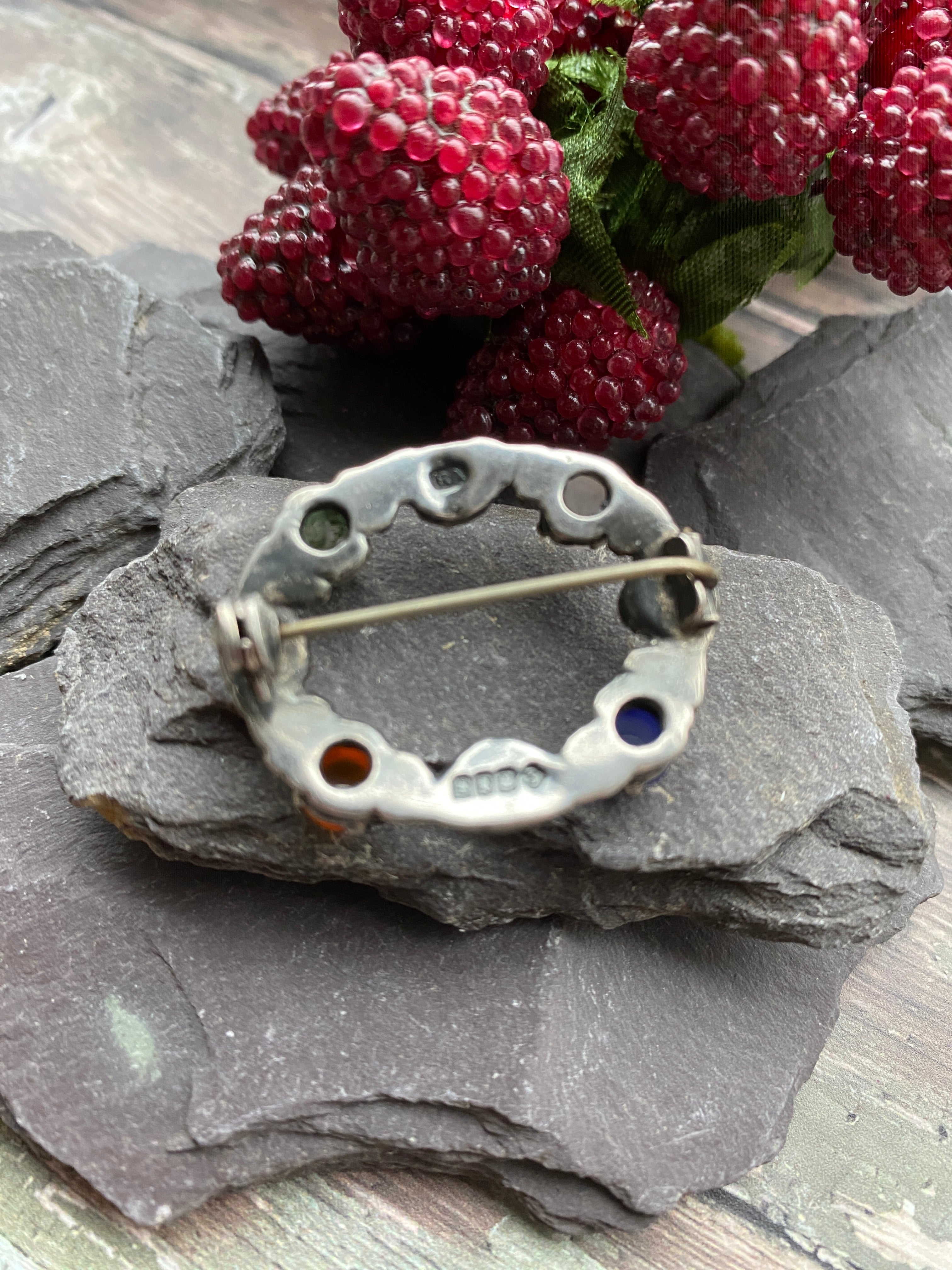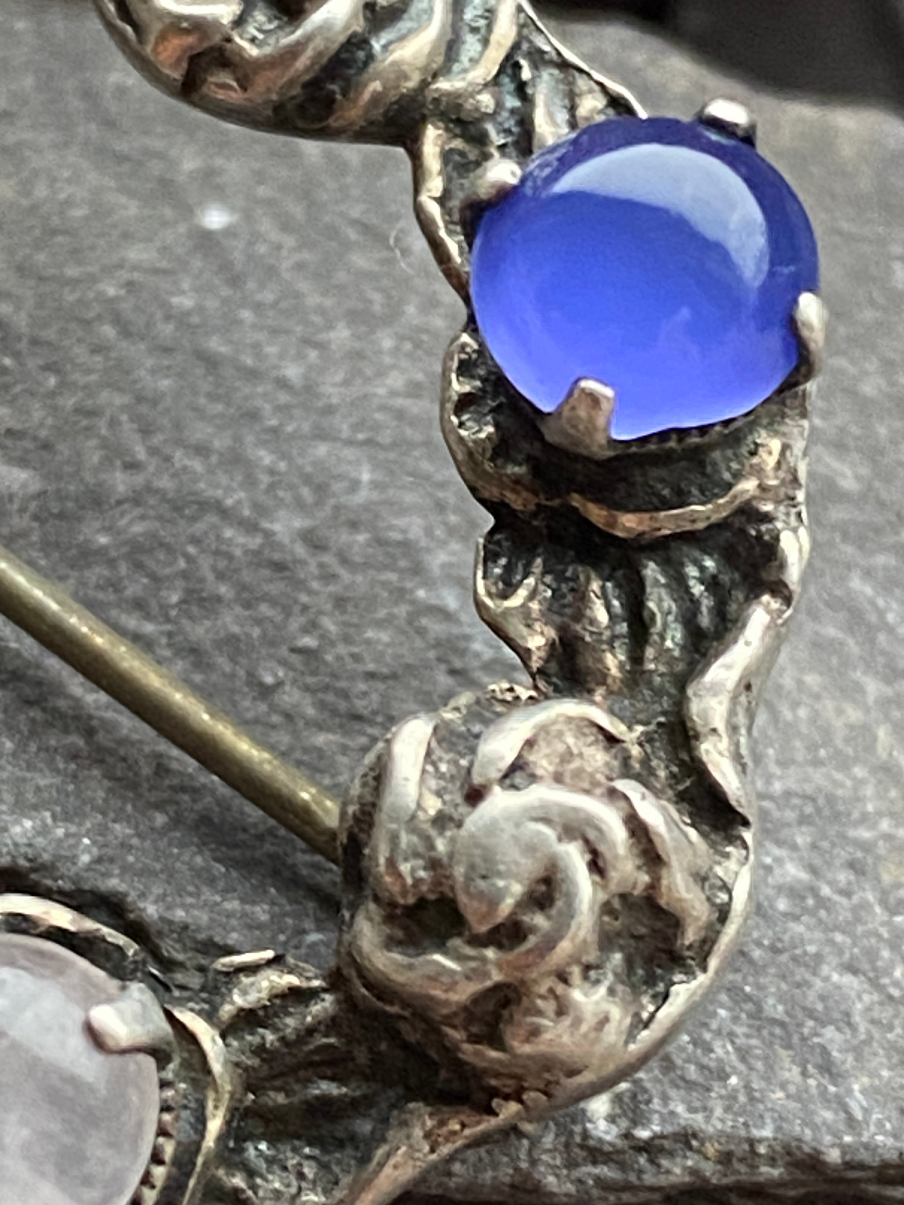 A sterling silver brooch set with cabochons of Agates and Chalcedony in a wreath of roses