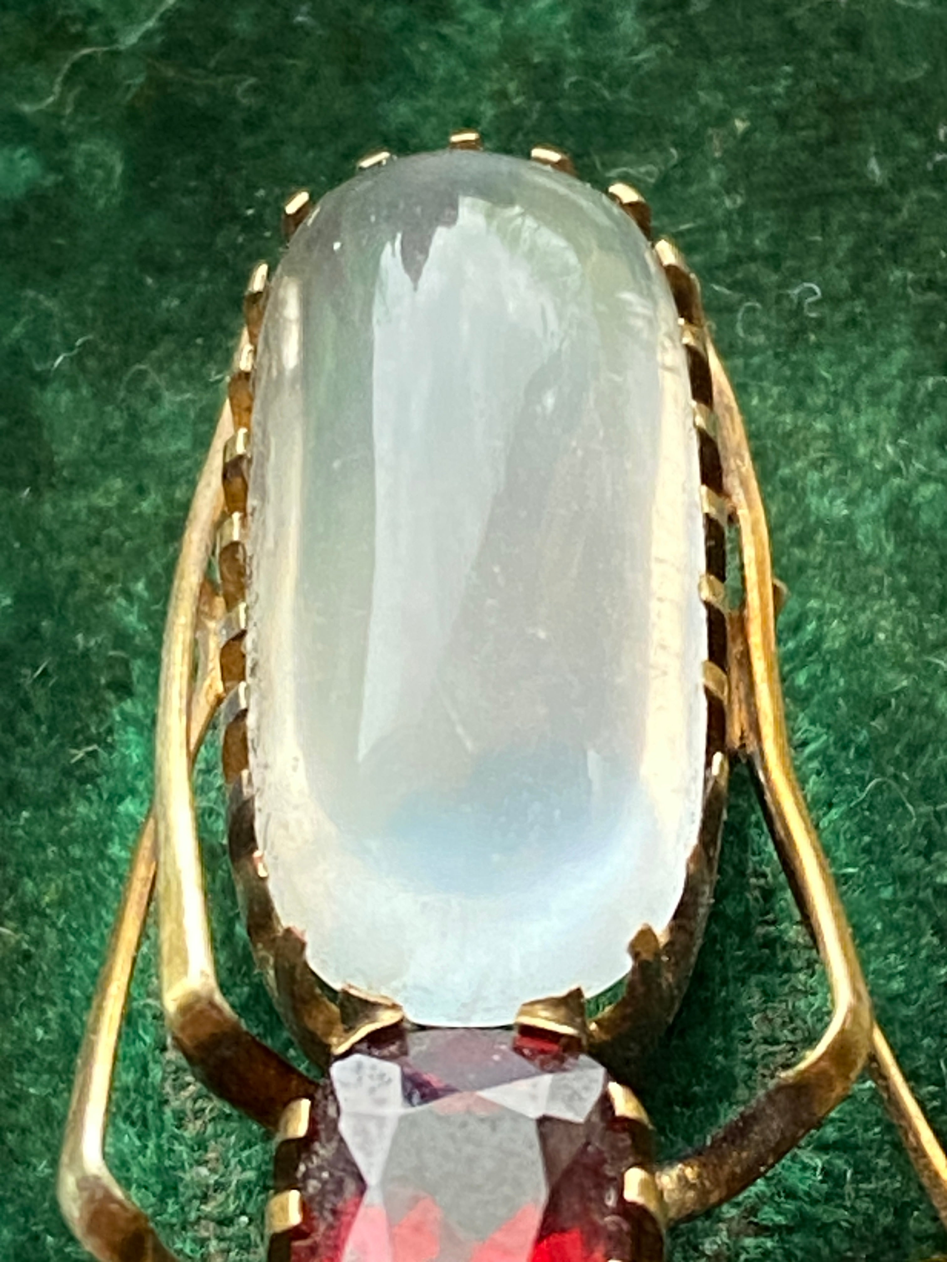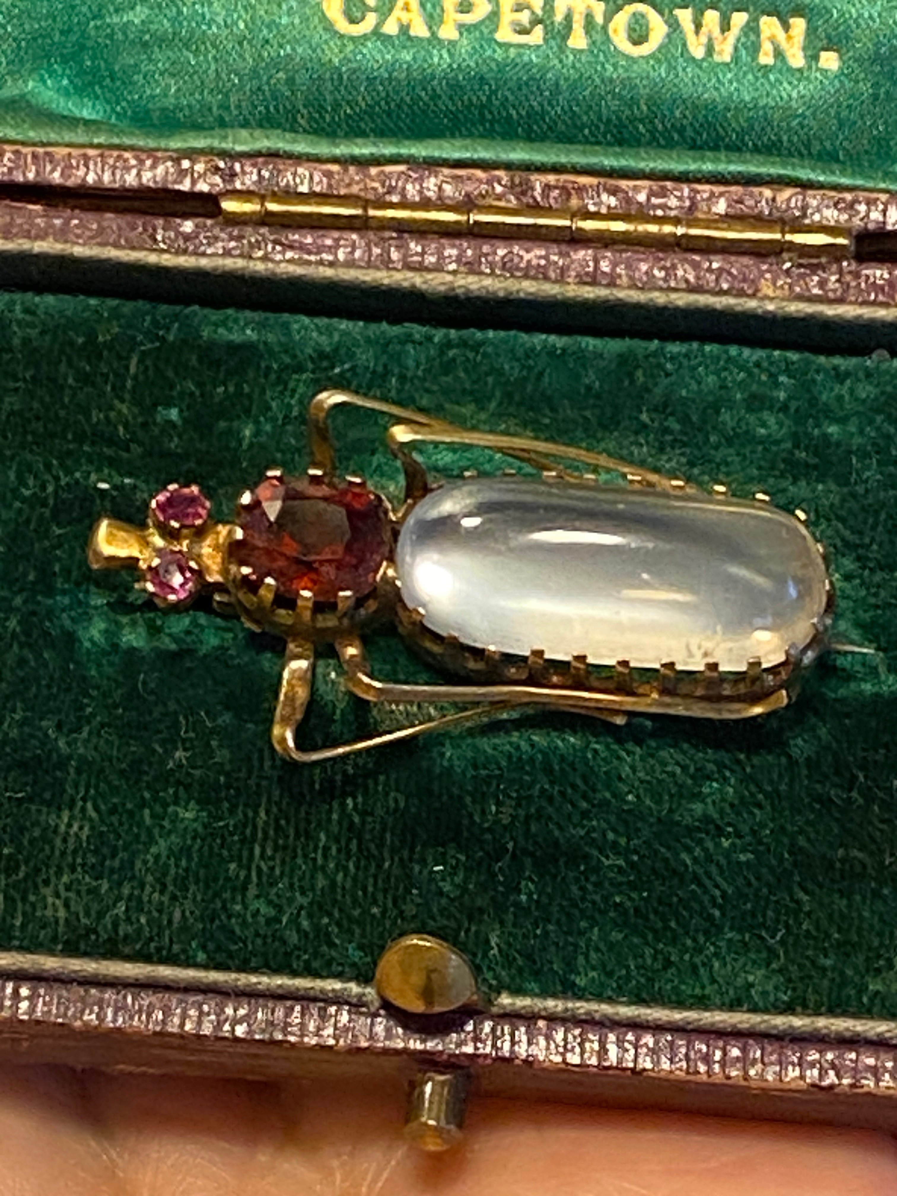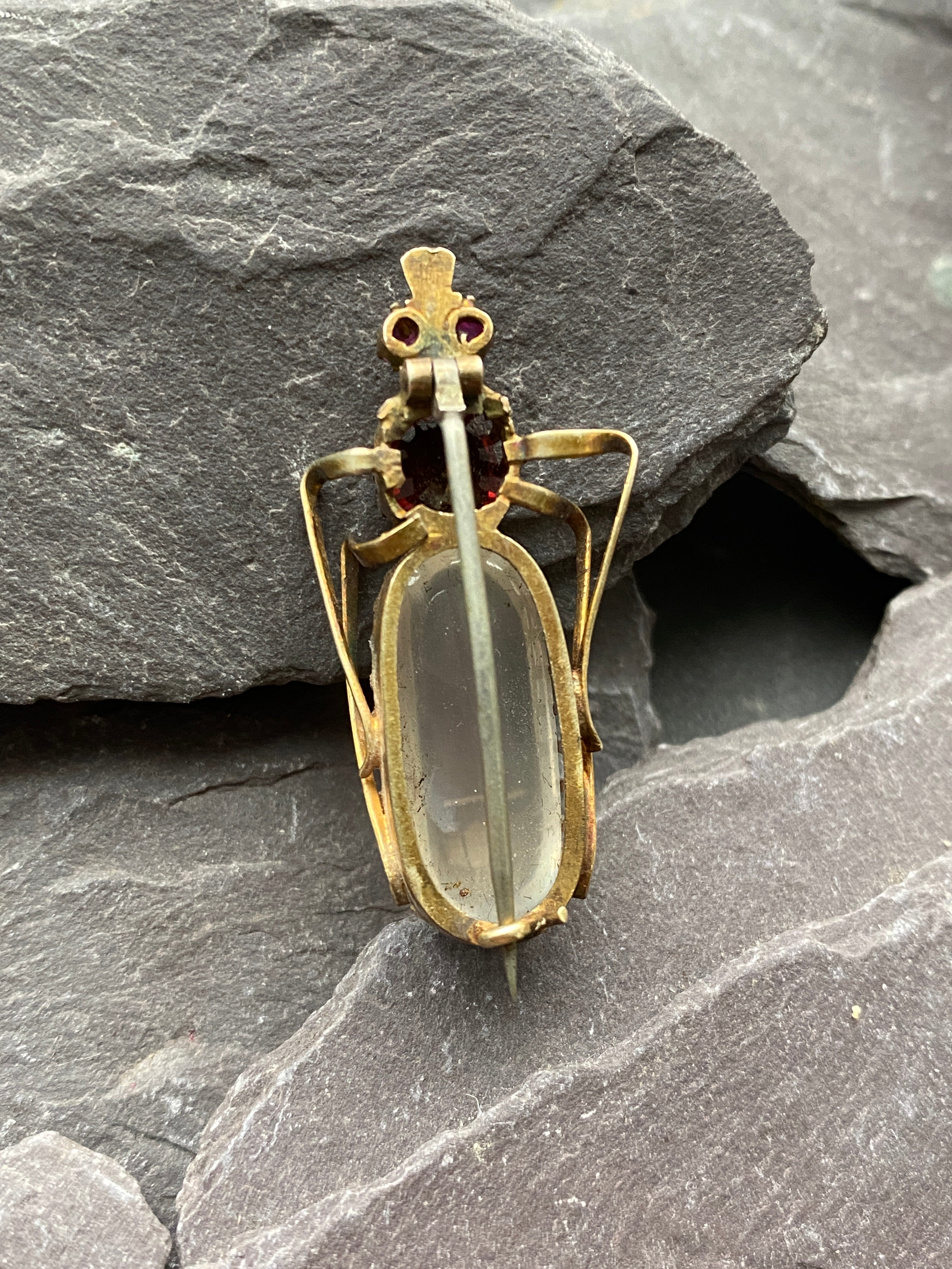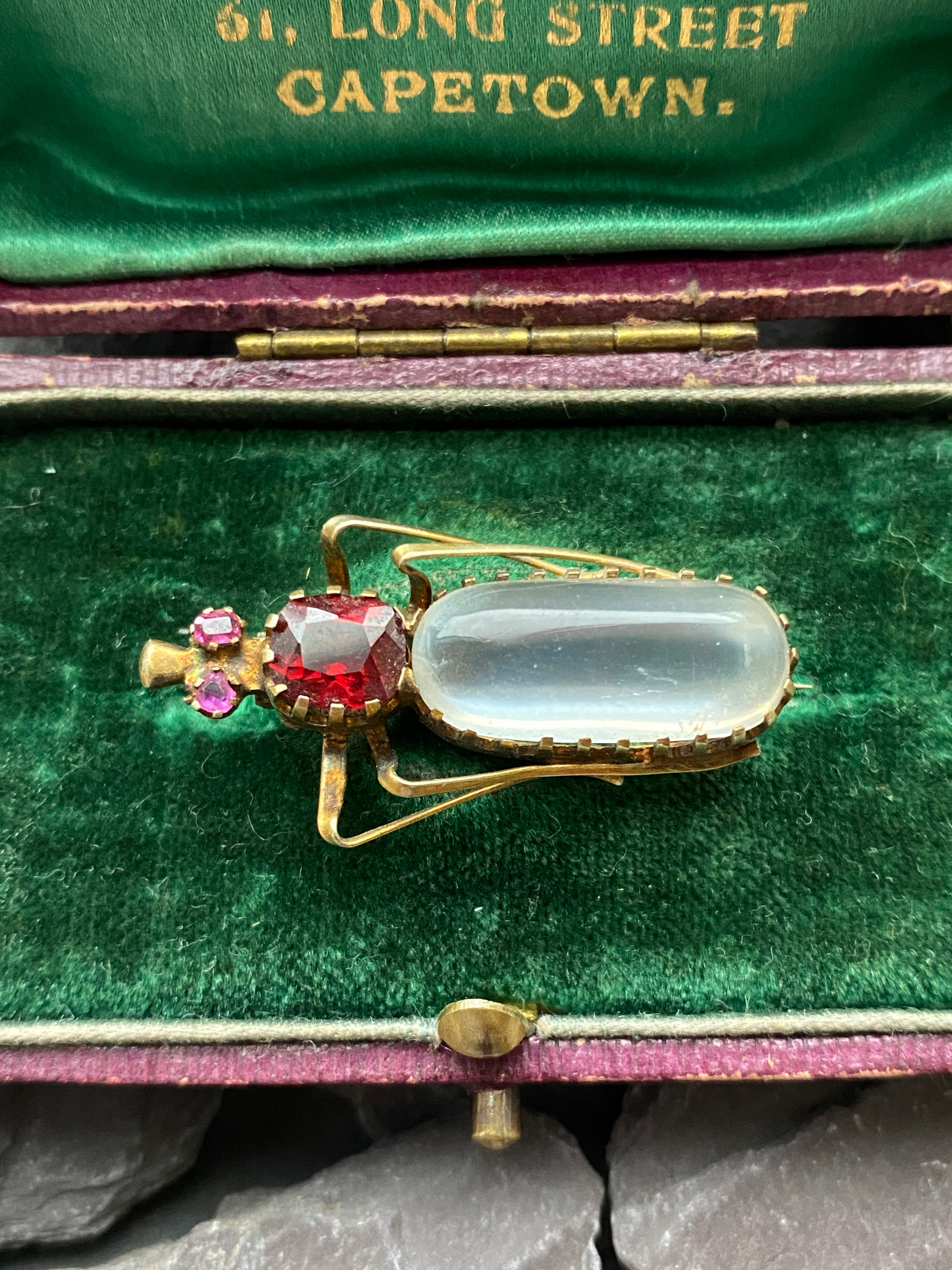 An Antique Victorian 15ct gold brooch set with a large Moonstone cabochon with cushion cut Garnet and Ruby detail.