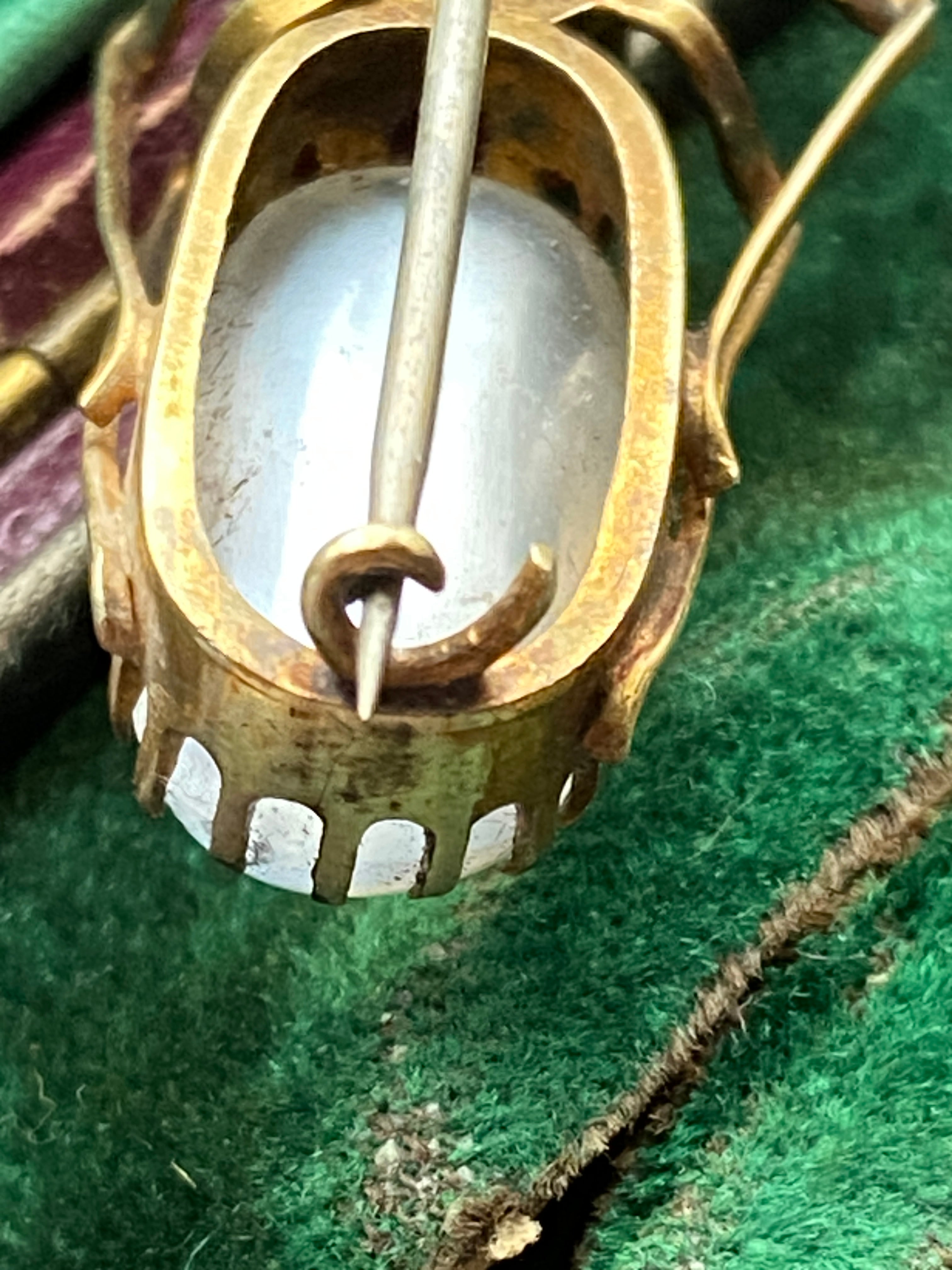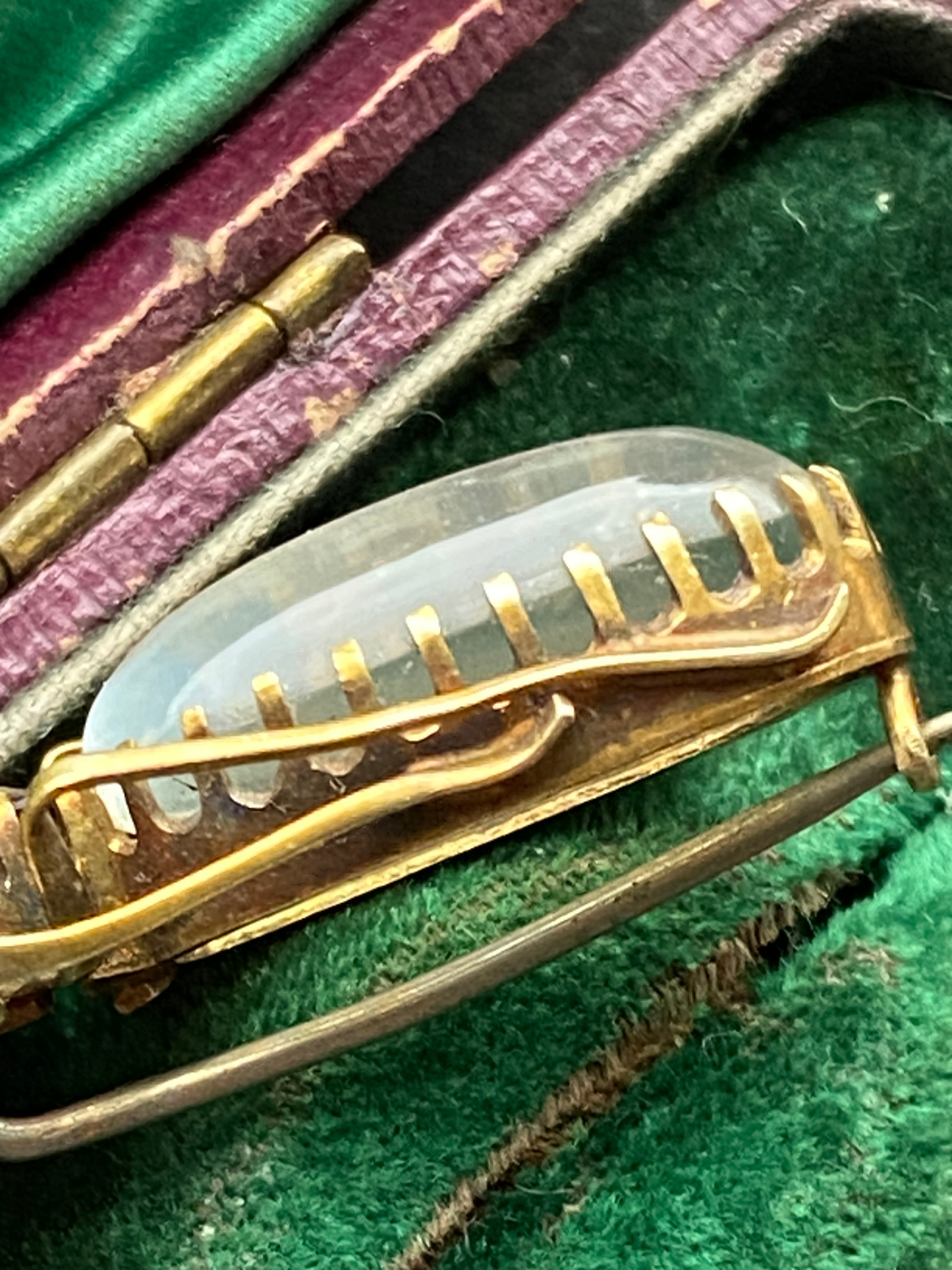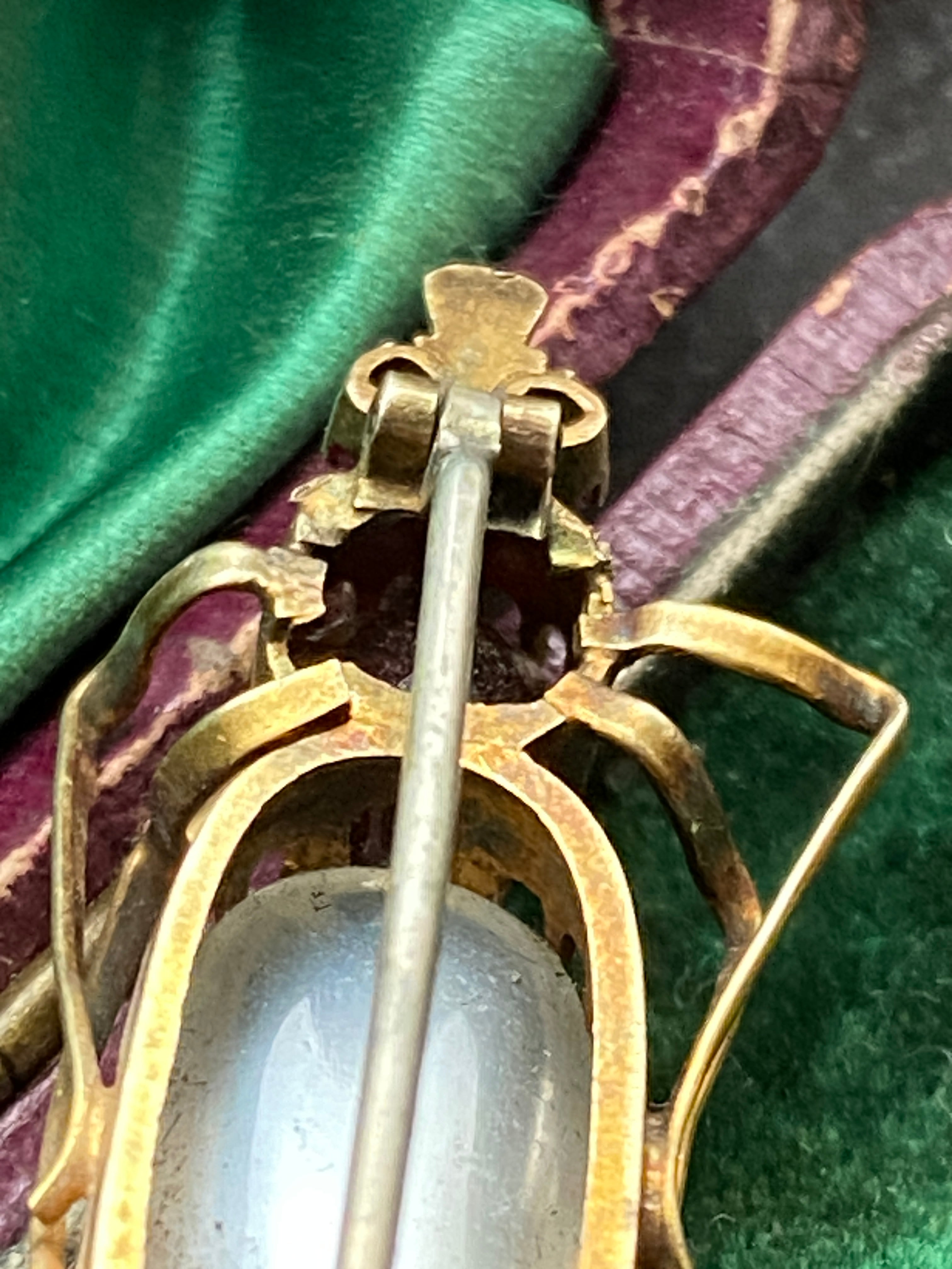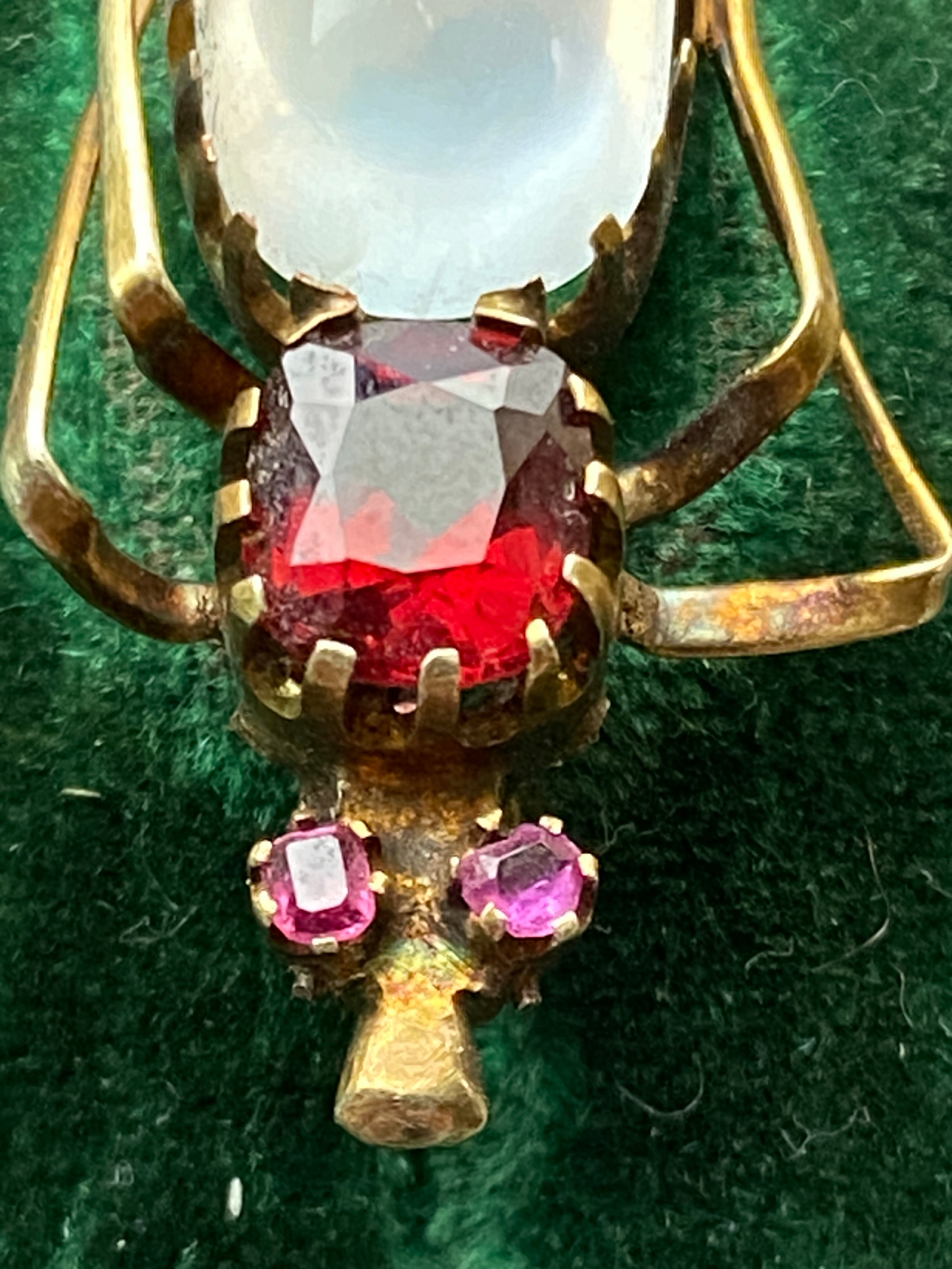 An Antique Victorian 15ct gold brooch set with a large Moonstone cabochon with cushion cut Garnet and Ruby detail.
