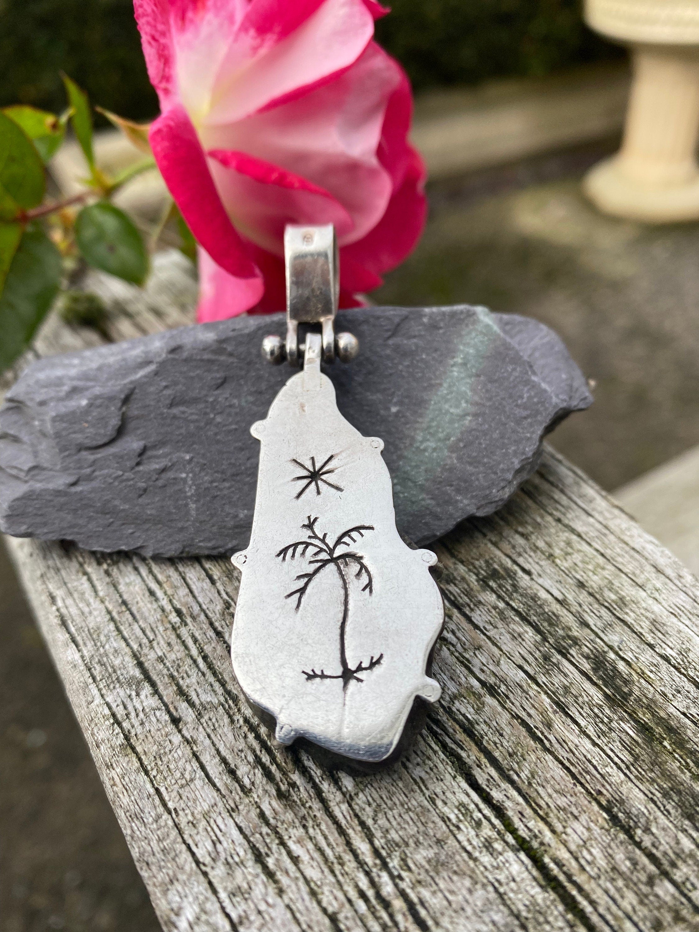 Heavy sterling silver mount depicting a palm tree and a star to the reverse.
