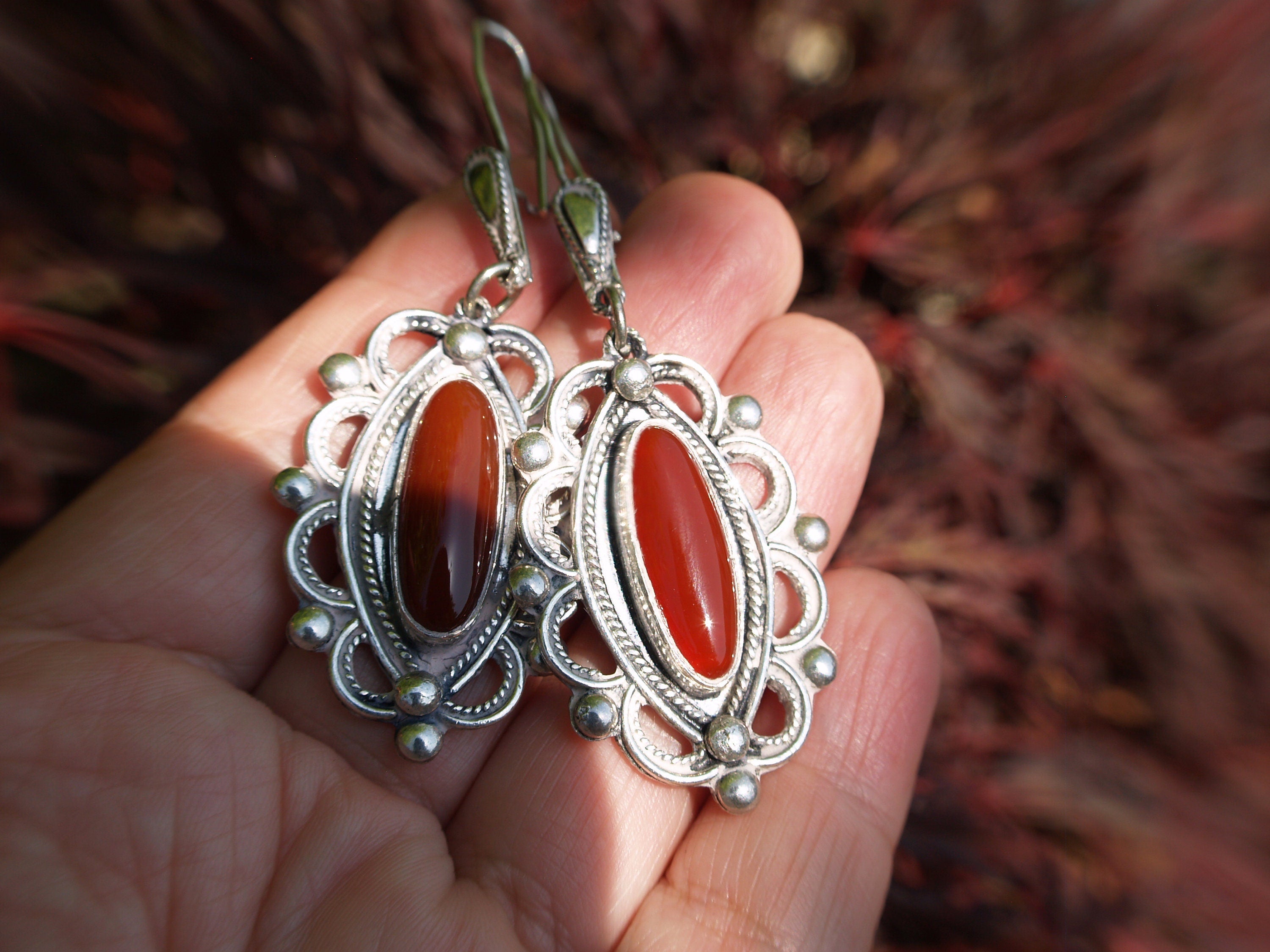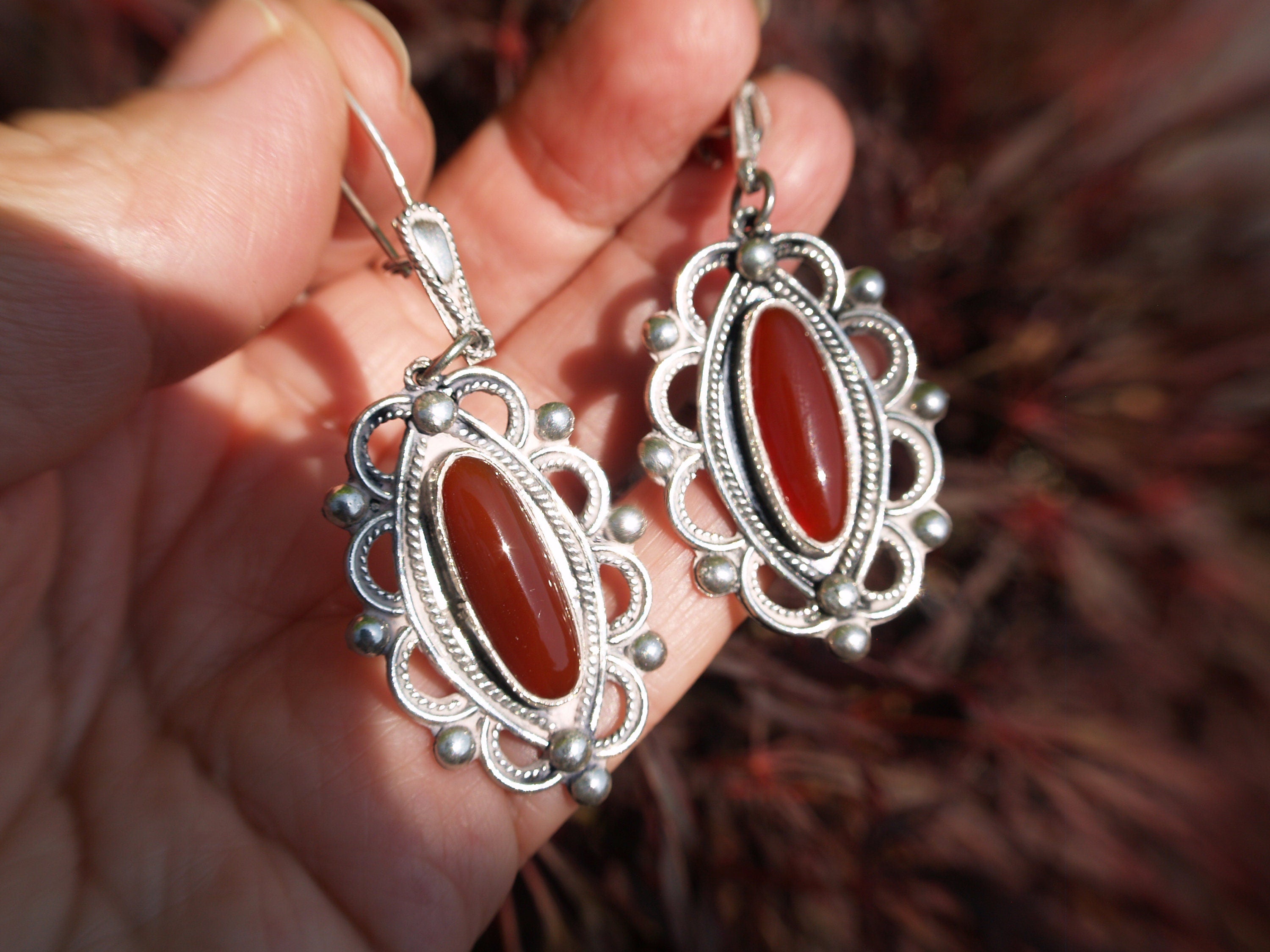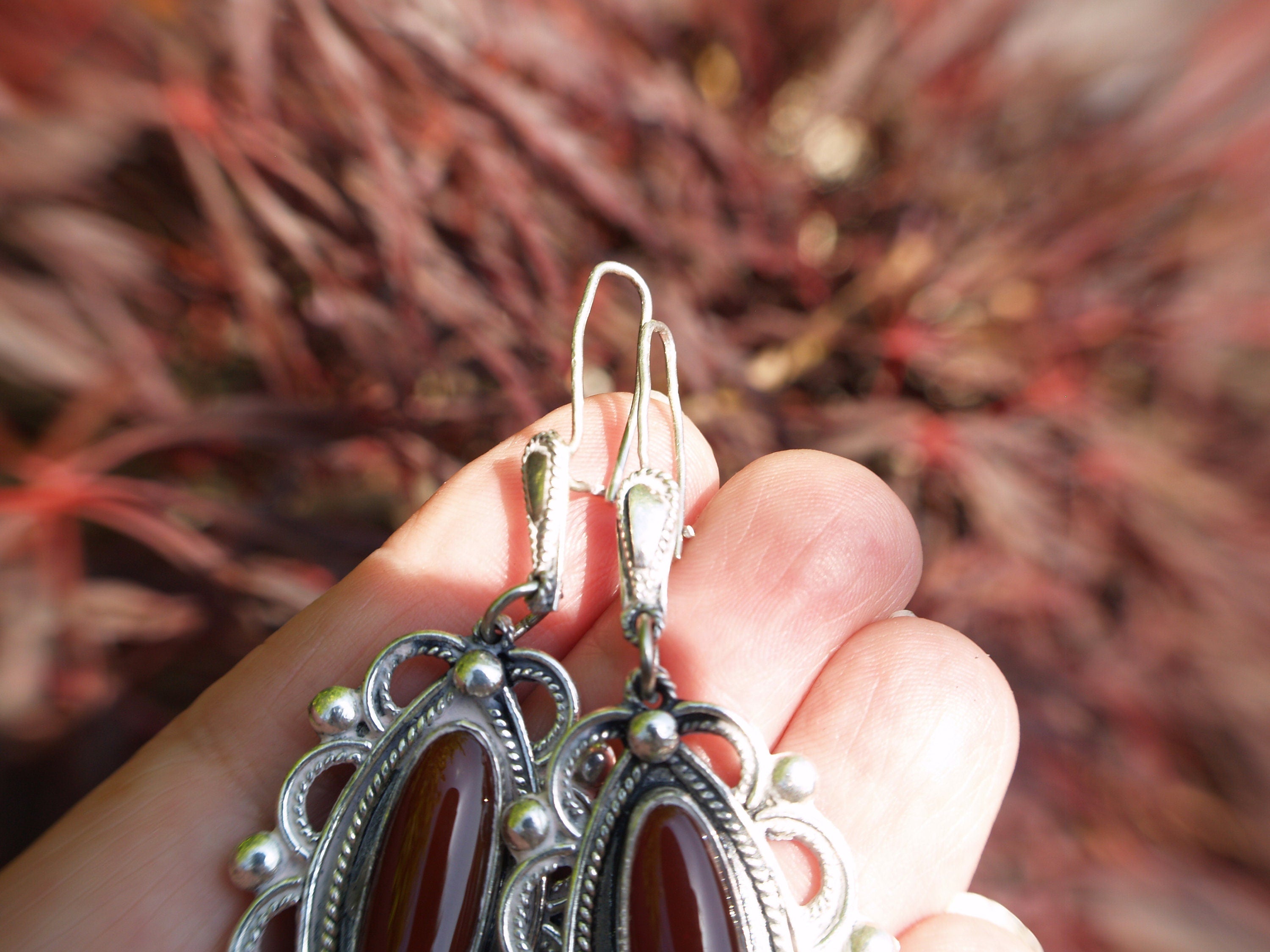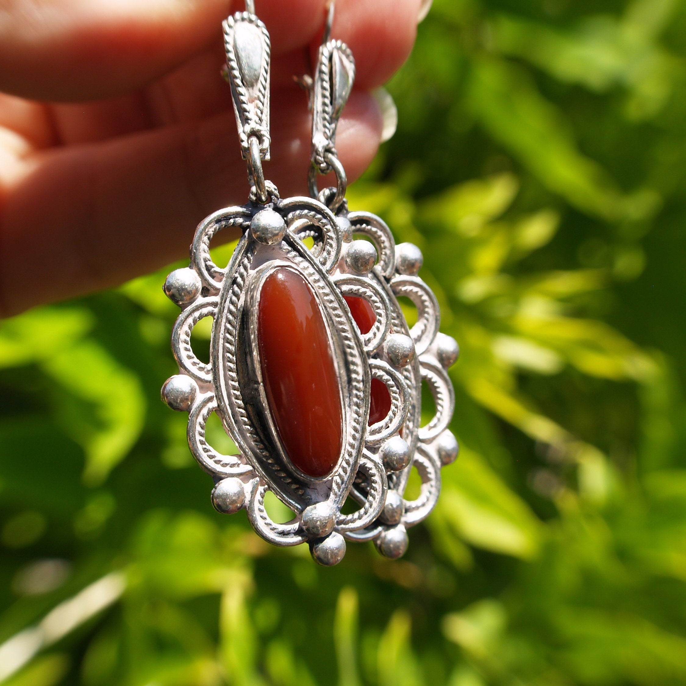 A striking pair of Finnish Designer earrings in sterling silver set with Natural Carnelian.